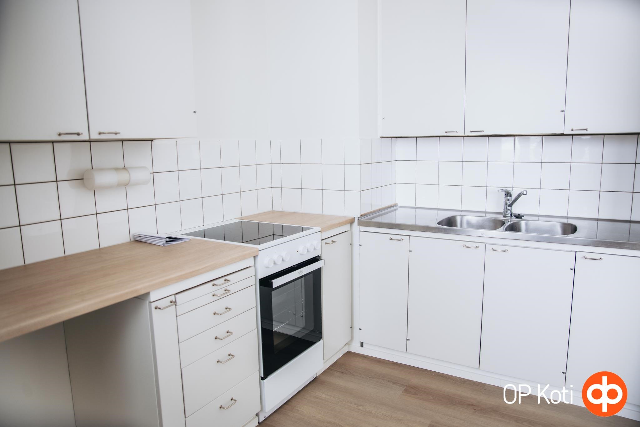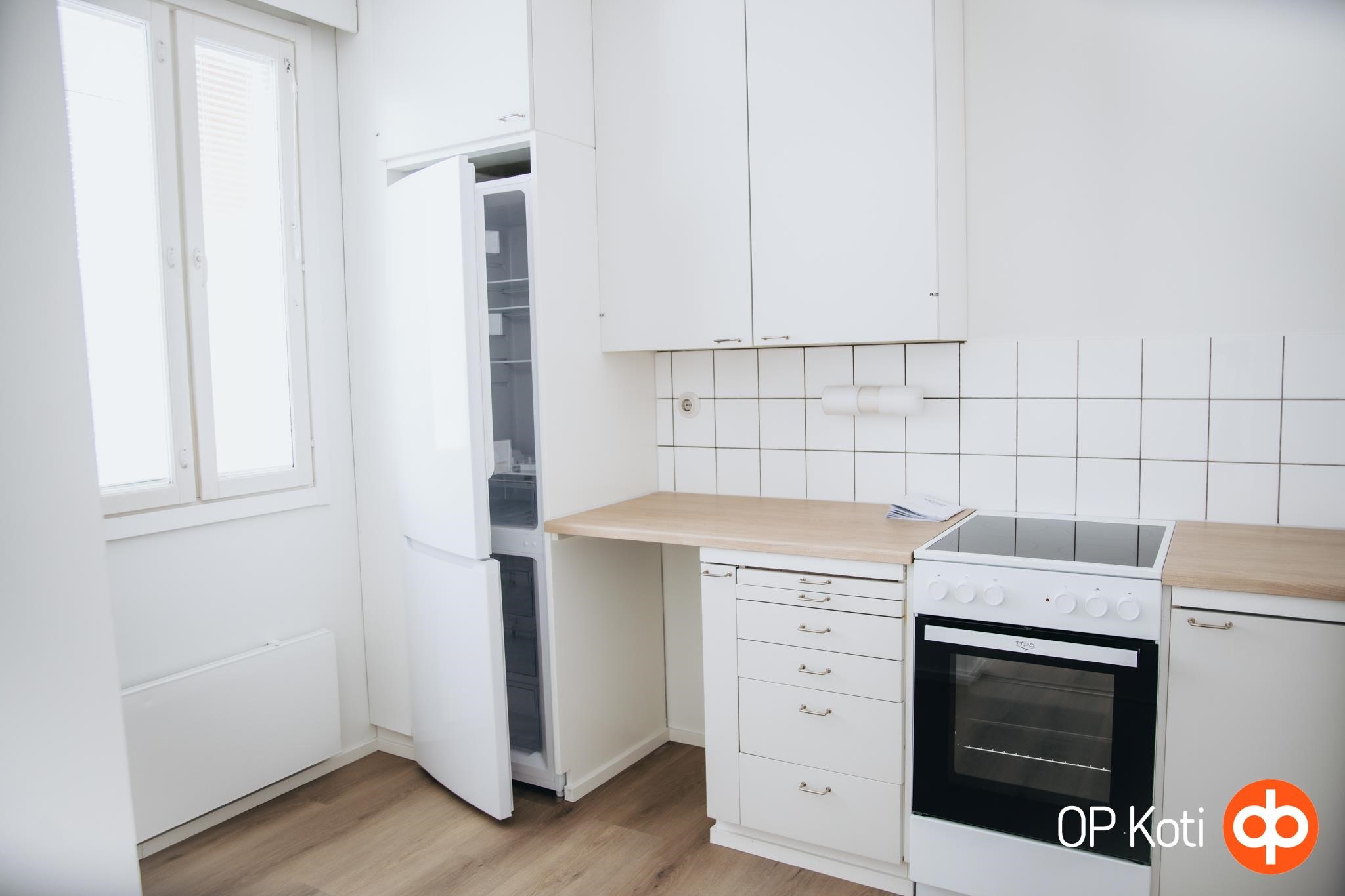 - Jääkaappipakastin, lattialiesi, kaapistot, kiinteät valaisimet.