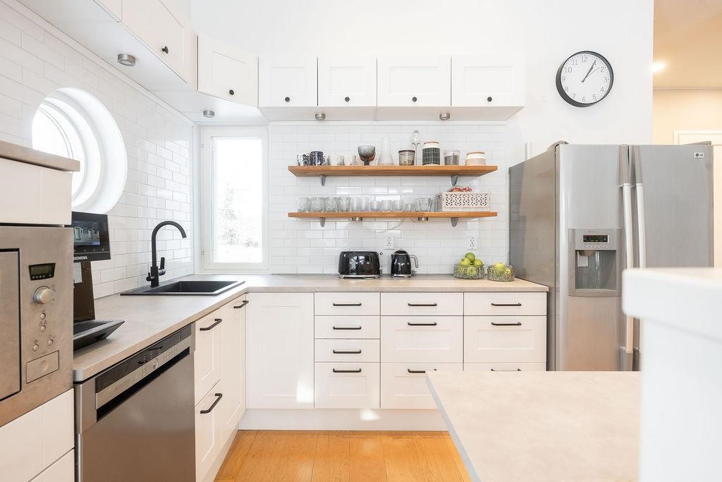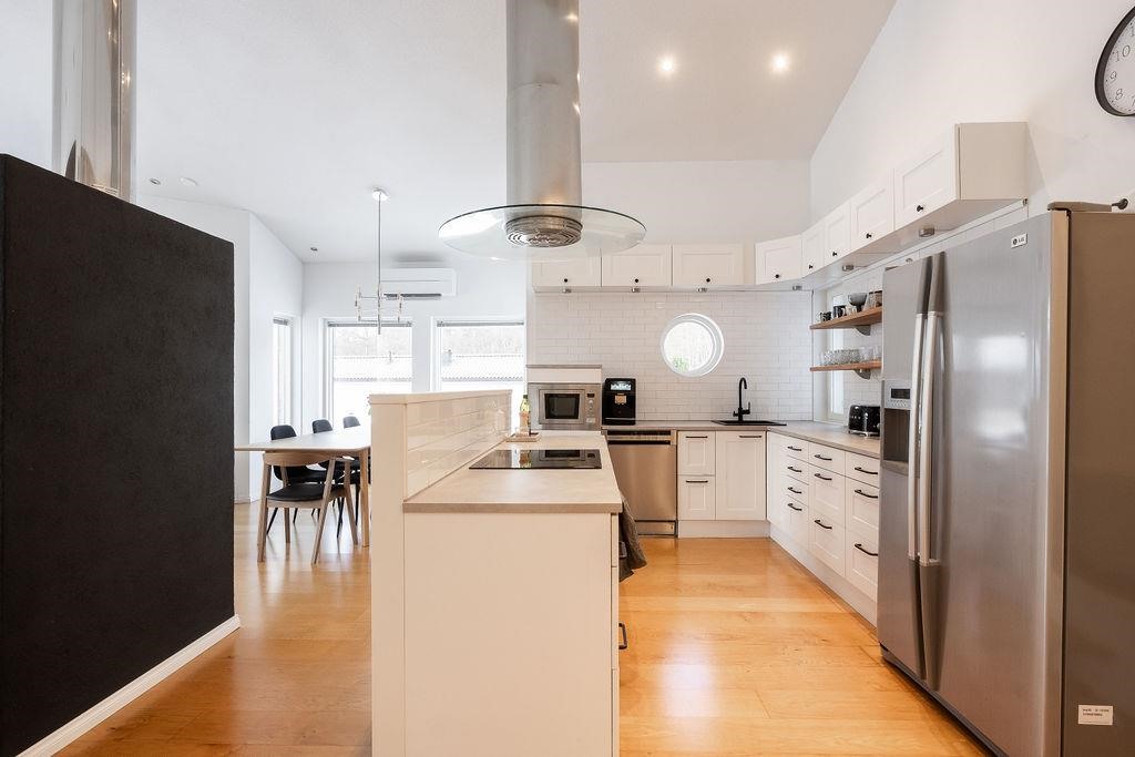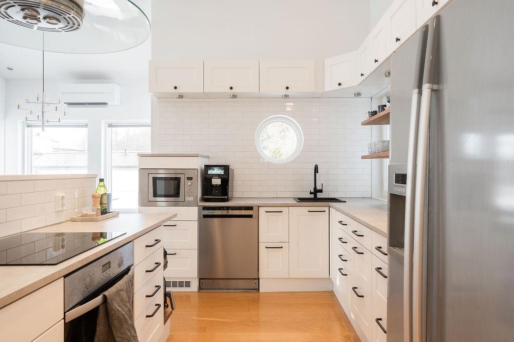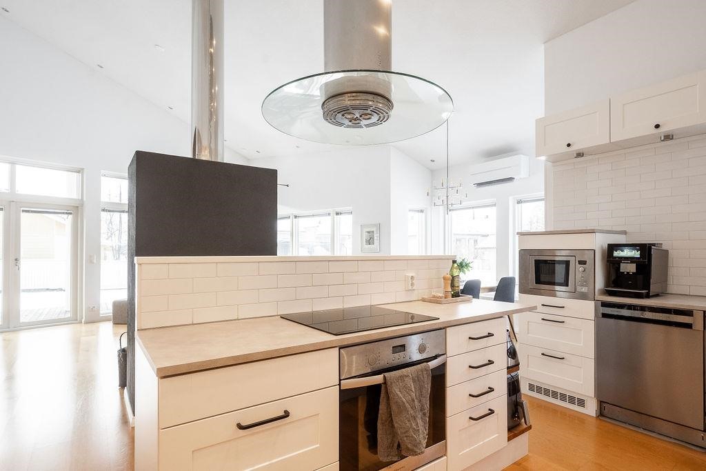 - Vaalea ja valoisa keittiö on saumattomasti yhteydessä olohuoneeseen ja ruokailutilaan. Moderni keittiö tarjoaa runsaasti säilytystilaa ja mahdollistaa sujuvan ruoanlaiton. Varusteluun kuuluvat jääkaappi, jääviileäkaappi, pakastekaappi, erillisuuni ja -induktioliesitaso, liesituuletin, mikroaaltouuni sekä astianpesukone.
