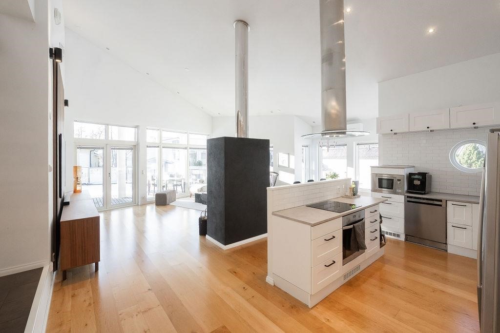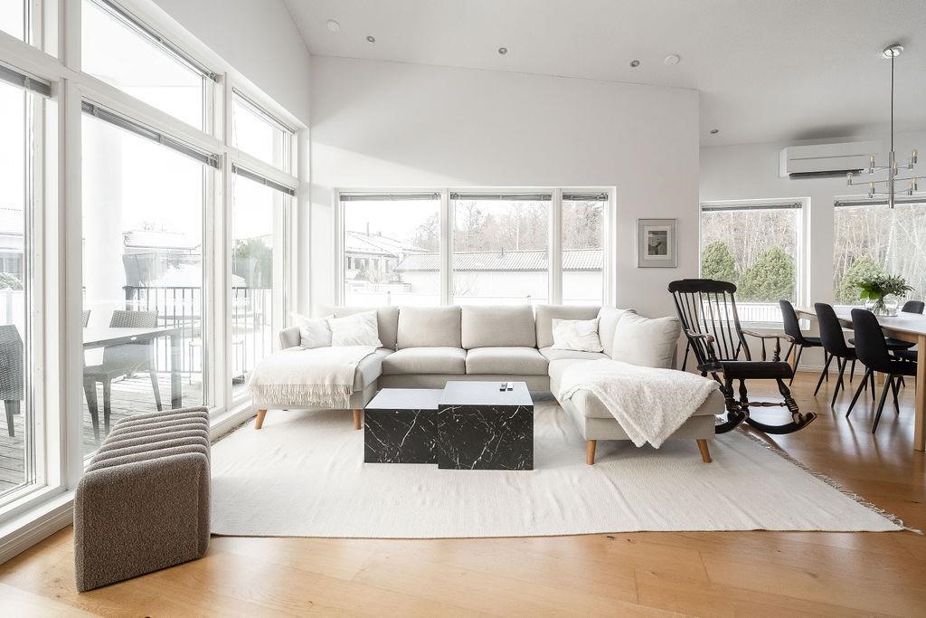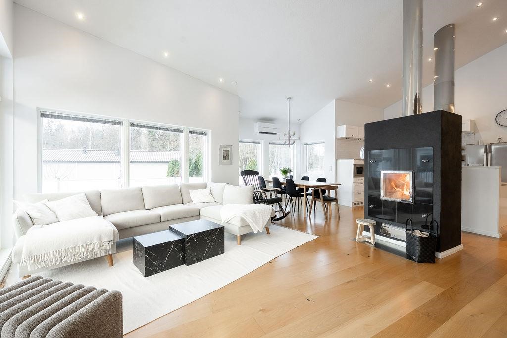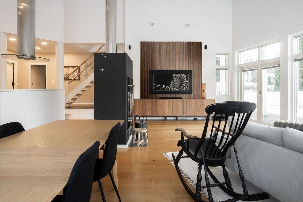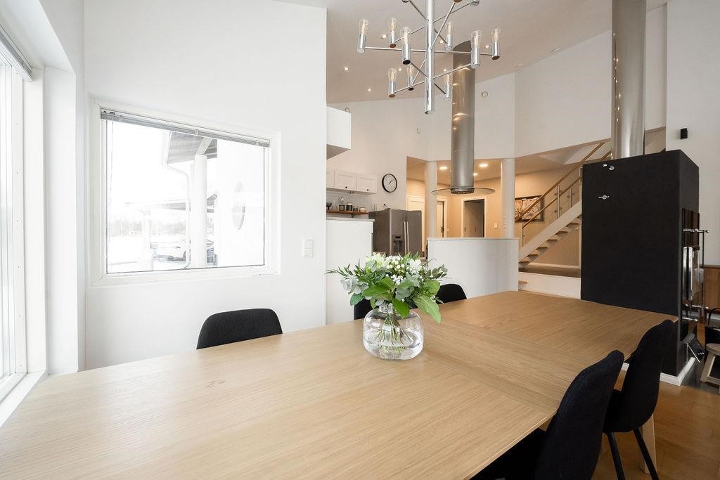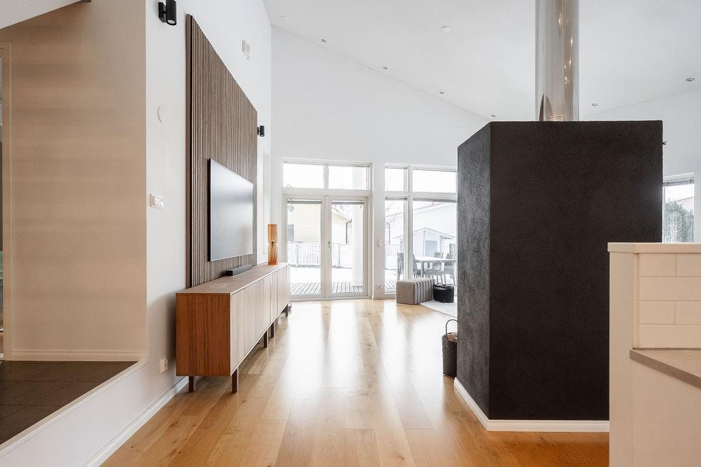 Tervetuloa tutustumaan ainutlaatuiseen arkkitehdin suunnittelemaan kivitaloon Tuomoniemessä - kotiin, jossa avaruus, valo ja käytännöllisyys kohtaavat tyylikkäällä tavalla! Tämä huikean kaunis kokonaisuus hurmaa jo ensi silmäyksellä: harjakorkeuteen asti nouseva tila ja suuret ikkunat tuovat luonnonvalon osaksi jokaista päivää, ja varaava takka luo kodikasta tunnelmaa yhdistäen olohuoneen, keittiön ja ruokailutilan saumattomasti yhteen.