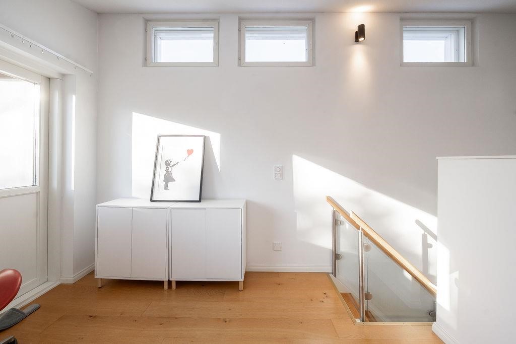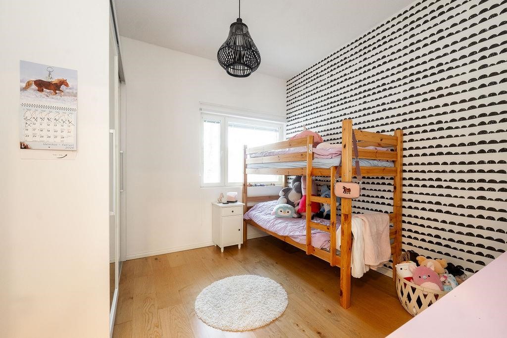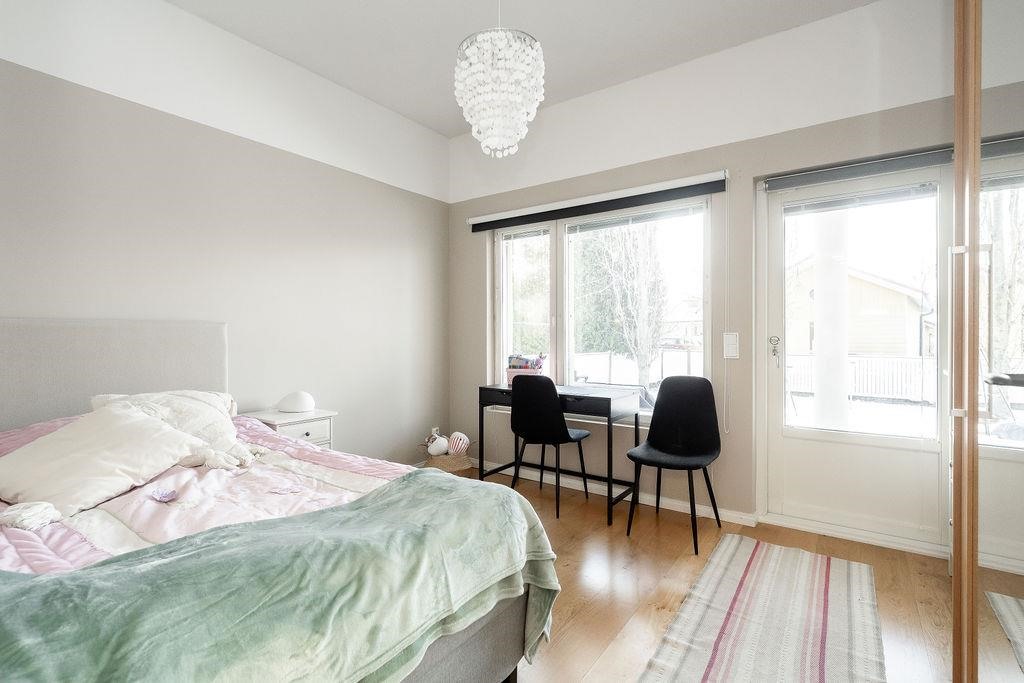Alakerrassa sijaitsee kolme tilavaa makuuhuonetta, joissa jokaisessa on tilaa niin levolle kuin arjen toiminnoille. Yläkerran parvihuone tarjoaa joustavuutta esimerkiksi työskentely- tai vierastilaksi. Kauniina yksityiskohtana pyöreät ikkunat tuovat kodikkuutta ja valoa keittiöön sekä yläkertaan.