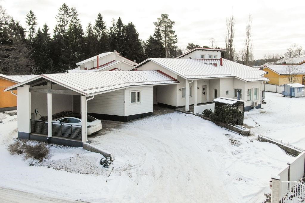 Kodin yhteydessä on kahden auton katos sekä kaksi erillistä varastotilaa - lämmin ja kylmä - jotka tarjoavat runsaasti säilytystilaa arjen tarpeisiin.