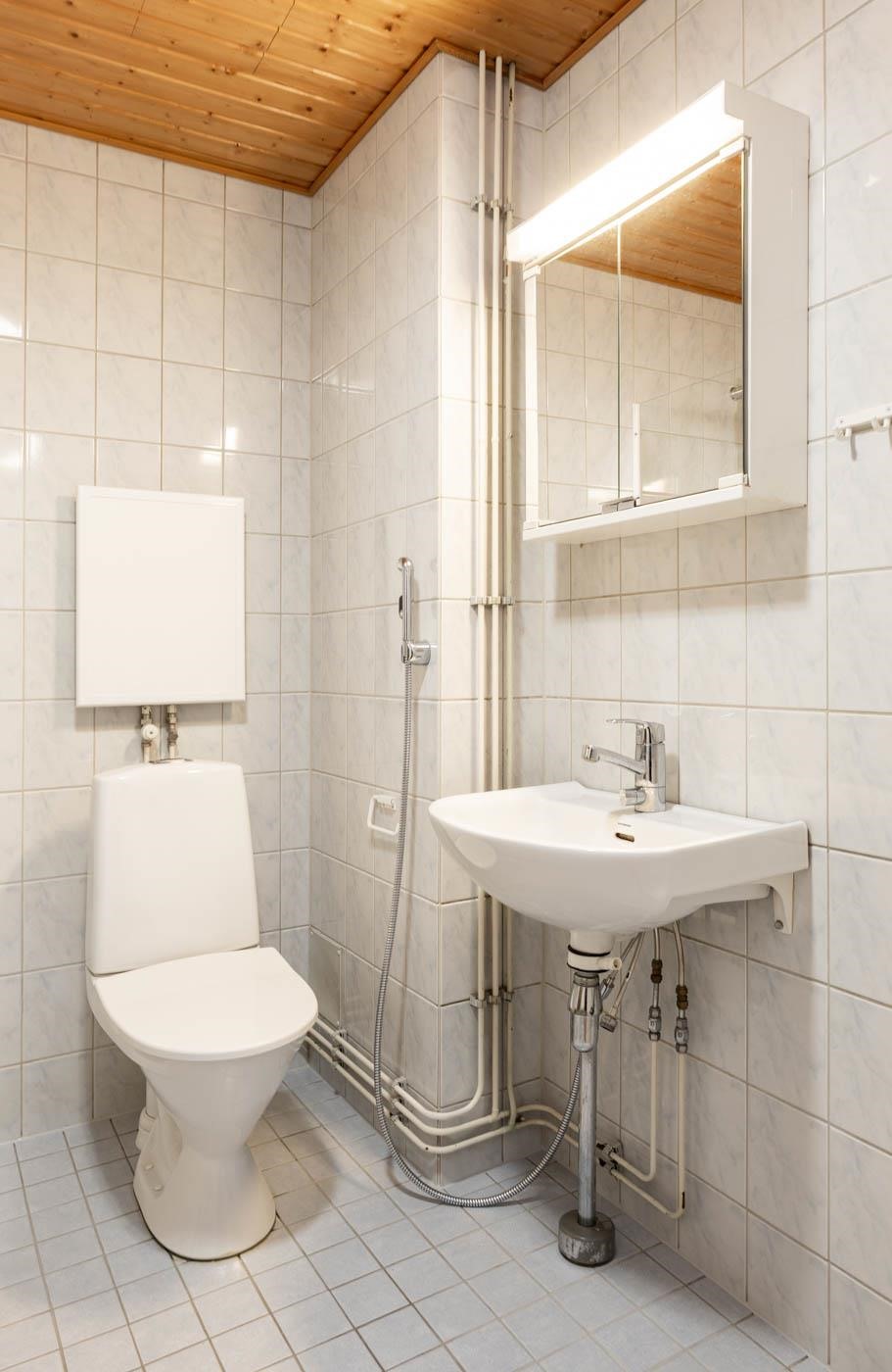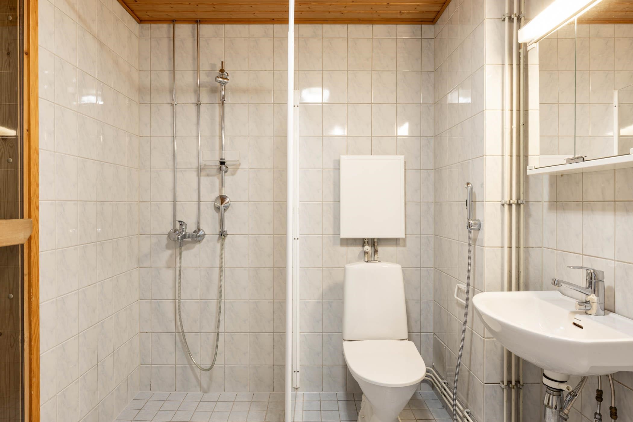 - Kylpyhuoneessa on suihku, suihkuseinä, pesukoneliitäntä, peilikaappi sekä kaapisto. Saunassa on sähkökiuas.