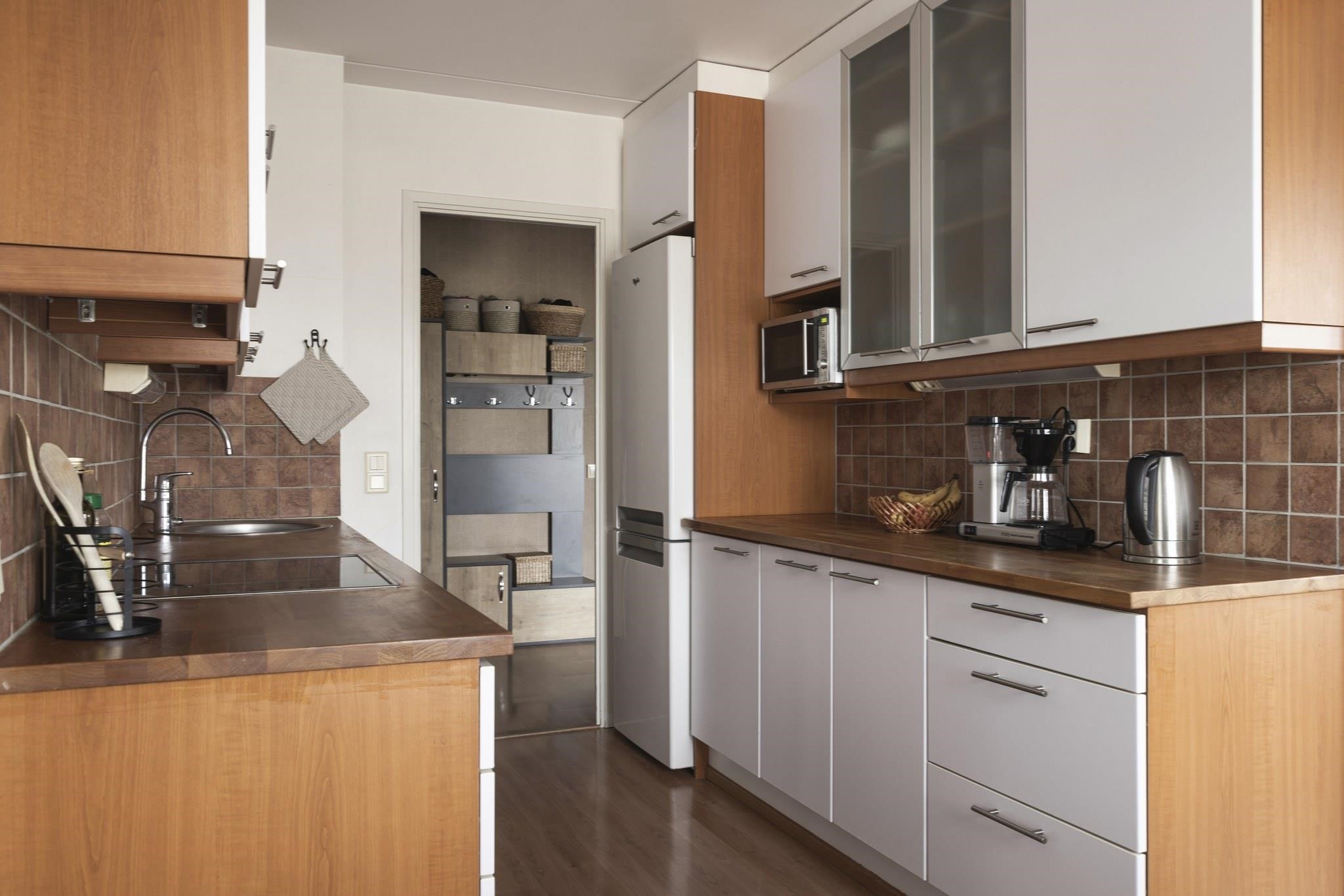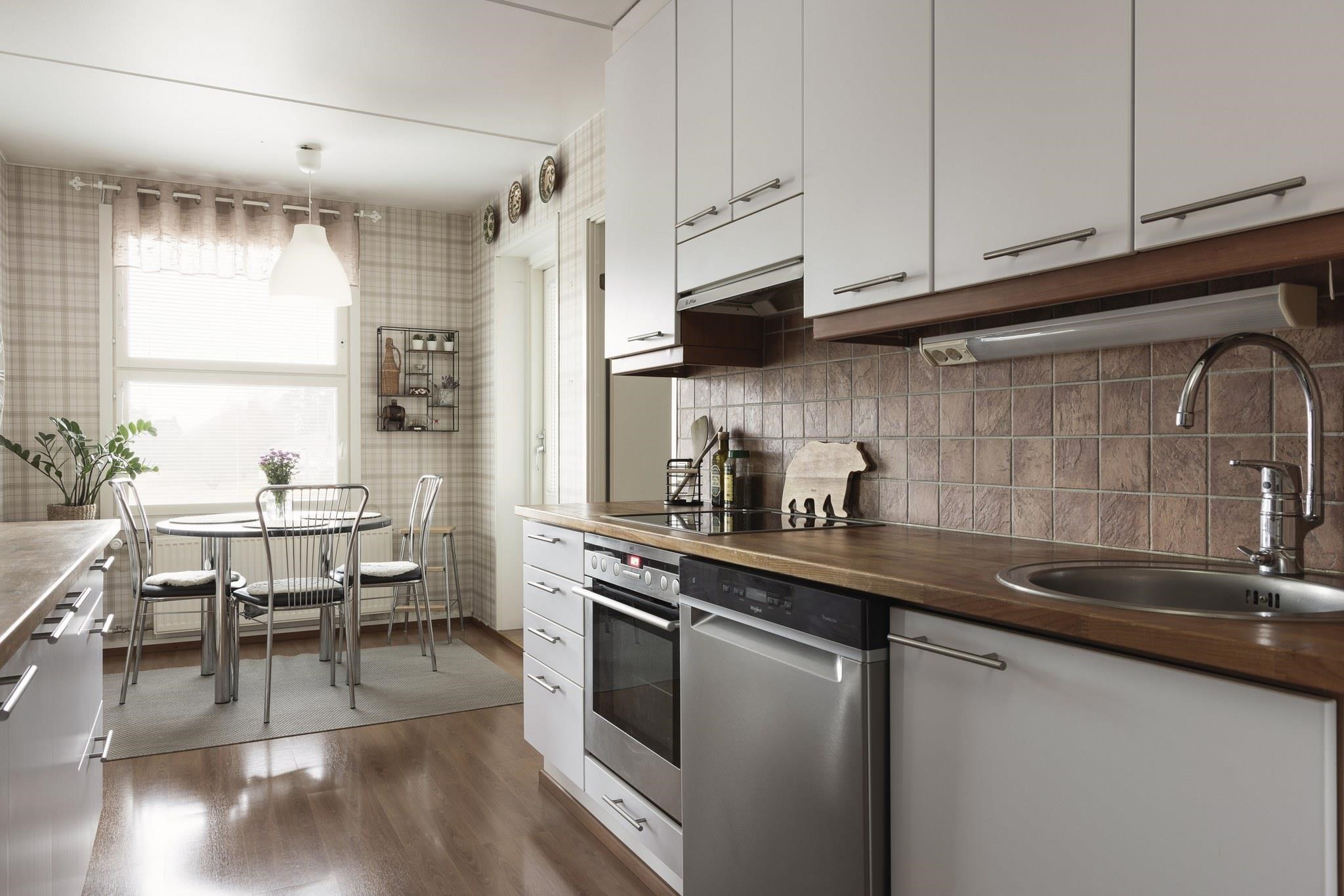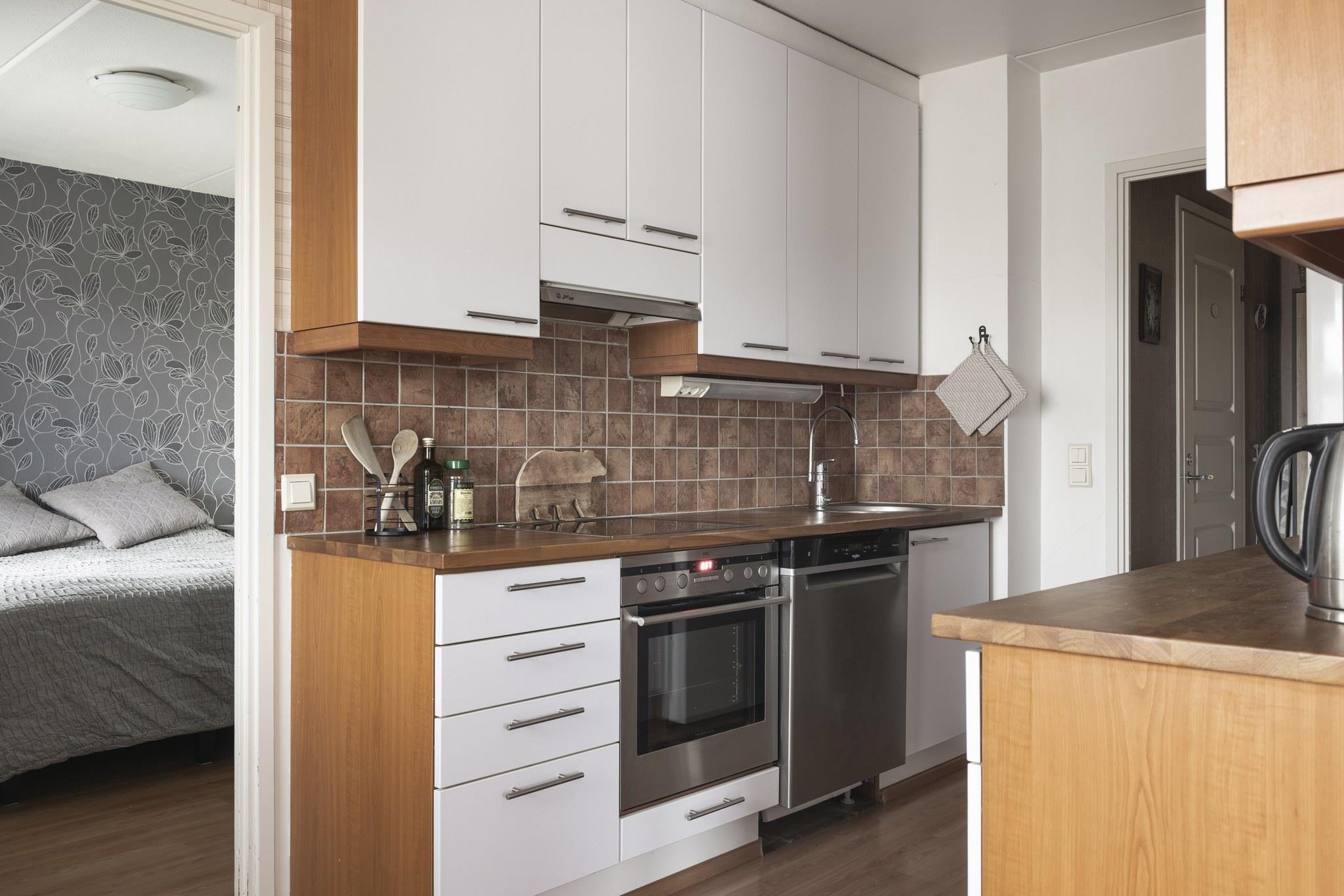 - Jääkaappipakastin, erillisuuni, sähköliesi, keraaminen liesi, liesituuletin, astianpesukone, kaapistot.