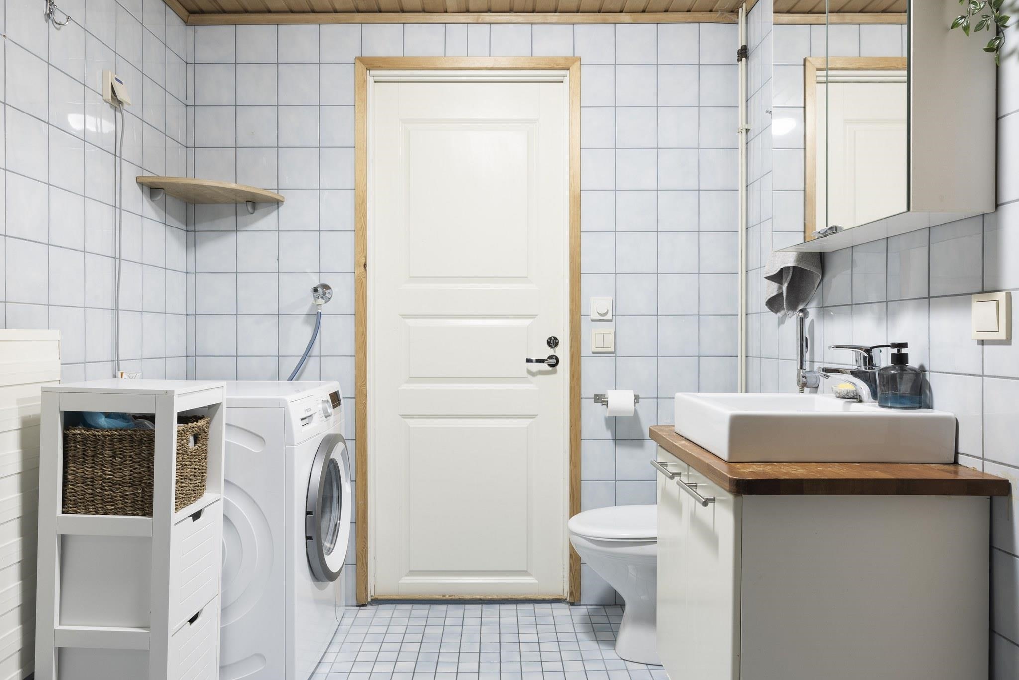 - Sauna, sähkökiuas, kylpyhuone, suihku, peilit, peilikaappi, kaapit, pesukoneliitäntä, lattialämmitys.