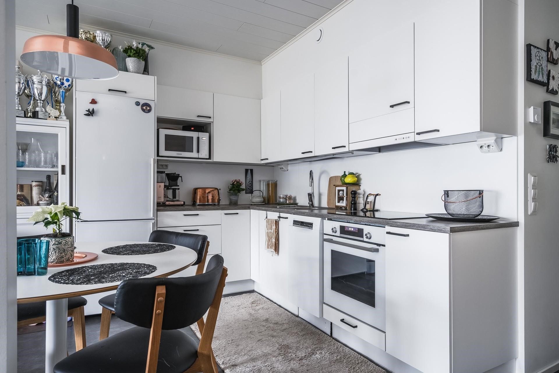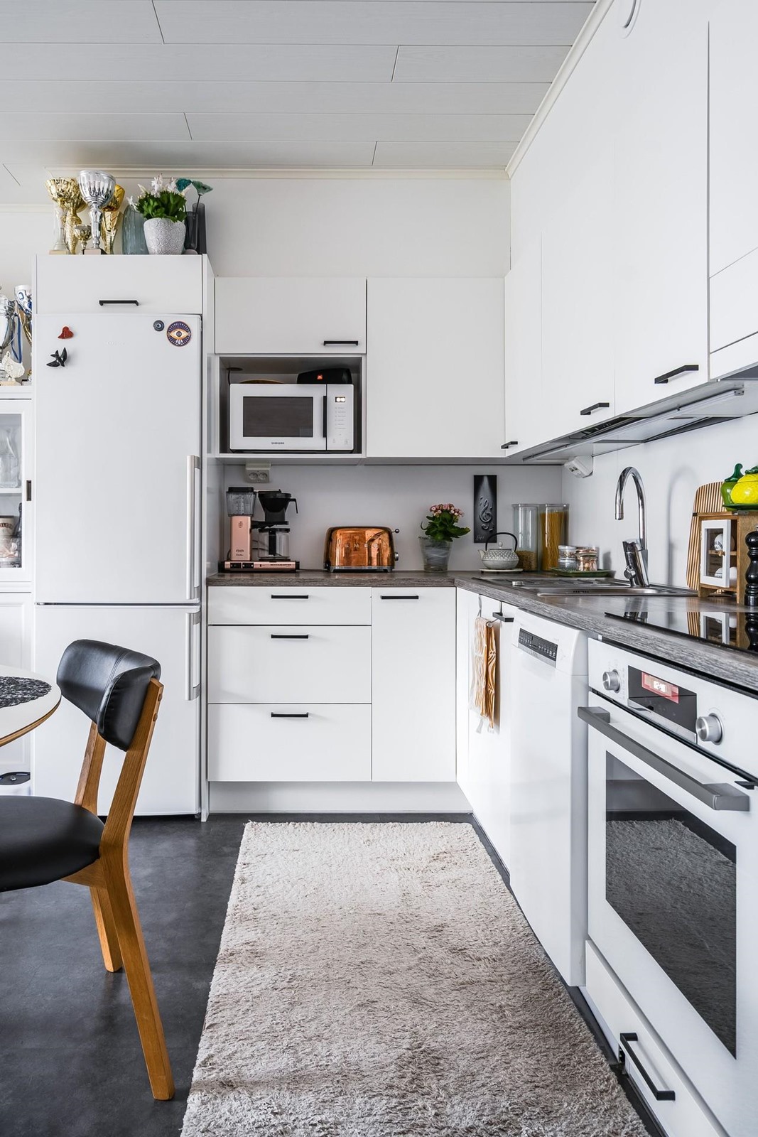 - Jääkaappipakastin, induktiotaso, kieroilmauuni, astianpesukone, liesituuletin, kaapistot.