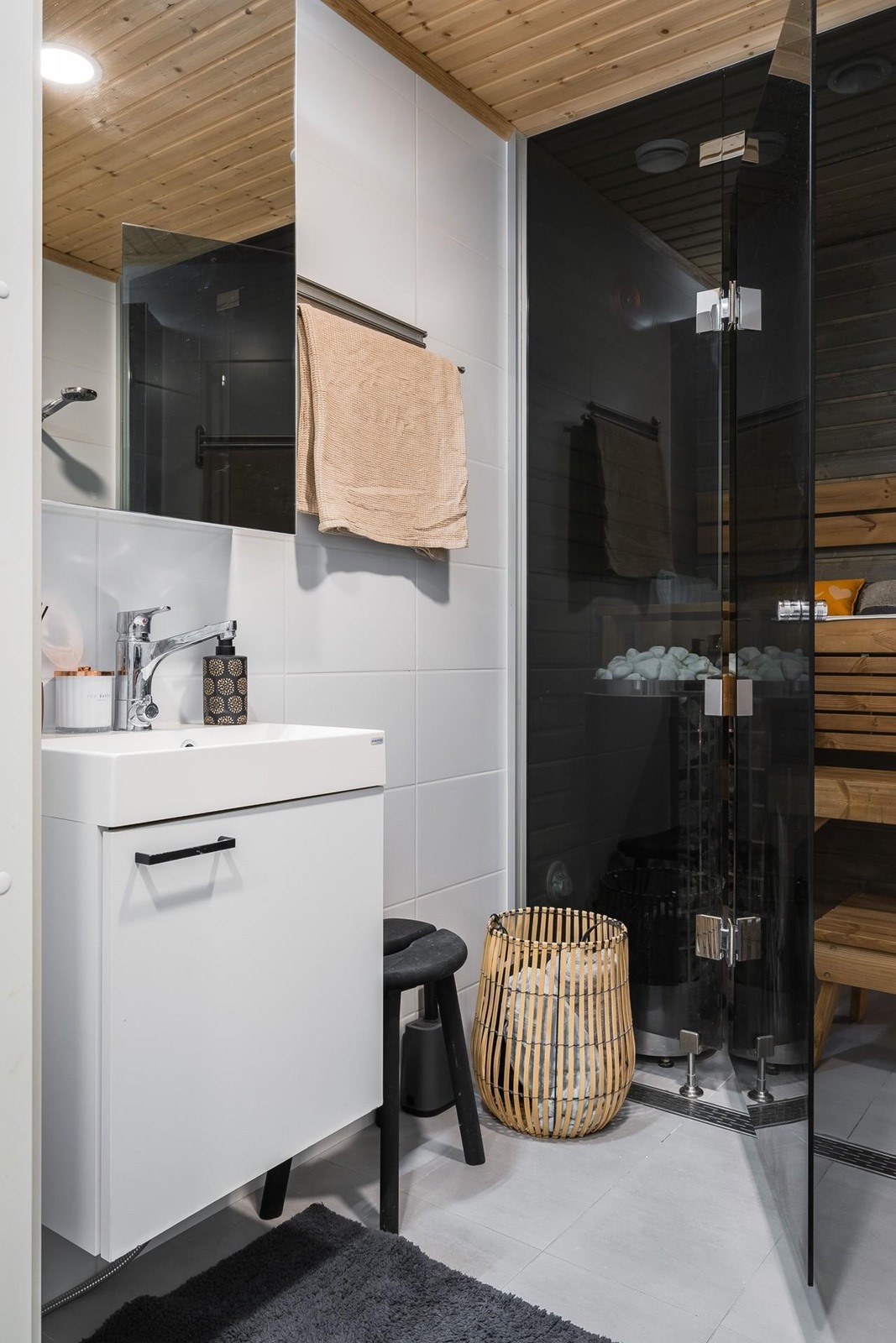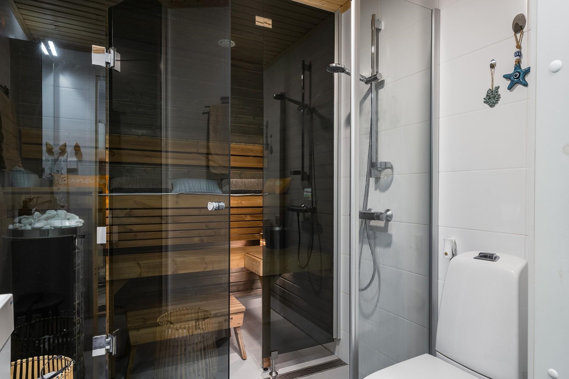 - Sauna, sähkökiuas, wc, suihku, suihkuseinä, peilikaappi,allaskaappi, pesukoneliitäntä erillisessä kaapissa, lattialämmitys, kiinteät valaisimet.