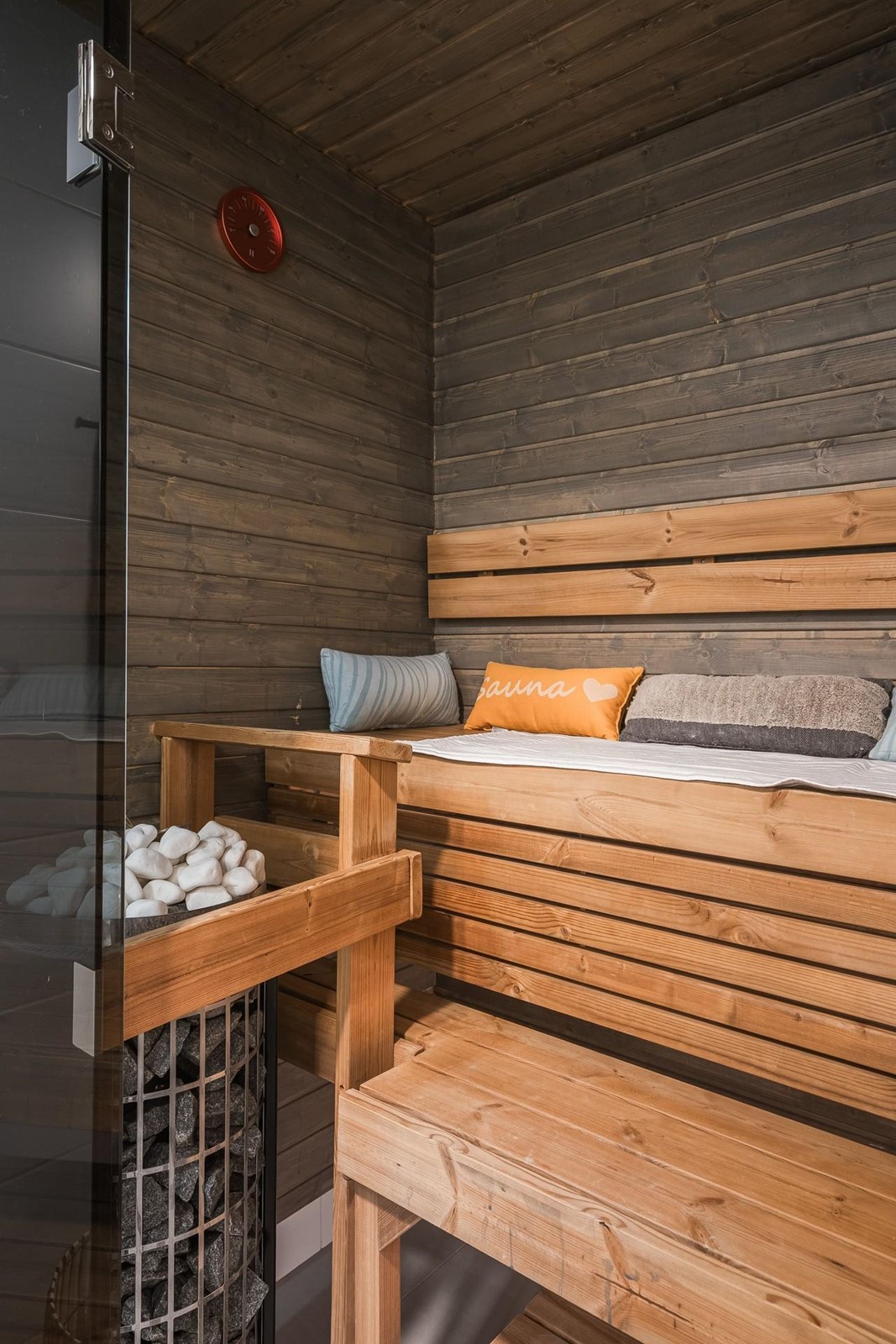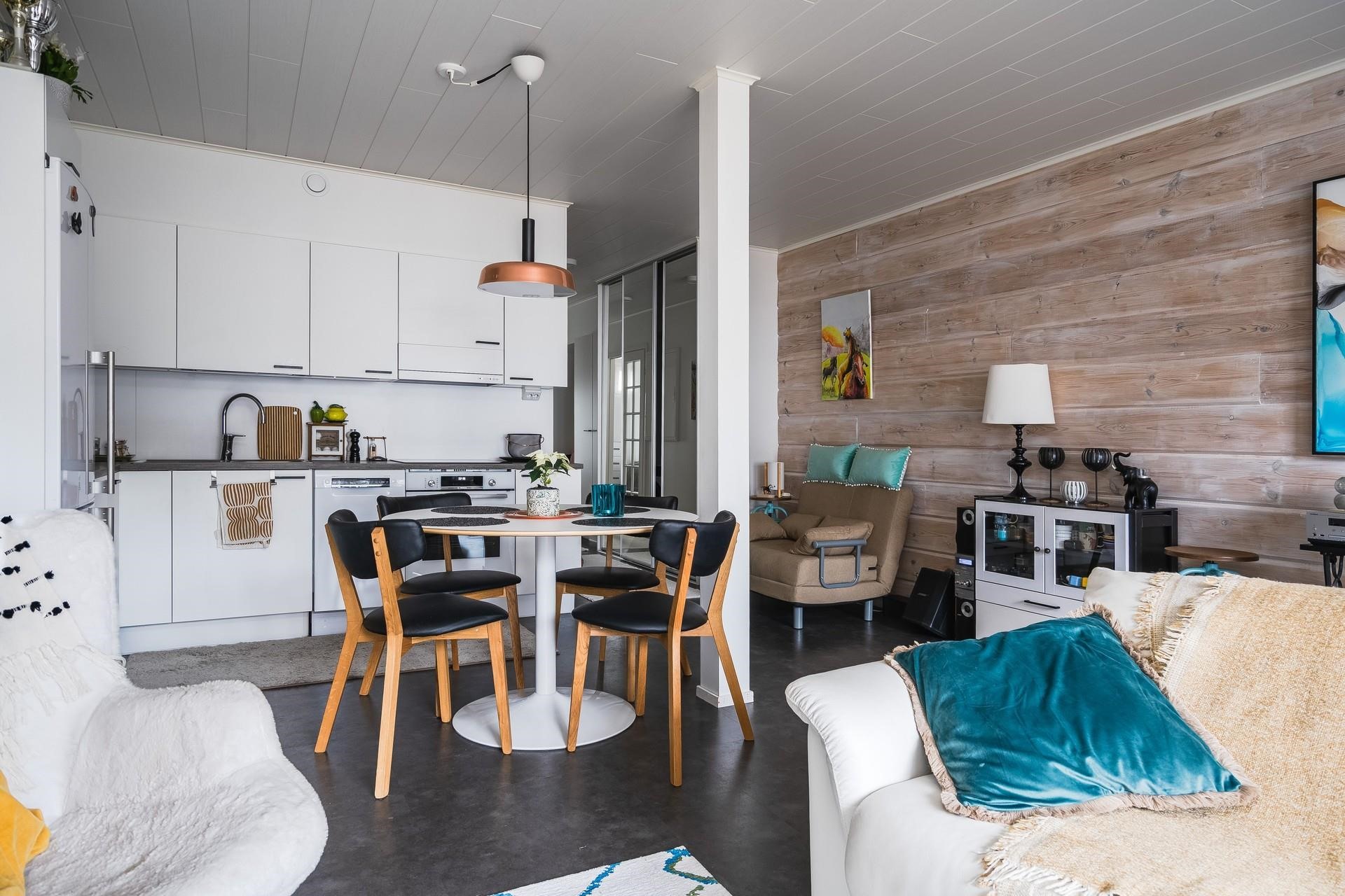 Olohuoneessa katseenvangitsijana toimii kaunis hirsiseinä, joka tuo lämpöä ja tunnelmaa tilaan. Asunnossa on lisäksi iso lasitettu parveke, jossa on mukava rentoutua tai vilvoitella makoisten löylyjen jälkeen.