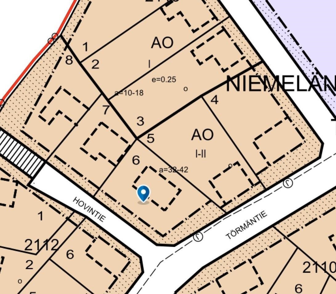 - AO I-II, omakotirakennusten ja muiden enintään kahden perheen talojen korttelialue. Kaavan mukainen tehokkuusluku e=0,25. Kattokaltevuus a=32-42.