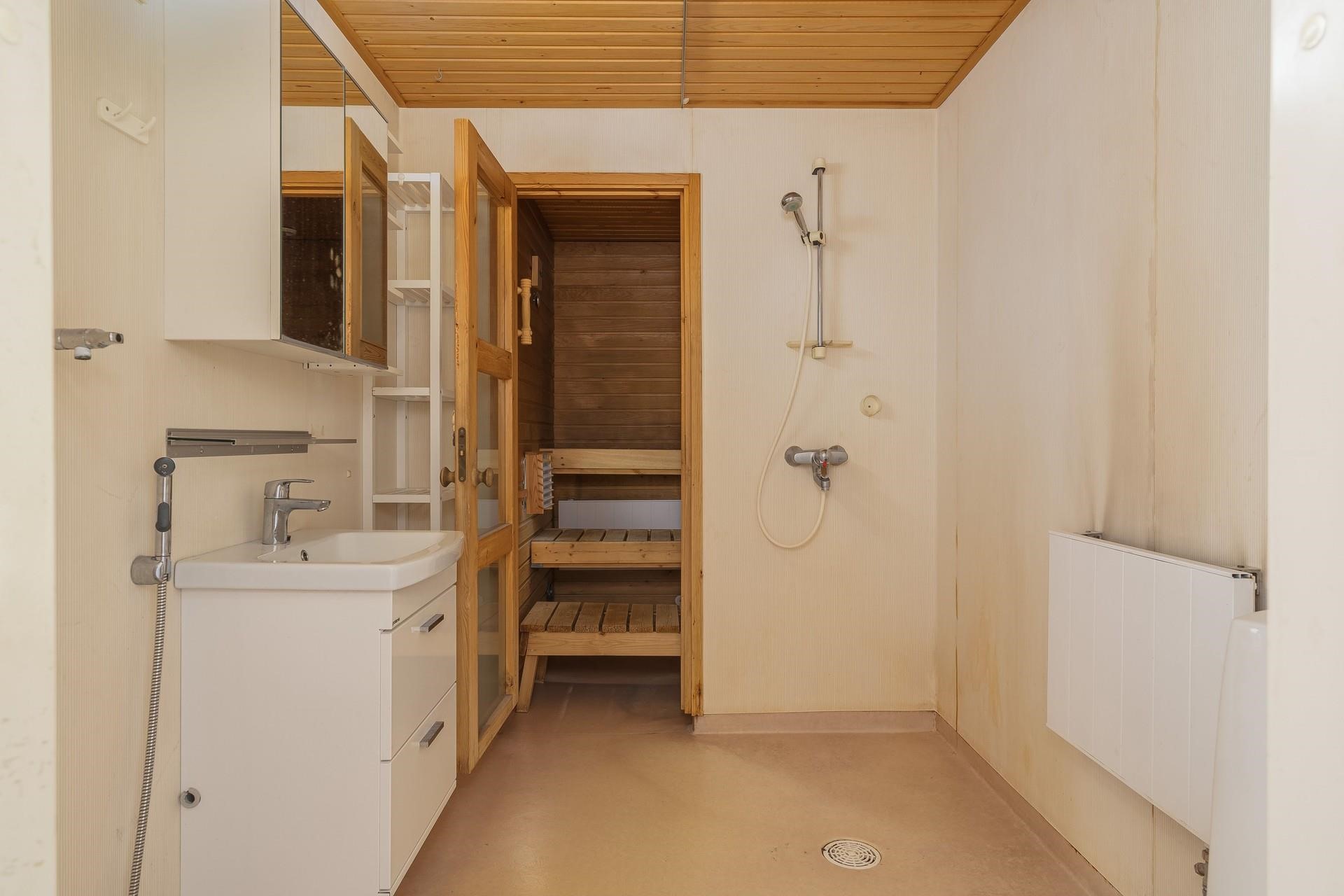 - Sauna, sähkökiuas, kylpyhuone, suihku, peilit, allaskaappi, pesukoneliitäntä, kiinteät valaisimet. Myytävän huoneiston pesuhuone ja sauna ovat alkuperäisessä kunnossa. Taloyhtiö on teettänyt kosteusmittauksen minkä johdosta suositellaan pesuhuoneen remontoimista. Taloyhtiössä on uusittu vuosittain kunnostusta vaativia pesuhuoneita ja 2026 budjettia laadittaessa asiasta keskustellaan hallituksessa. 2026 yhtiökokouksessa päätetään mahdollisista huonokuntoisten pesuhuoneiden uusimisista.