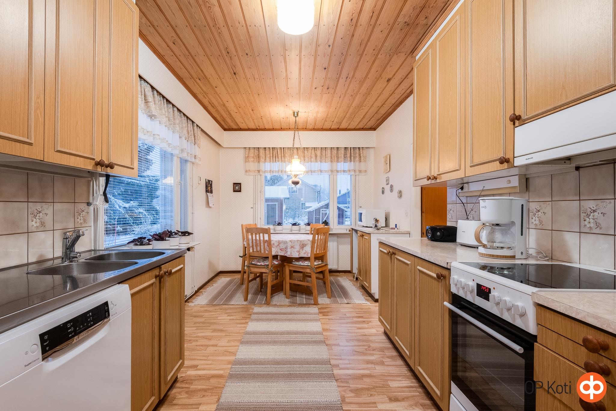 Tutustu tähän viehättävään omakotitaloon Kälviällä, joka mahdollistaa rauhallisen ja kodikkaan asumisen keskellä vehreää luontoa. Tämä koti on täydellinen valinta perheelle, joka arvostaa tilaa, yksityisyyttä ja mahdollisuutta muokata asuntoa omien toiveiden mukaan. Vuonna 1967 valmistunut talo kätkee sisälleen lämpimän tunnelman, joka kutsuu viihtymään. Asunnossa on 92 m² asuintilaa, joka sisältää kolme makuuhuonetta, tilavan olohuoneen, keittiön sekä pukuhuoneen, kylpyhuoneen ja saunan. Lisäksi talon yhteydessä on autotalli sekä varastotilaa. Keittiö tarjoaa hyvät puitteet ruoanlaittoon, ja olohuoneessa varaava takka luo lämpöä ja tunnelmaa talvi-iltoihin. Kylpyhuone ja sauna on remontoitu vuonna 2000, ja wc-tilat uudistettu vuonna 2008. Lisäksi pihapiirissä on talousrakennus, joka toimii autotallina ja varastona sekä erillinen puulato. Teknisesti kiinteistö on hyvin huollettu; kaukolämpöjärjestelmä on uusittu vuonna 2014, ja salaojat sekä sadevesijärjestelmä päivitettiin vuonna 2016. Ikkunat on vaihdettu 1993, ja lämmitysputket on uusittu vuonna 1996. Vesikiertoinen patterilämmitys ja pesutilojen lattialämmitys takaavat mukavuuden ympäri vuoden. Kälviä on viehättävä asuinalue, joka tarjoaa monipuoliset palvelut ja hyvät liikenneyhteydet. Läheltä löytyvät koulu, päiväkoti, kauppa ja muut arjen palvelut, ja Kokkolan keskusta on vain lyhyen ajomatkan päässä. Alueen luonnonläheisyys ja virkistysmahdollisuudet tekevät siitä ihanteellisen paikan perheille, jotka arvostavat rauhallista elinympäristöä. Älä odota enää, vaan varaa oma esittelyaikasi ja tule tutustumaan tähän kodikkaaseen omakotitaloon!