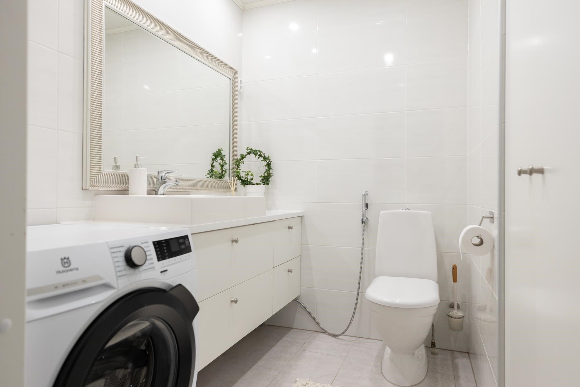 - Sauna, sähkökiuas, kylpyhuone, erillinen wc, suihku, suihkuseinä, peilit, kaapit, allaskaappi, pesukoneliitäntä, lattialämmitys, kiinteät valaisimet.