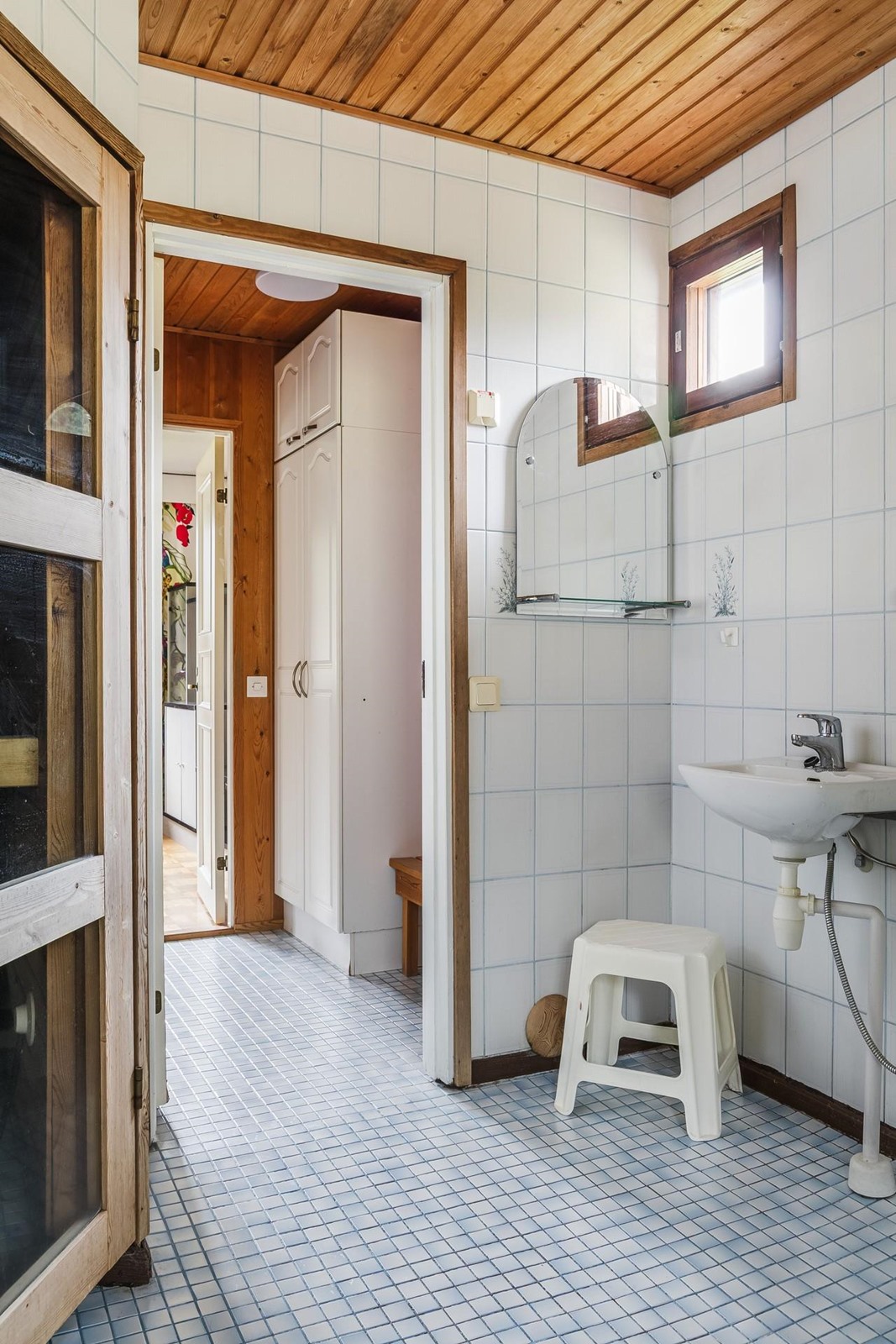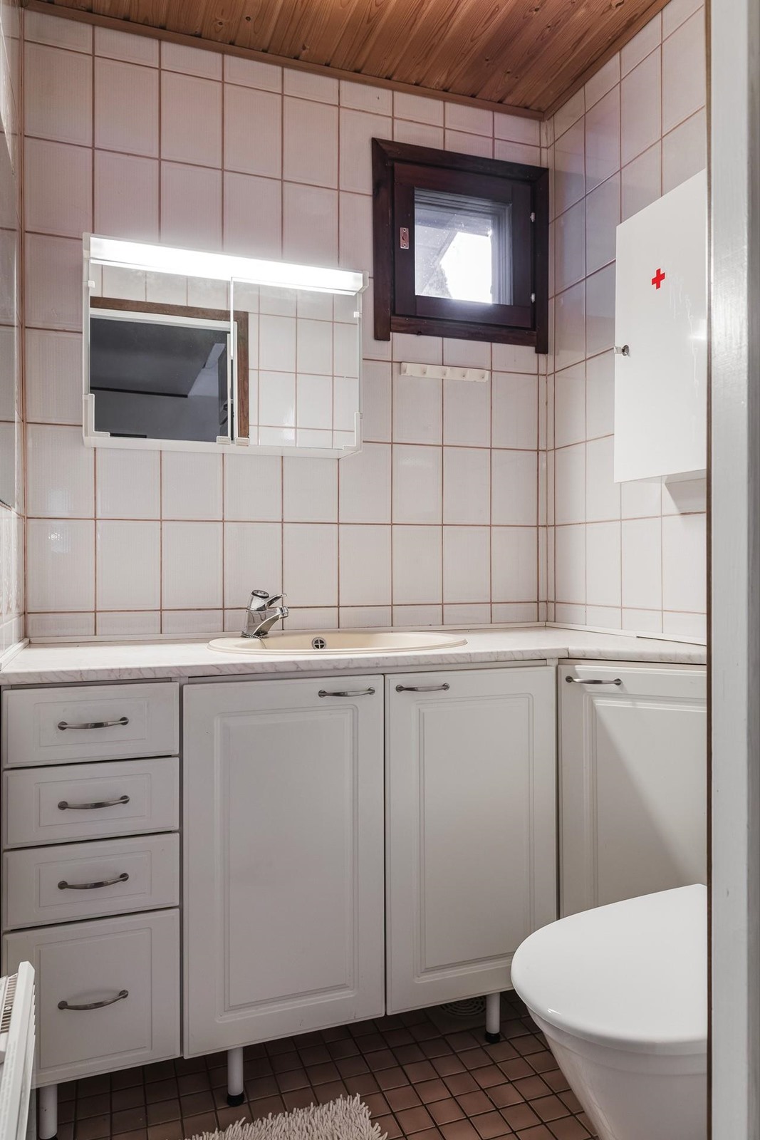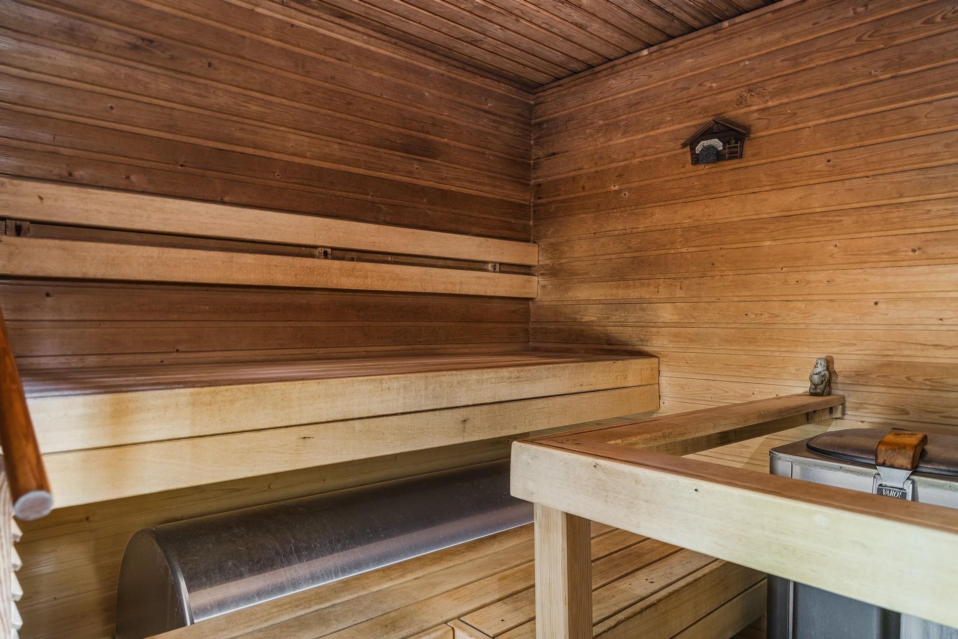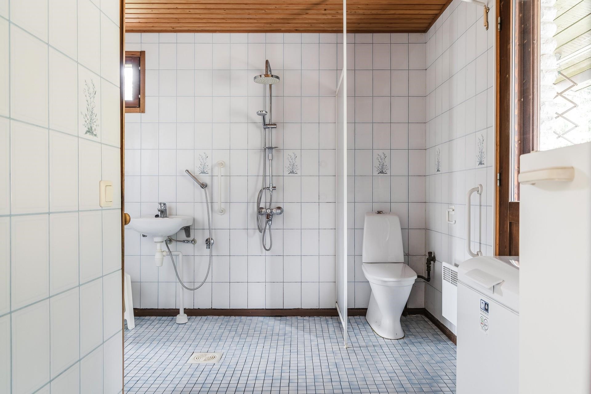 - Sauna Harvian hetivalmis-kiuas, lauteiden alla lämminvesivaraaja, kylpyhuone (allas, hana, käsisuihku, peili, suihku, wc-istuin,), erillinen wc (wc-istuin, allas, allaskaappi, peilikaappi), pesukoneliitäntä (kylpyhuoneessa), kiinteät valaisimet. Kylpyhuoneen (ja pukuhuoneen) lattialämmitys on rikki, eikä toimi. Kylpyhuoneessa vikavirtasuoja sähköpatterille, koska märkätila (seinän pistorasiassa). Kiinteistön vesimittari sijaitsee erillisen wc:n nurkkakaapissa.