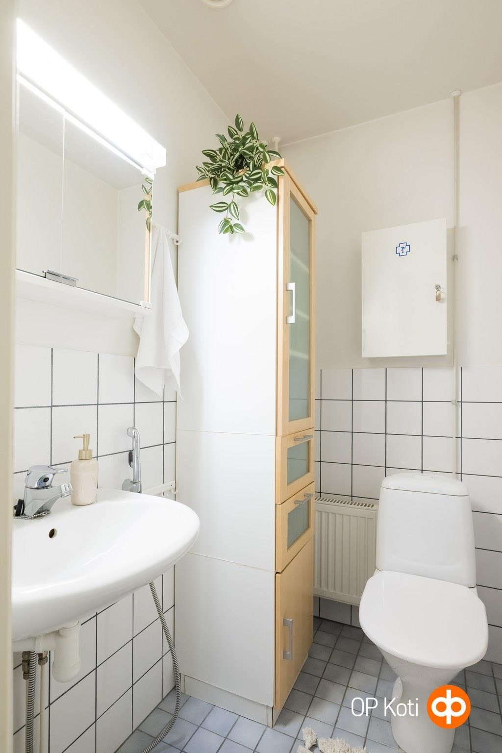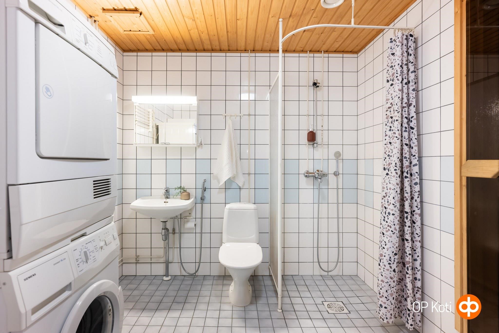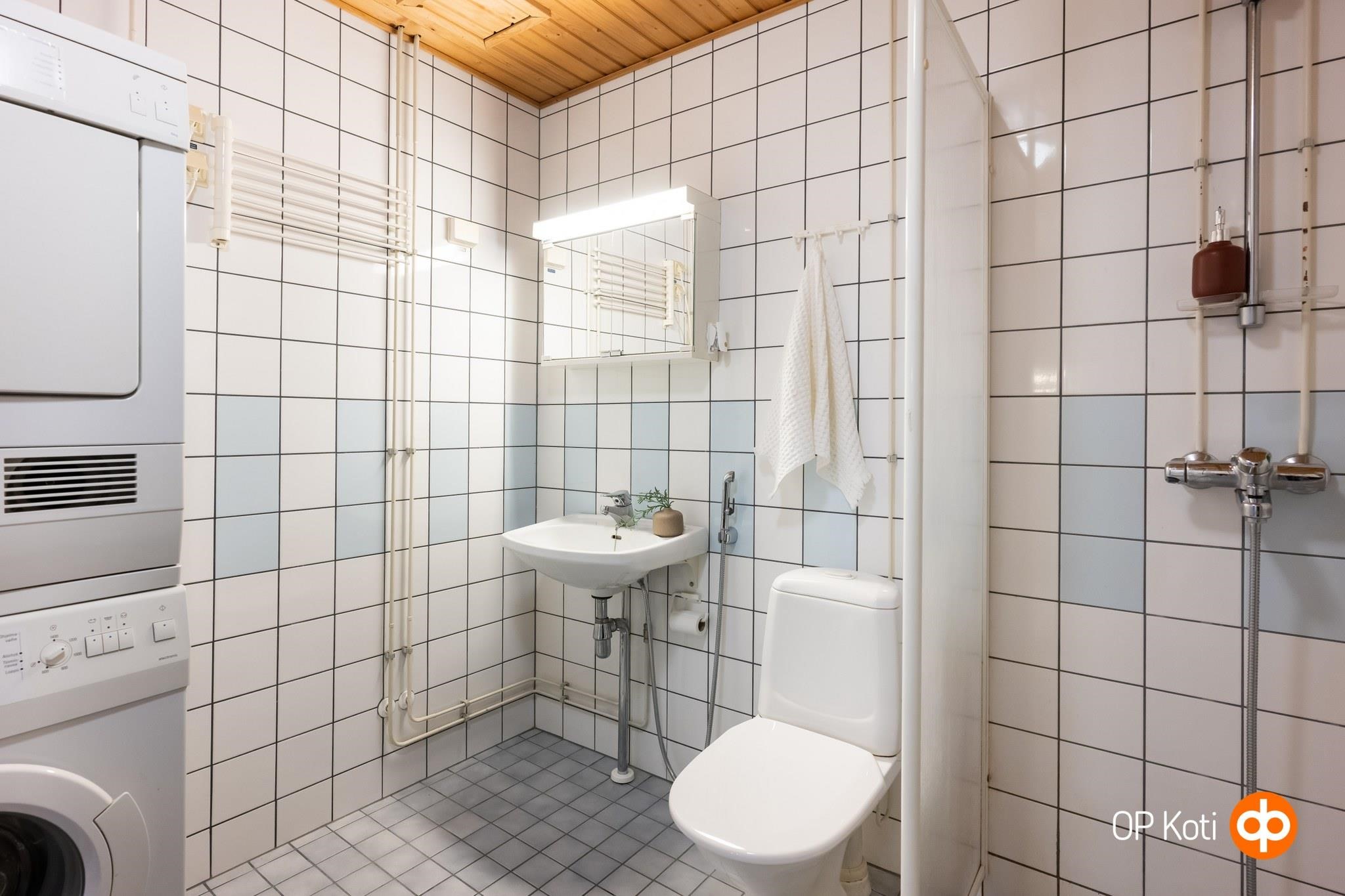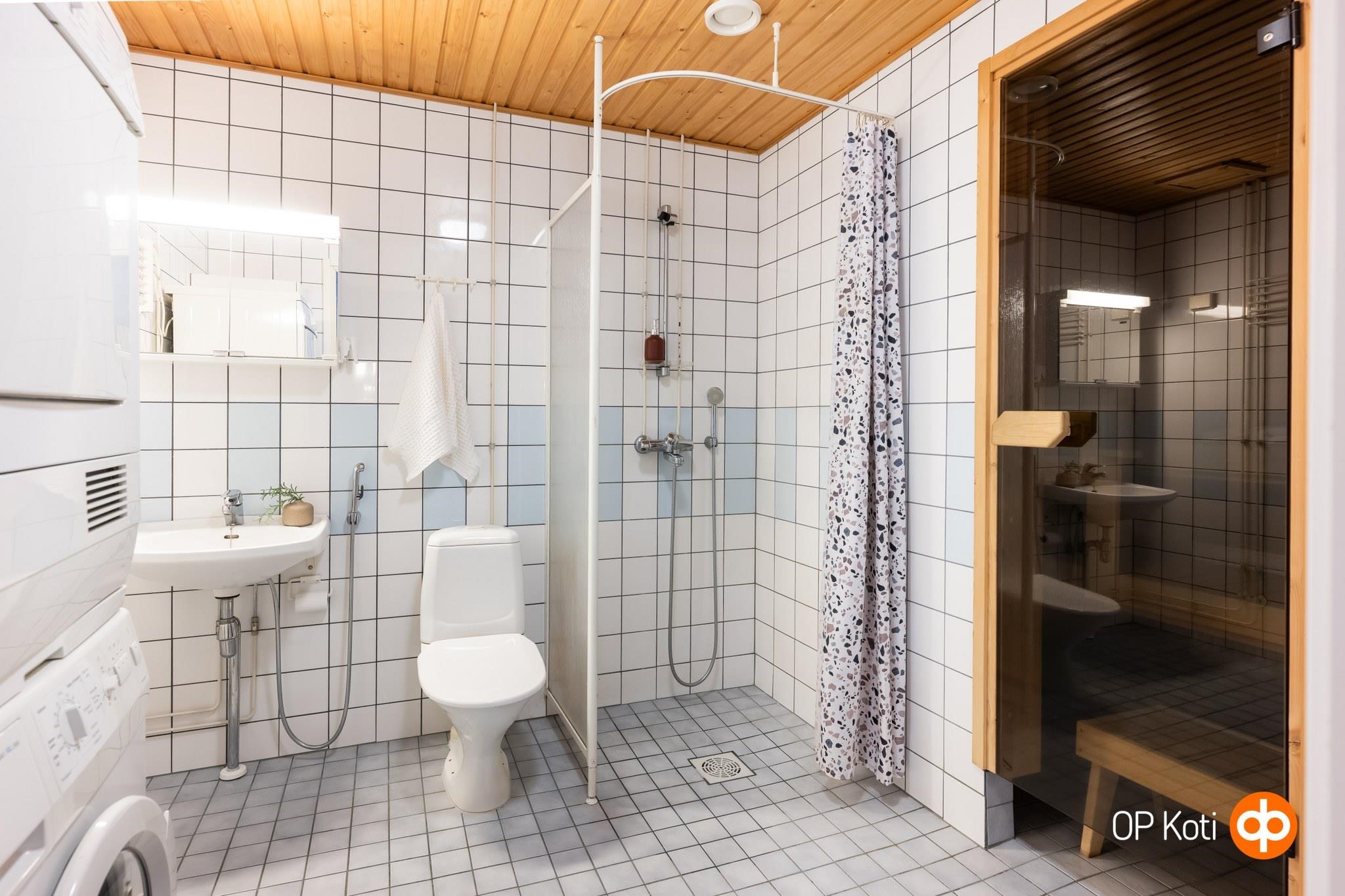 - Sauna, sähkökiuas Harvia (hankittu vuonna 2021), kylpyhuone, erillinen wc, suihku, suihkuseinä, peilikaappi, kaapit erillisessä wc:ssä, pesukoneliitäntä kph, lattialämmitys, kiinteät valaisimet kph+s+wc. Pesuhuoneessa sähkötoiminen mukavuuslattialämmitys. Säätö oven ulkopuolelta. Kylpyhuoneen katossa vesimittarin alla pieni valumajälki. Tiiviste vaihdettu ongelman havaitsemisen jälkeen yhtiön toimesta.
