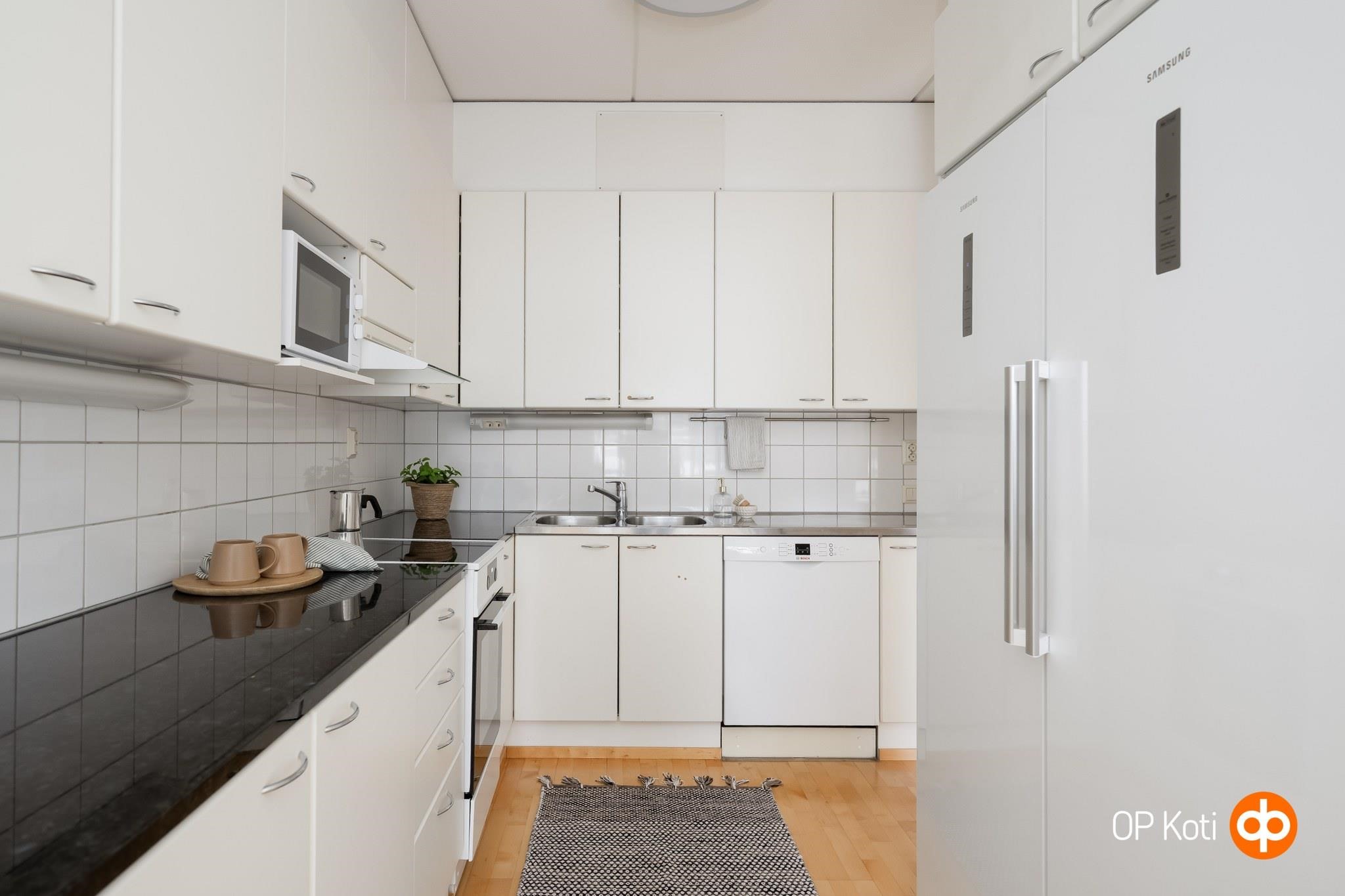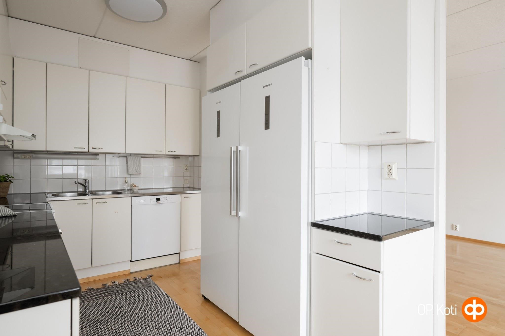 - Jääkaappi Samsung täyskorkea (hankittu vuonna 2021), pakastekaappi Samsung täyskorkea (hankittu vuonna 2021), induktioliesi Gorenje (hankittu vuonna 2021), liesikupu Muh, astianpesukone Bosch, kaapistot, kiinteät valaisimet välitilassa. Kivitasot