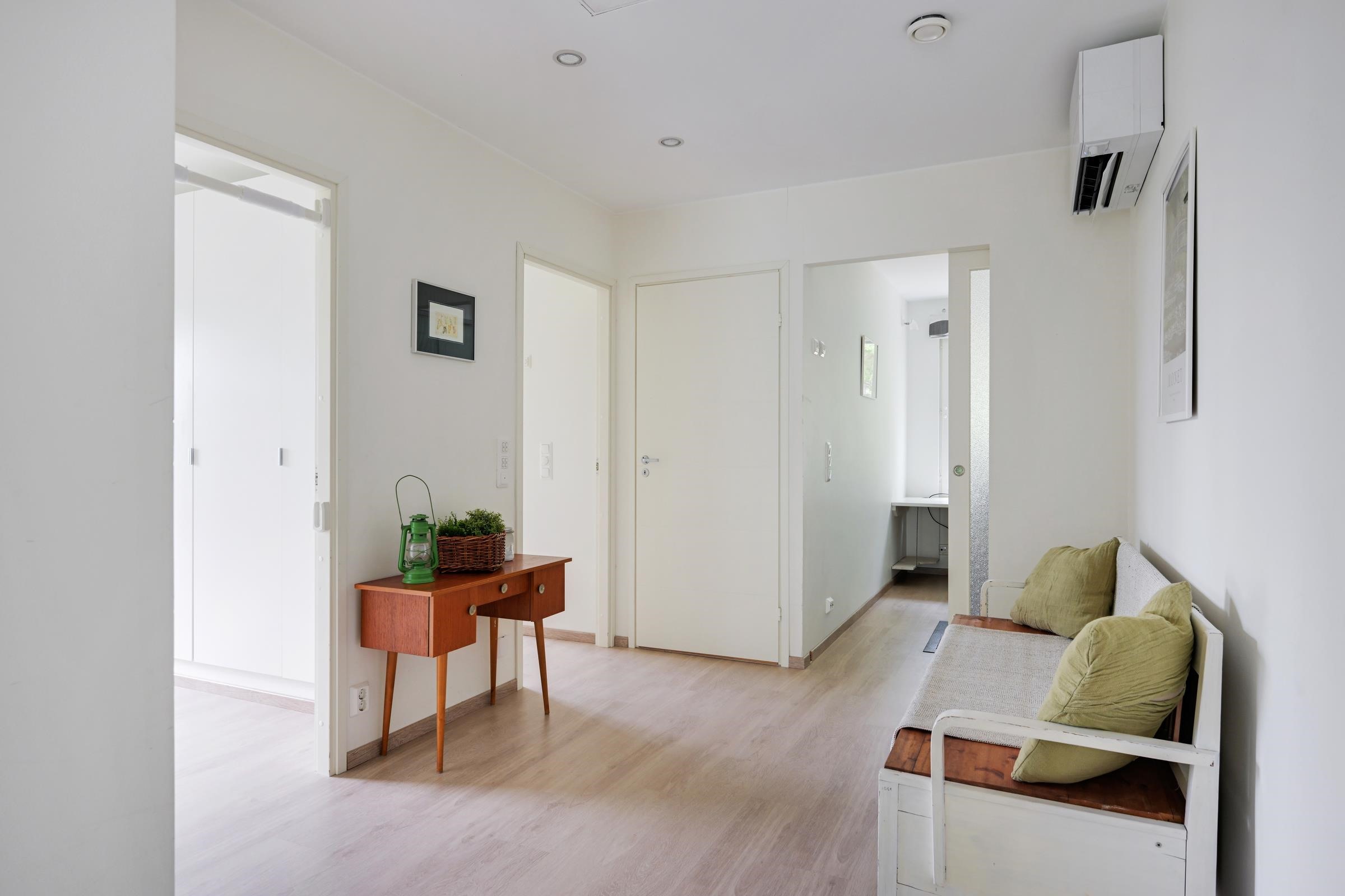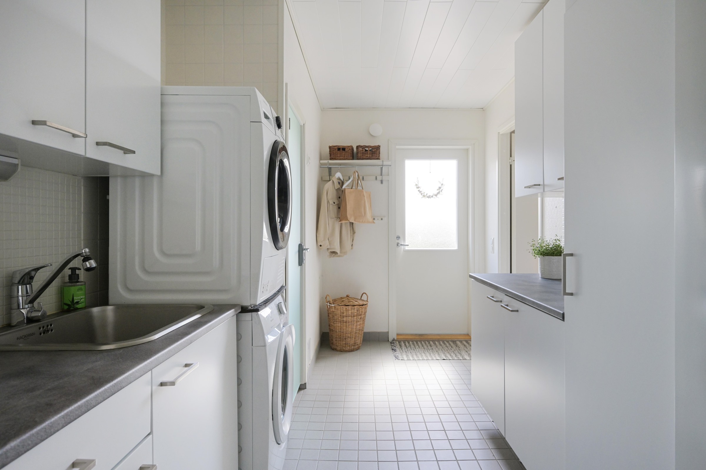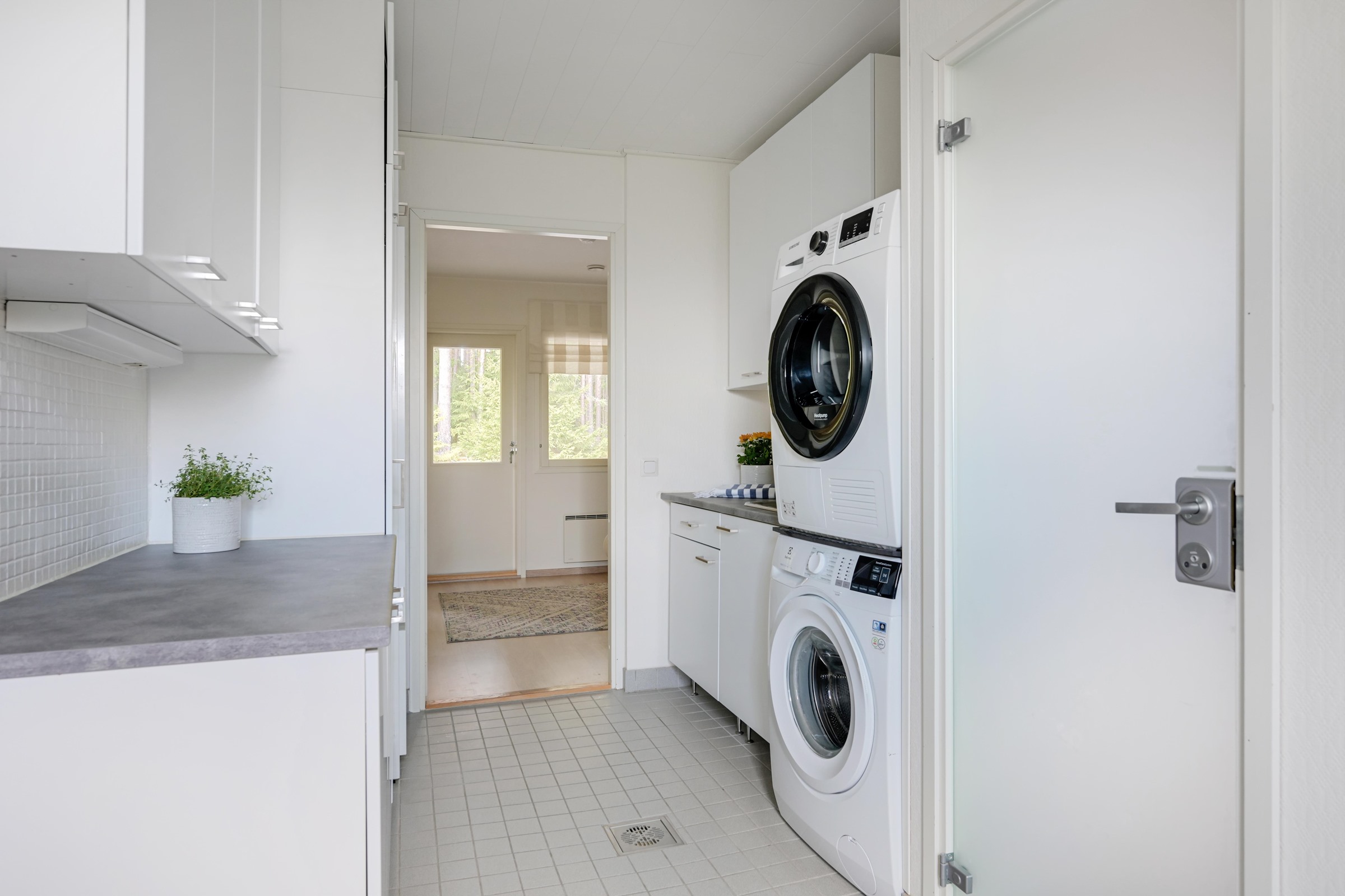 Sauna ja kylpyhuoneet kutsuvat rentoutumaan, ja kodinhoitohuone helpottaa arjen sujuvuutta. Heti sisääntulon vieressä on vaatesäilytys ja kuorasyöppö.