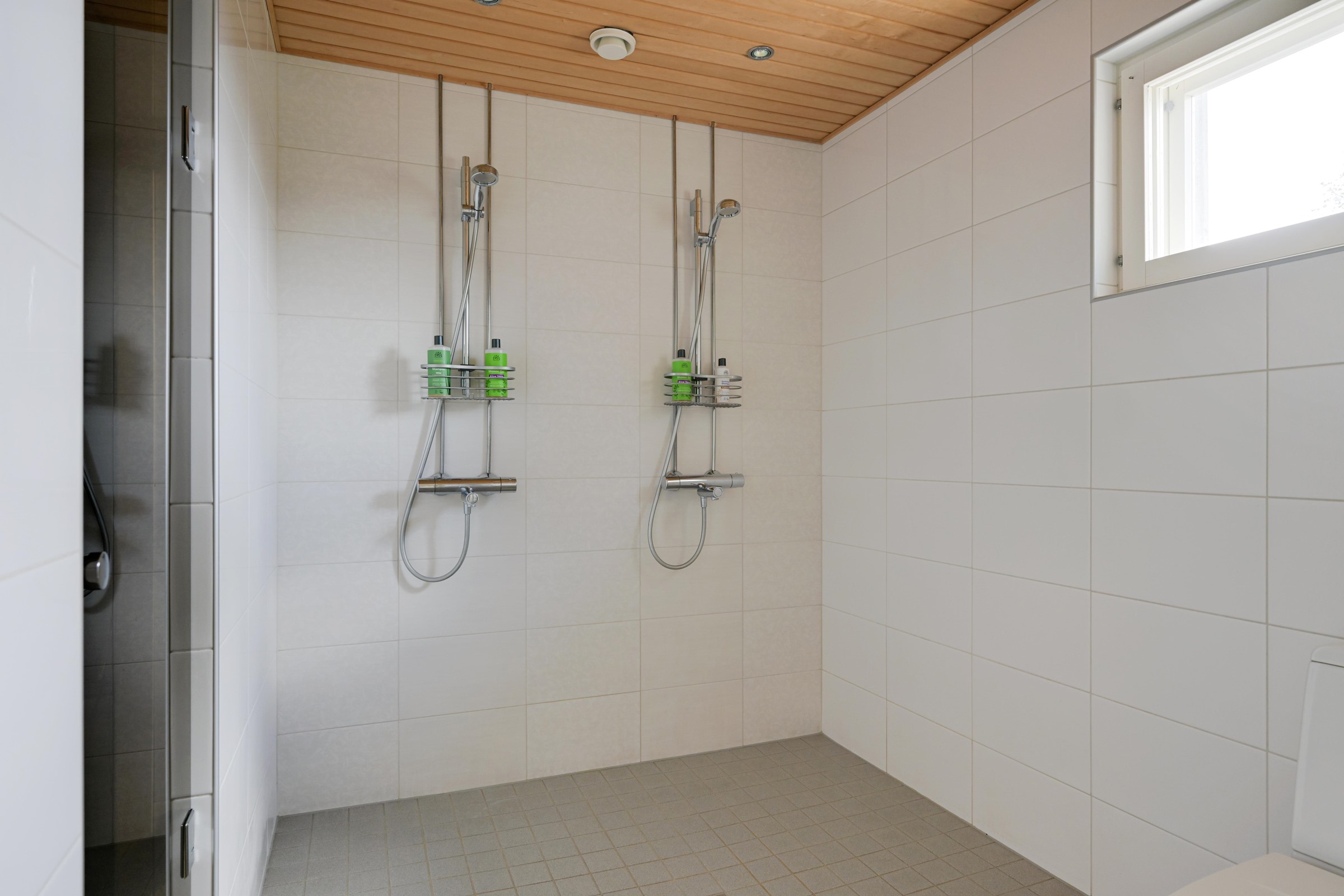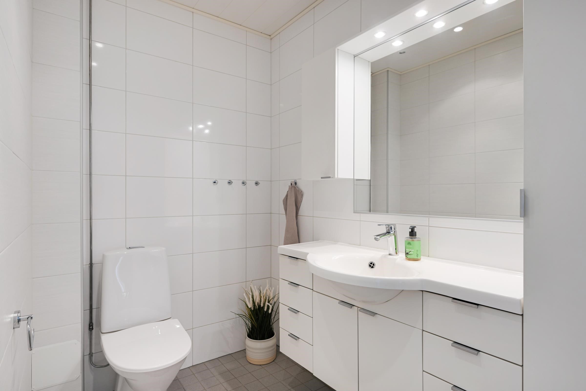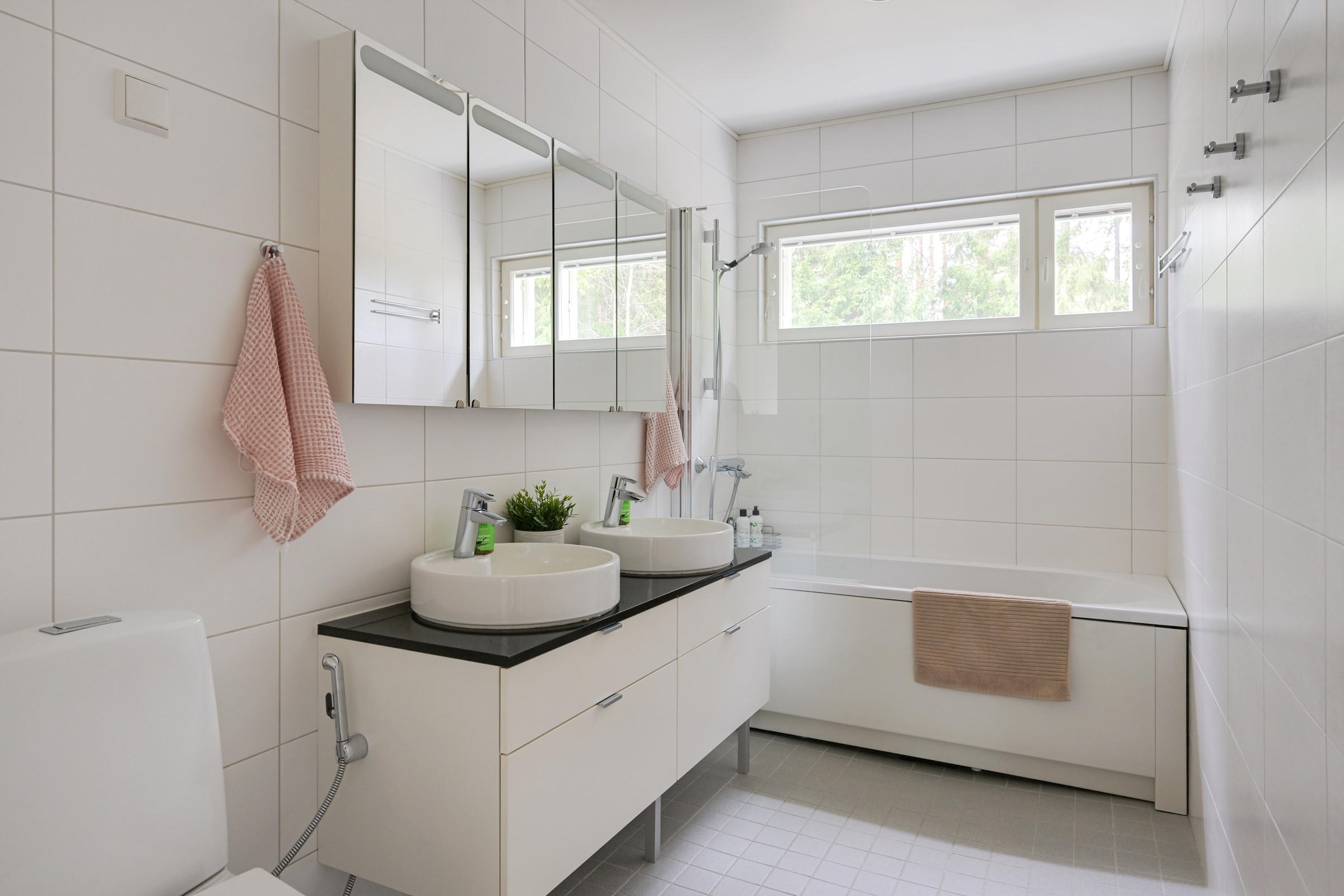 - Sauna, sähkökiuas, kylpyhuone, erillinen wc, suihku x2 (ns.vanhan osan kylpyhuoneessa), amme, peilit, peilikaappi, kaapit, allaskaappi, pesukoneliitäntä, lattialämmitys, kiinteät valaisimet. Lattialämmitys on kaikissa märkätiloissa (eli molemmissa kylpyhuoneissa, kodinhoitohuoneessa, wc:ssä, eteisessä ja kuraeteisessä) ja laajennusosalla kauttaaltaan.