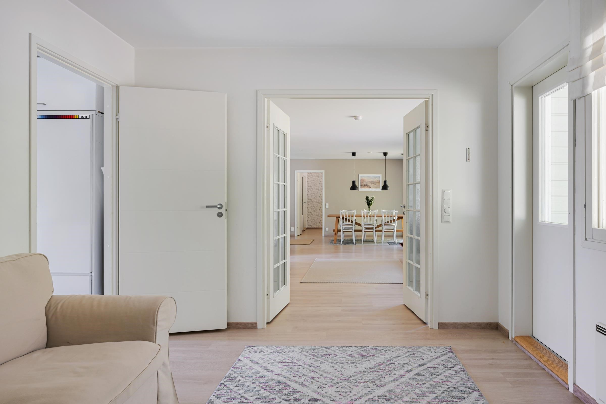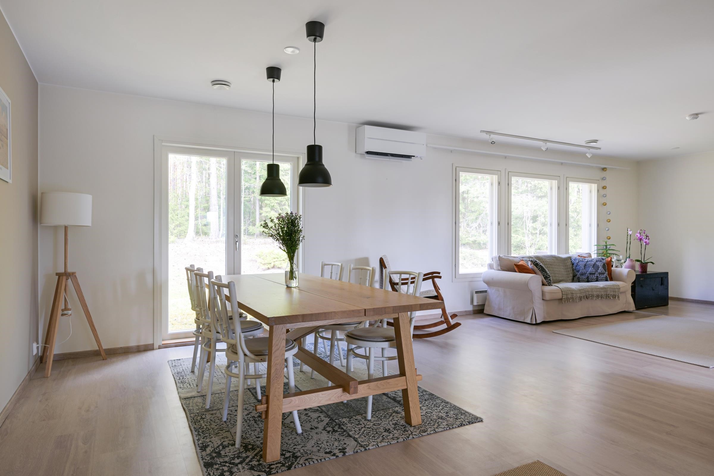 Sisätiloissa yhdistyvät toimivuus ja kodikkuus: avarat oleskelutilat, useita makuuhuoneita ja työtiloiksi sopivia huoneita vaikka laajennusosassa tarpeen mukaan.