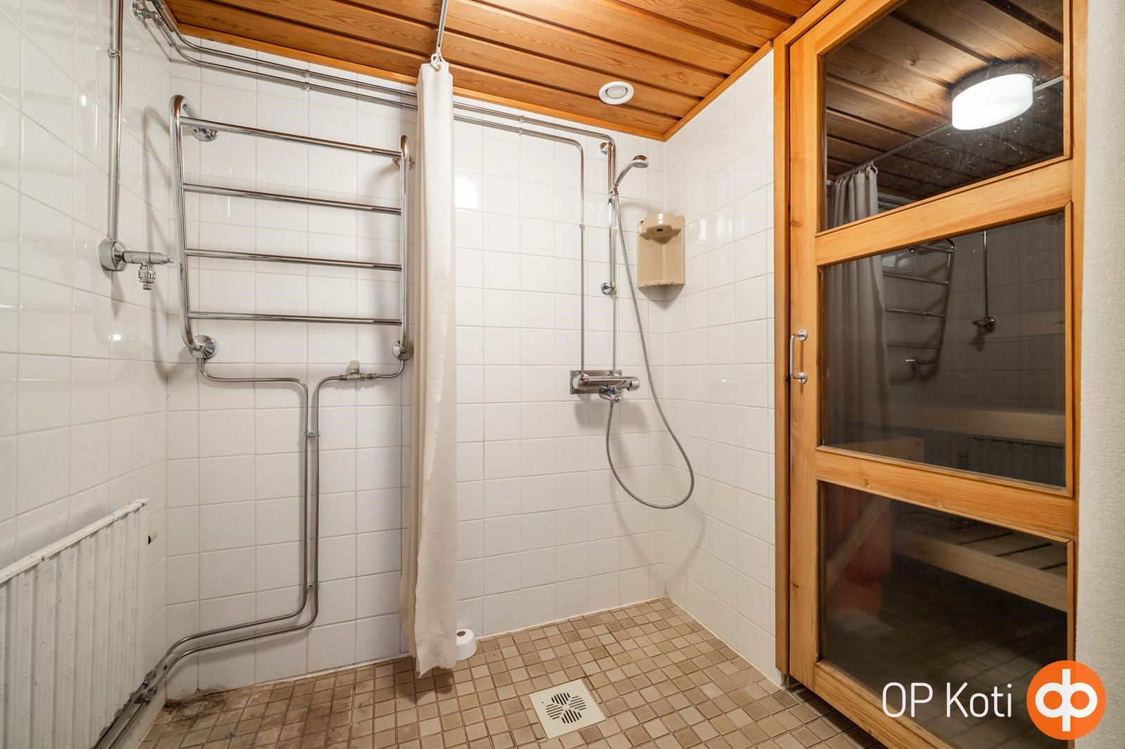 - Sauna, sähkökiuas, kylpyhuone, erillinen wc, suihku, peilikaappi erill. wc, allaskaappi wc, pesukoneliitäntä kph, kiinteät valaisimet.