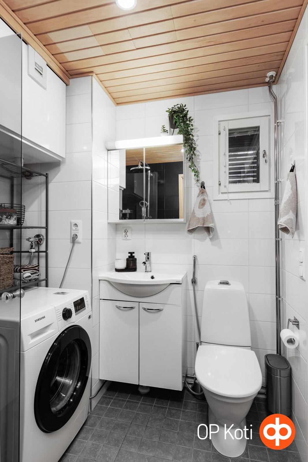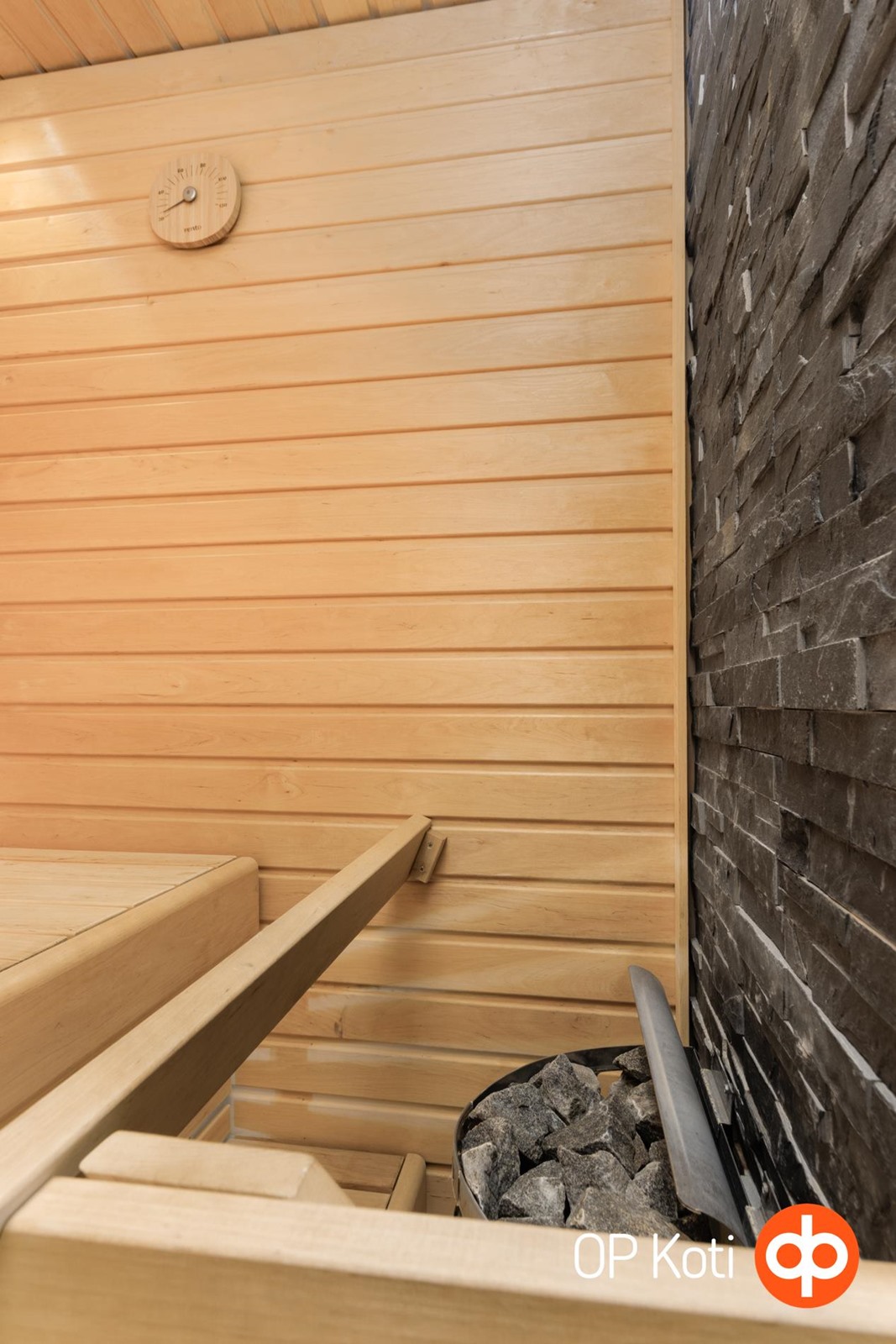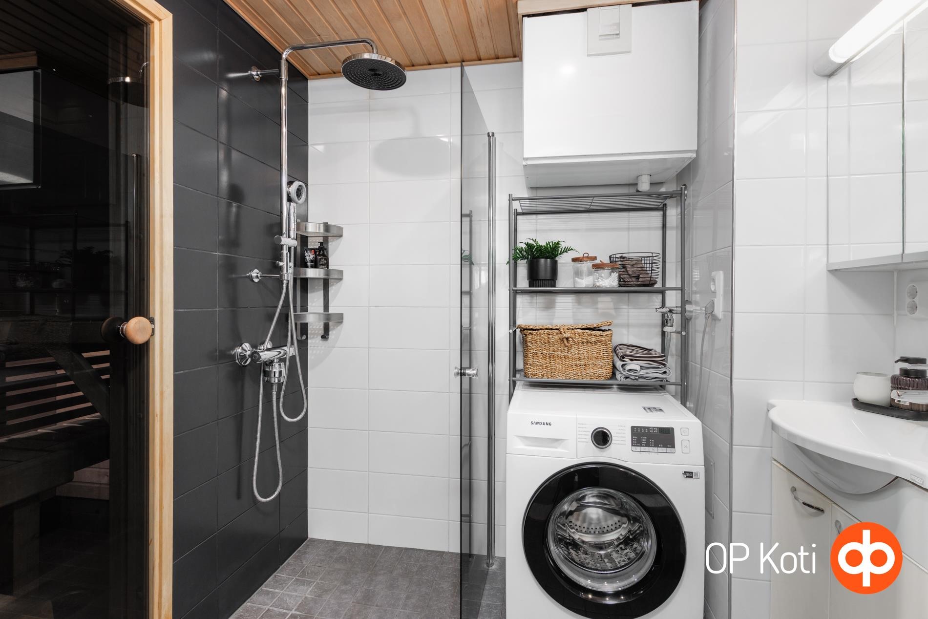 - Sauna, sähkökiuas, kylpyhuone, suihku, peilikaappi, allaskaappi, pesukoneliitäntä, lattialämmitys, kiinteät valaisimet.