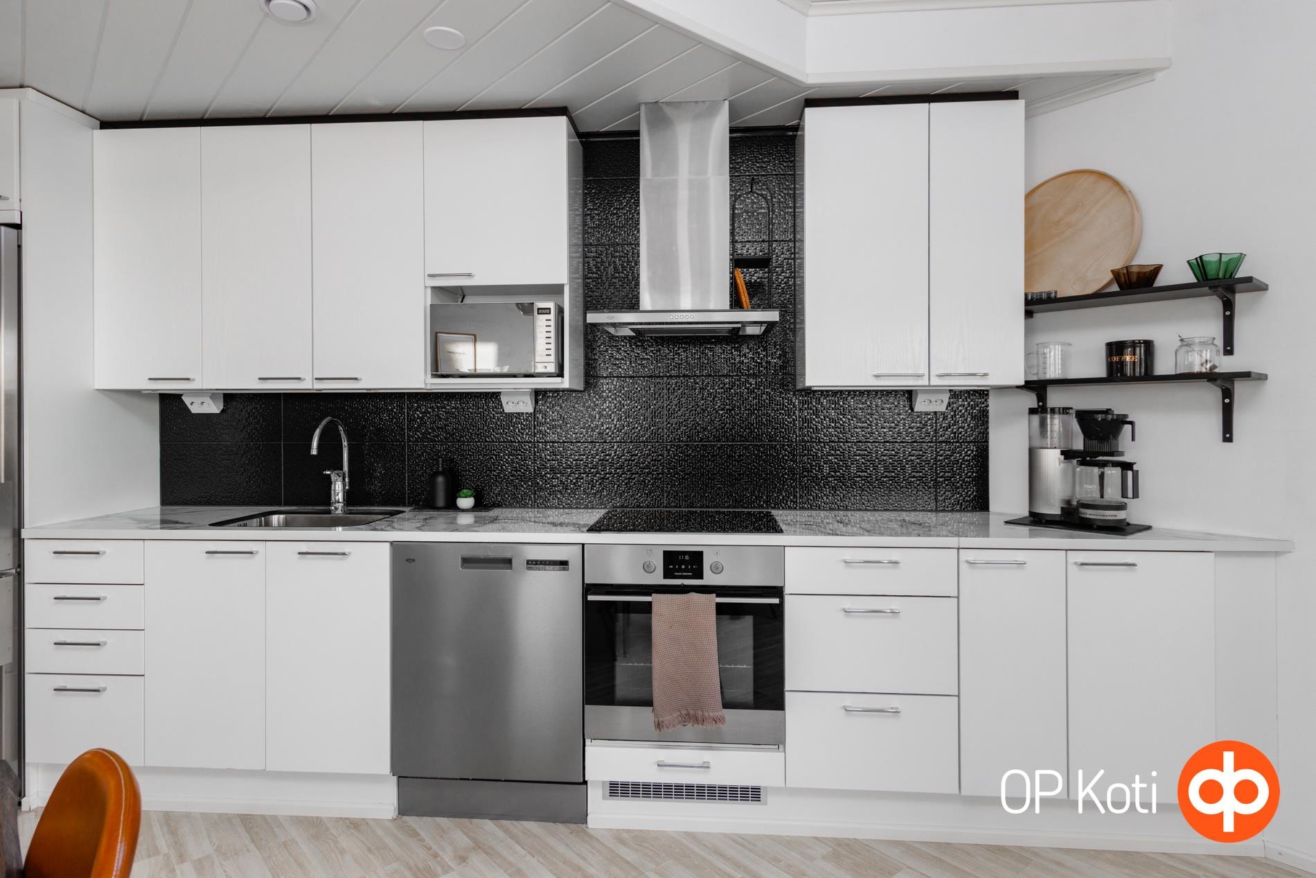 - Jääkaappipakastin, keraaminen liesi, liesituuletin, astianpesukone, kaapistot, kiinteät valaisimet.