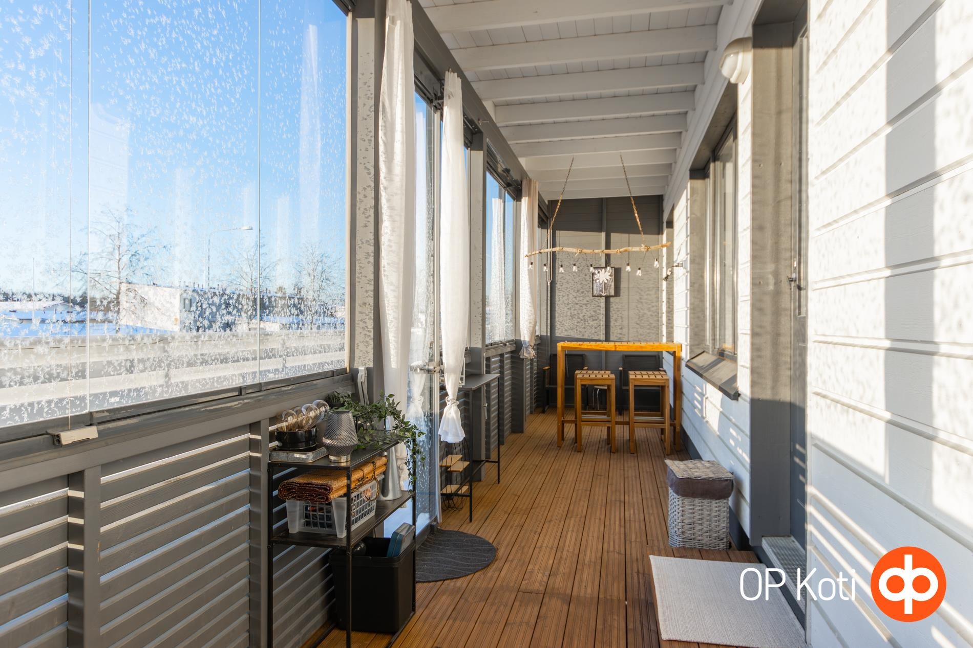 Asumismukavuutta lisää todella suuri lasitettu patio, joka toimii loistavasti lisäoleskelutilana aikaisesta keväästä pitkälle syksyyn. Lisäksi asunnon yhteydessä on hieman aidattua piha-aluetta, joka sopii mainiosti esimerkiksi lemmikeille.