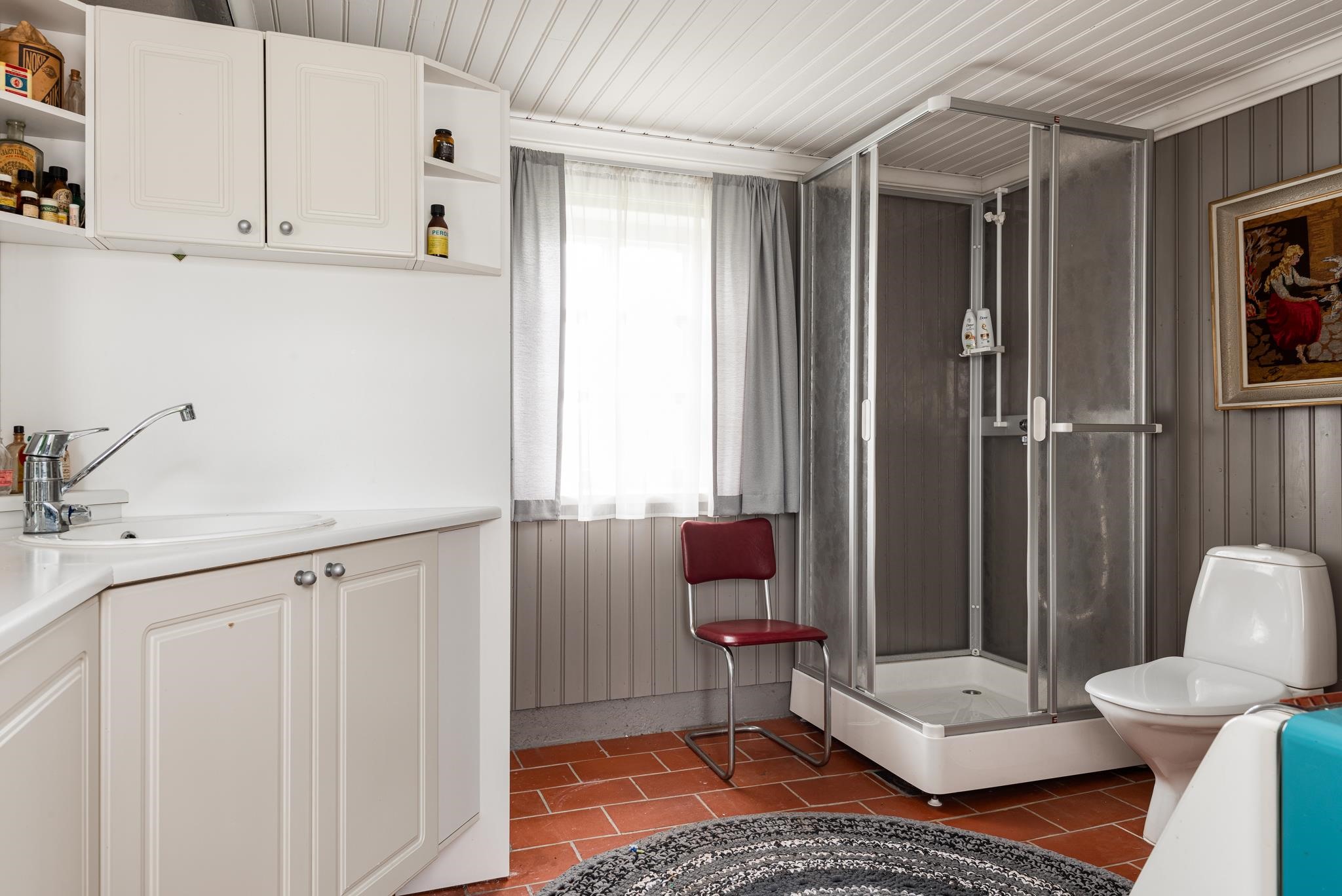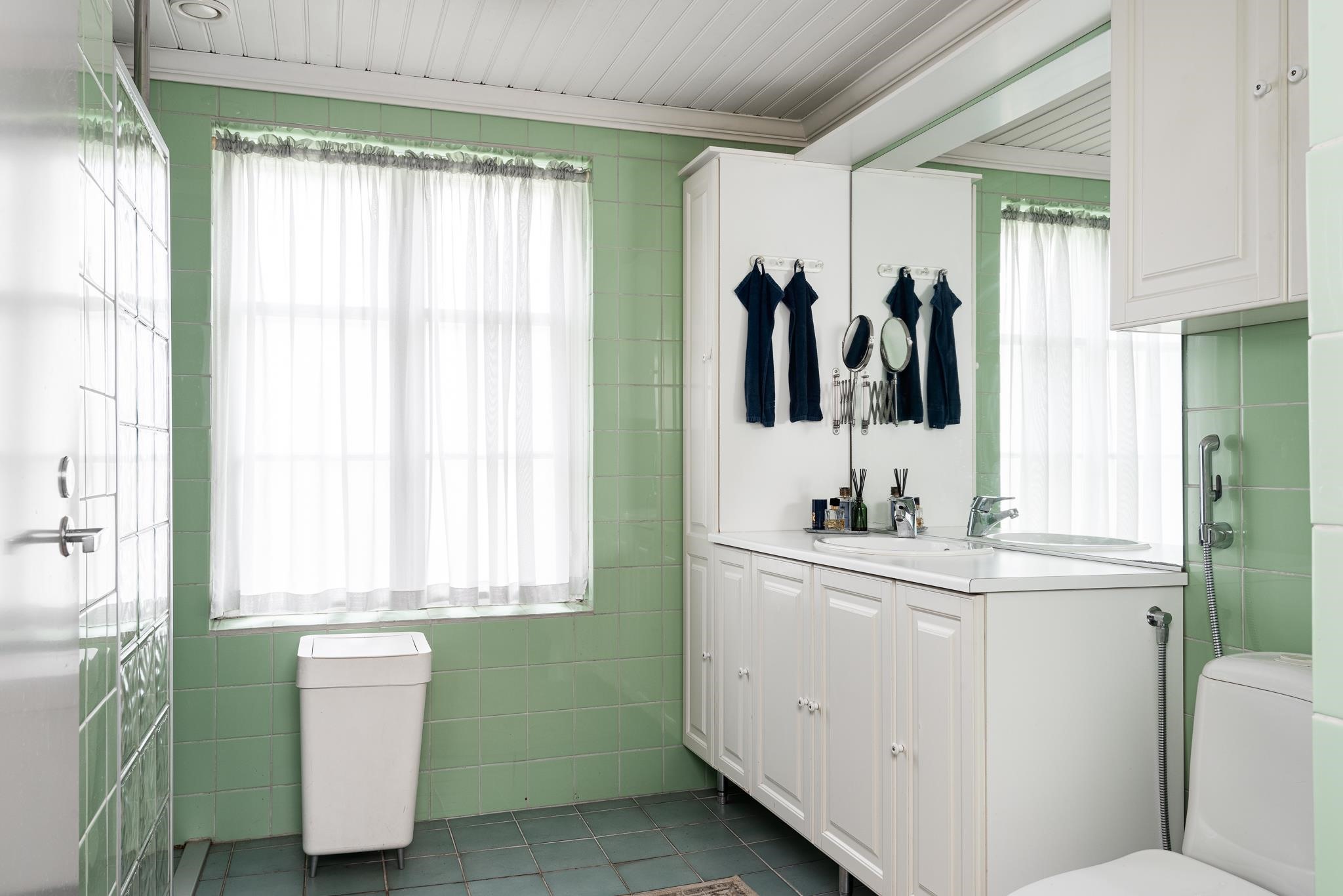 - Kylpyhuone, suihku, suihkuseinä, peilit, kaapit, allaskaappi, pesukoneliitäntä, lattialämmitys sähkö, kiinteät valaisimet.