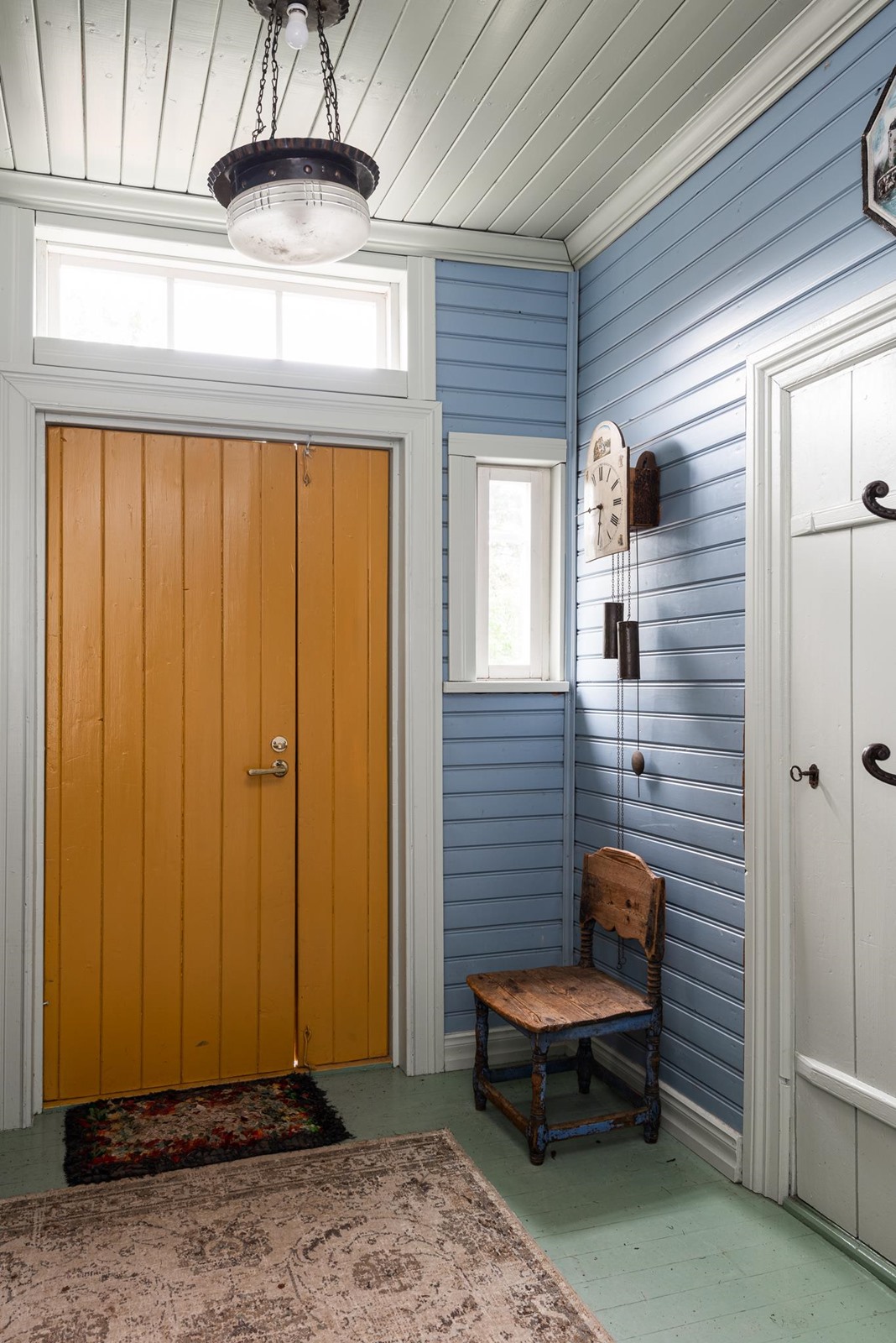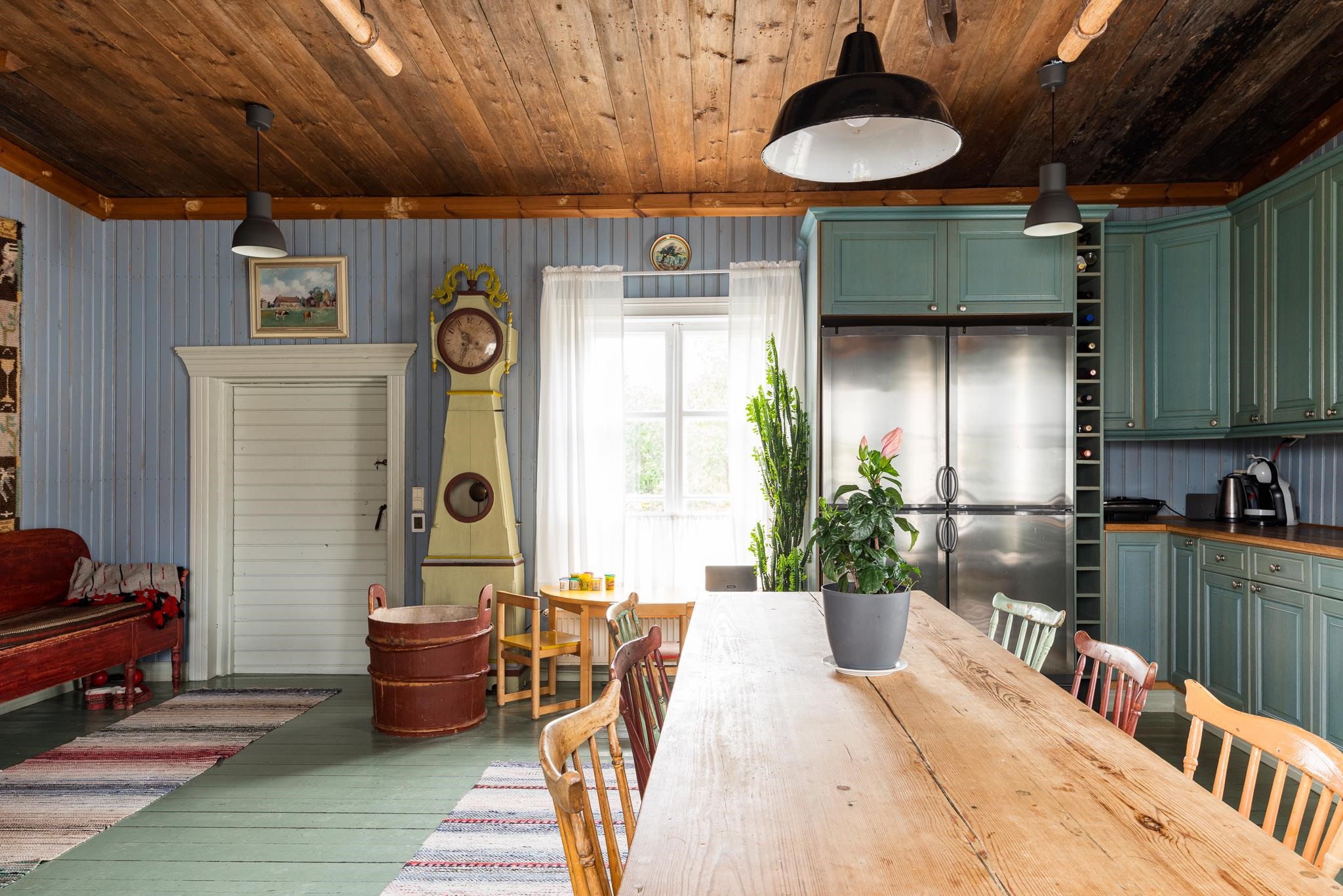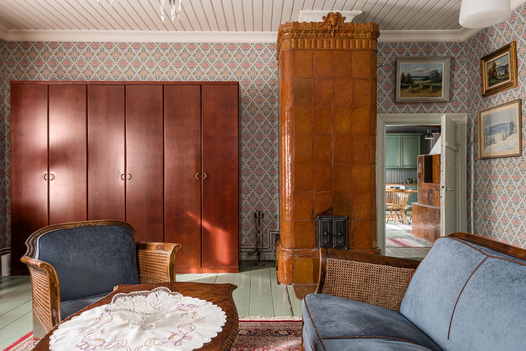 Keittiö: lauta. Olohuone: lauta. Makuuhuone 1: lauta. Makuuhuone 2: lauta. Makuuhuone 3: lauta. Kylpyhuone: laatta / laatta (tiiliseinät). Sali: lankku. "Kesä"sali: lankku.