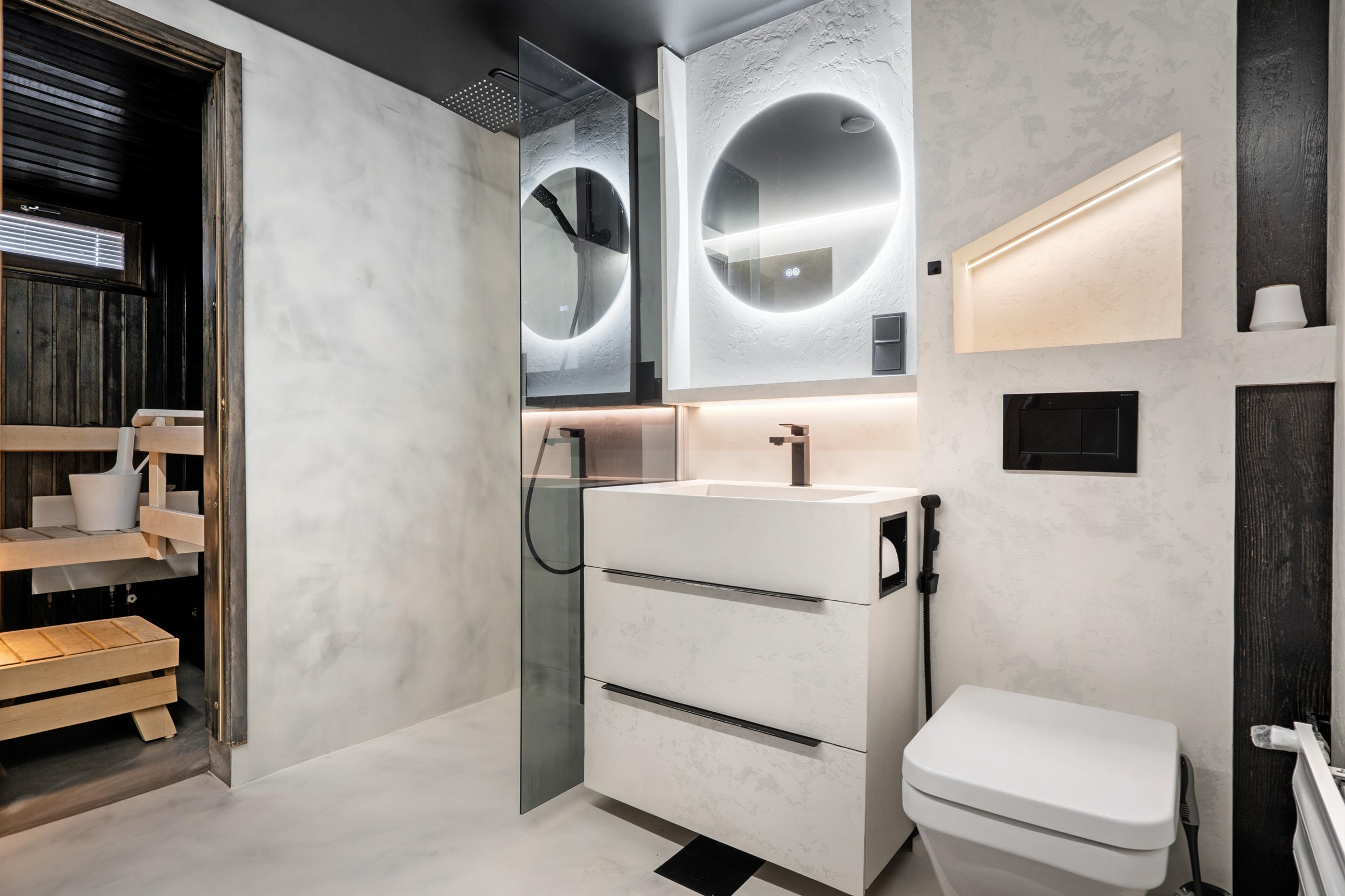 - Sauna, sähkökiuas, kylpyhuone, erillinen wc, suihku, suihkuseinä, peilit, allaskaappi, pesukoneliitäntä. Sauna ja kylpyhuone täysin uusittu 2011,mikrosementoitu kph ja wc