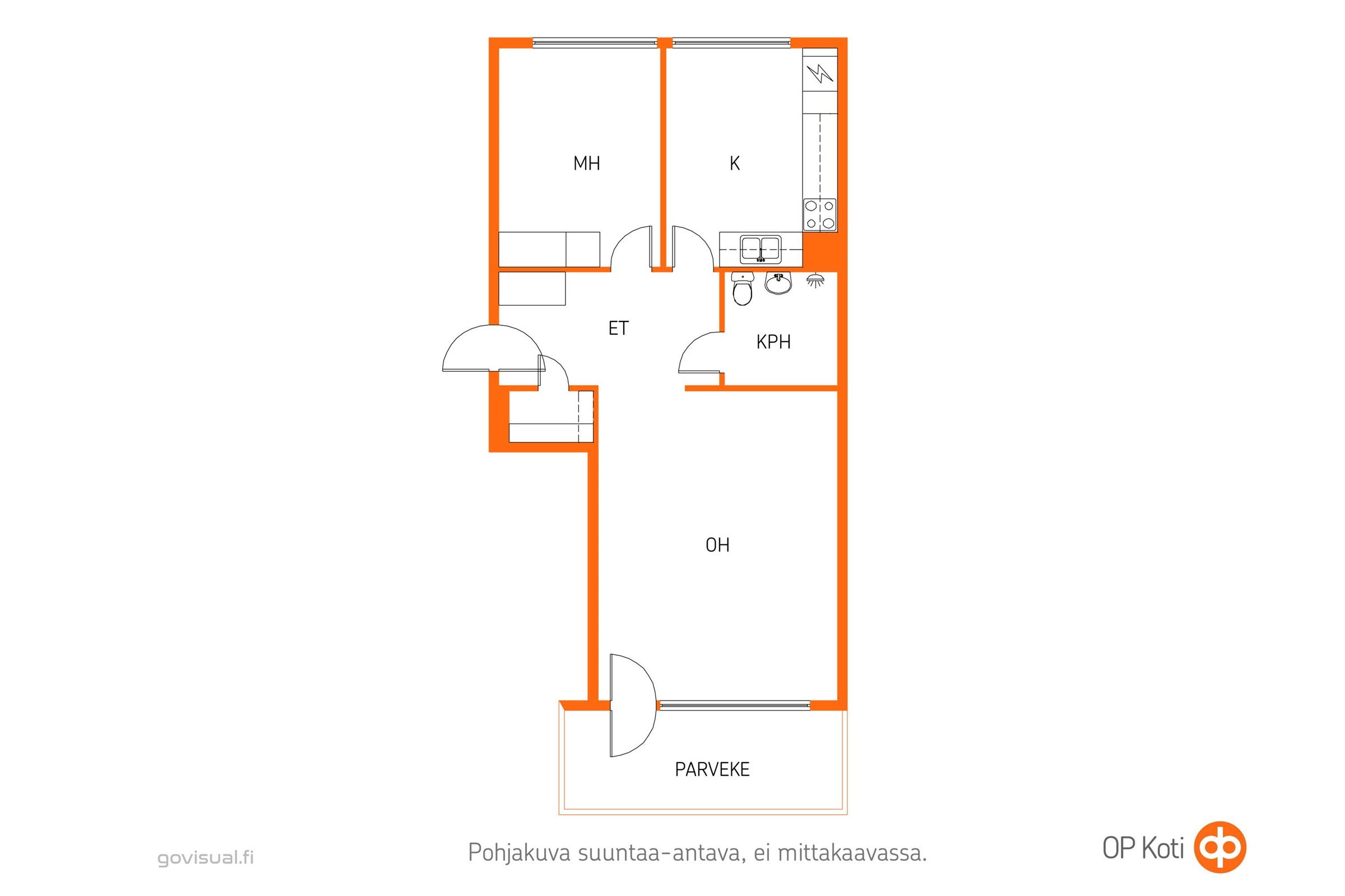 Asunnossa on erillinen keittiö, erillinen makuuhuone sekä tilava olohuone, josta on käynti parvekkeelle. Selkeä pohjaratkaisu tekee tiloista helposti muunneltavat ja antaa mahdollisuuden päivittää asunto oman maun mukaiseksi.
