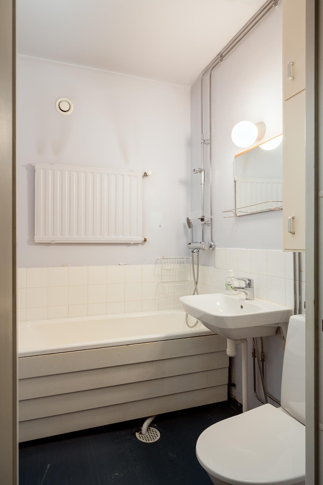 - Kylpyhuone, suihku, amme, peilit, pesukoneliitäntä. Alkuperäisessä kunnossa.