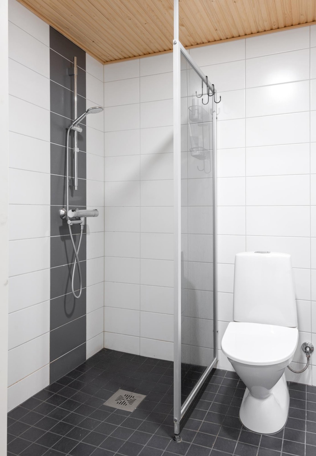- Kylpyhuone, suihku, suihkuseinä, peilikaappi, allaskaappi, pesukoneliitäntä, lattialämmitys, kiinteät valaisimet.