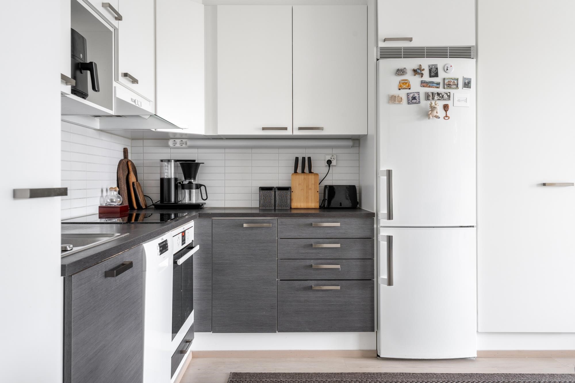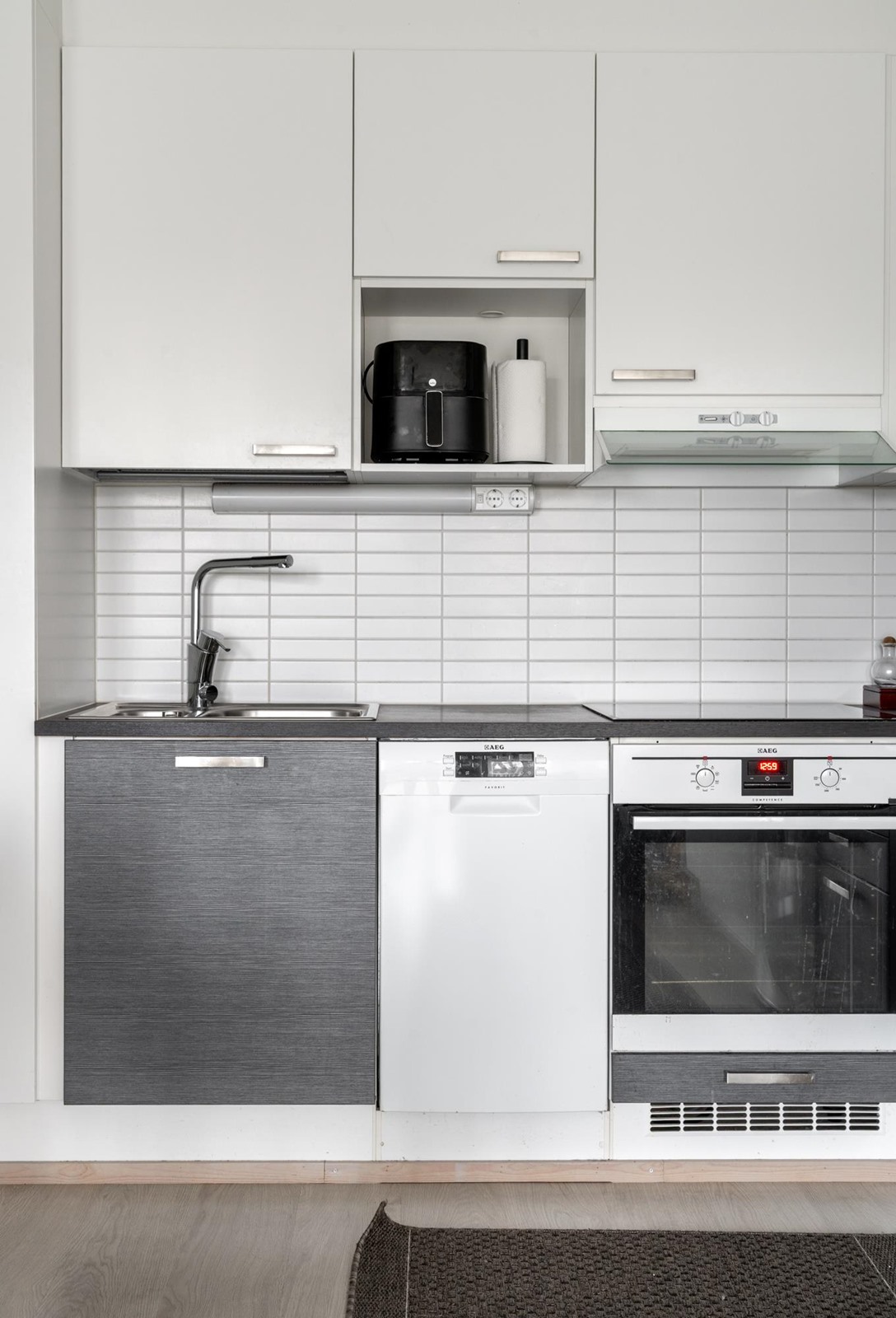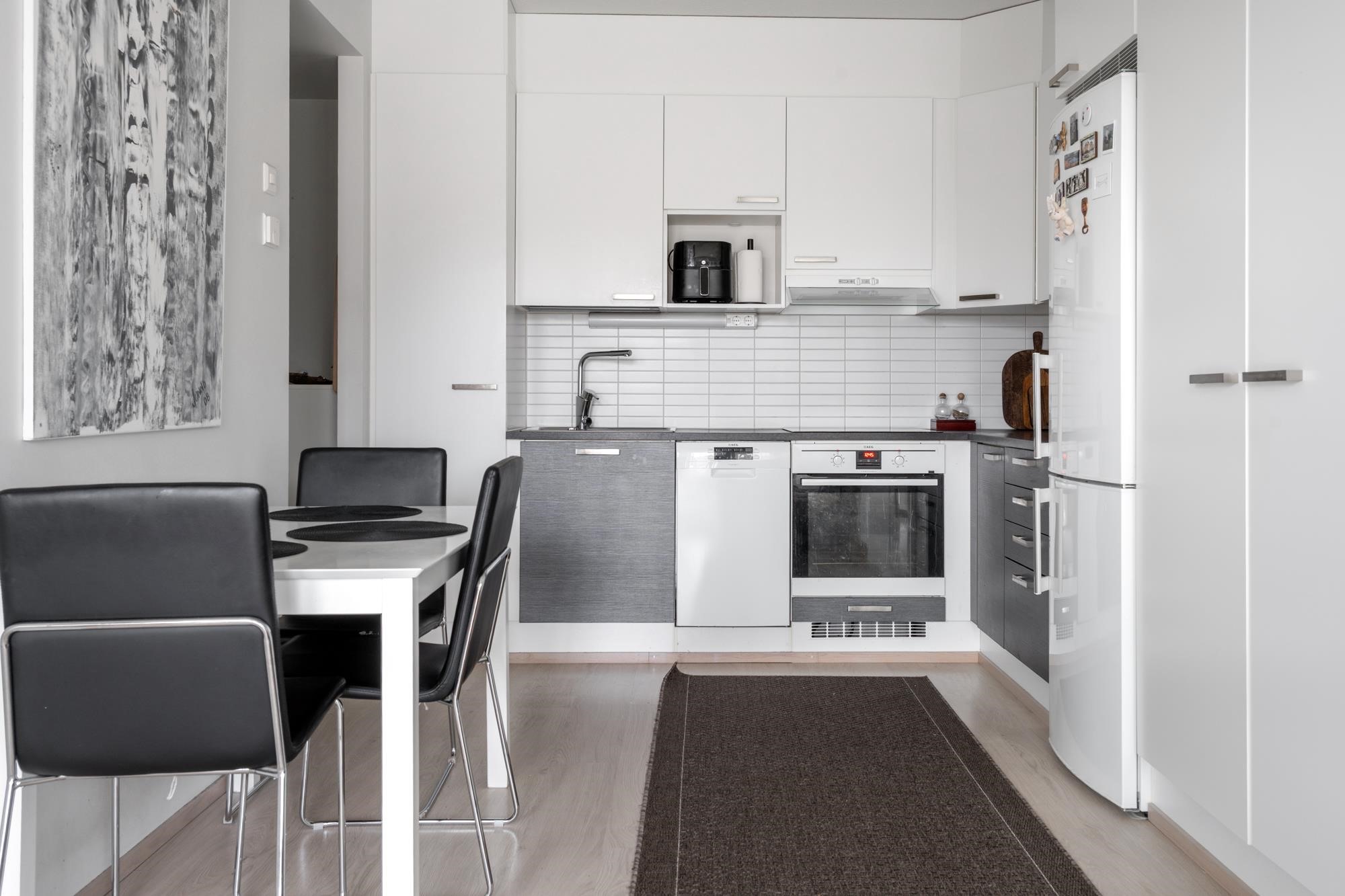 - Jääkaappipakastin, erillisuuni, keraaminen liesi, liesituuletin, astianpesukone, kaapistot, kiinteät valaisimet.