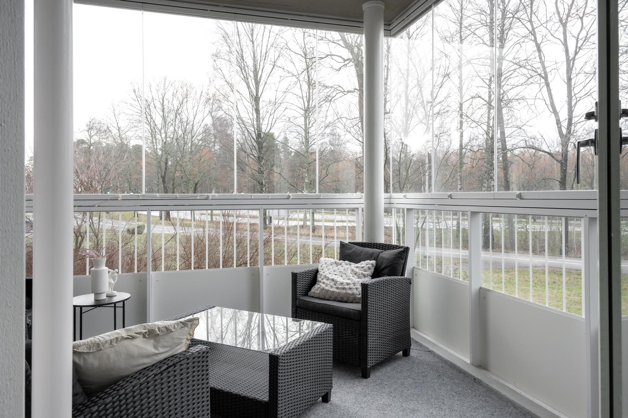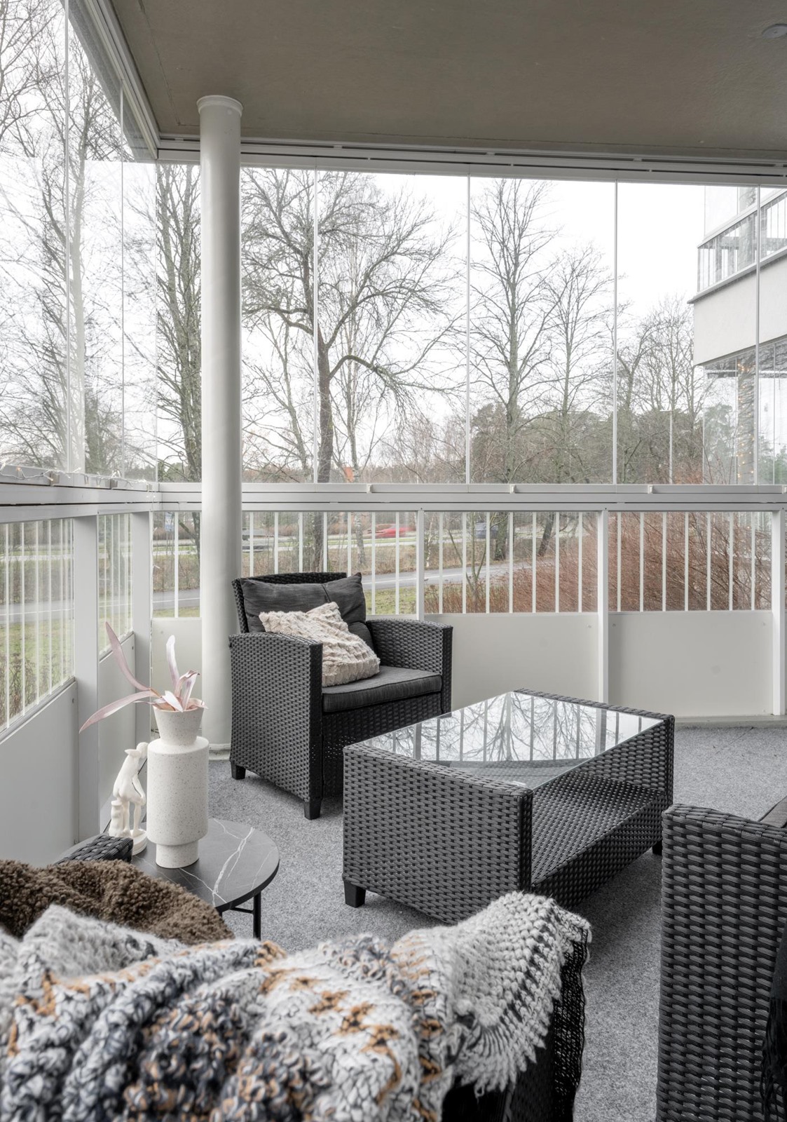 Asunnon kruunaa reilun kokoinen, noin 12,5 m² lasitettu parveke, täydellinen paikka nauttia arjen luksuksesta aikaisesta keväästä pitkälle syksyyn.