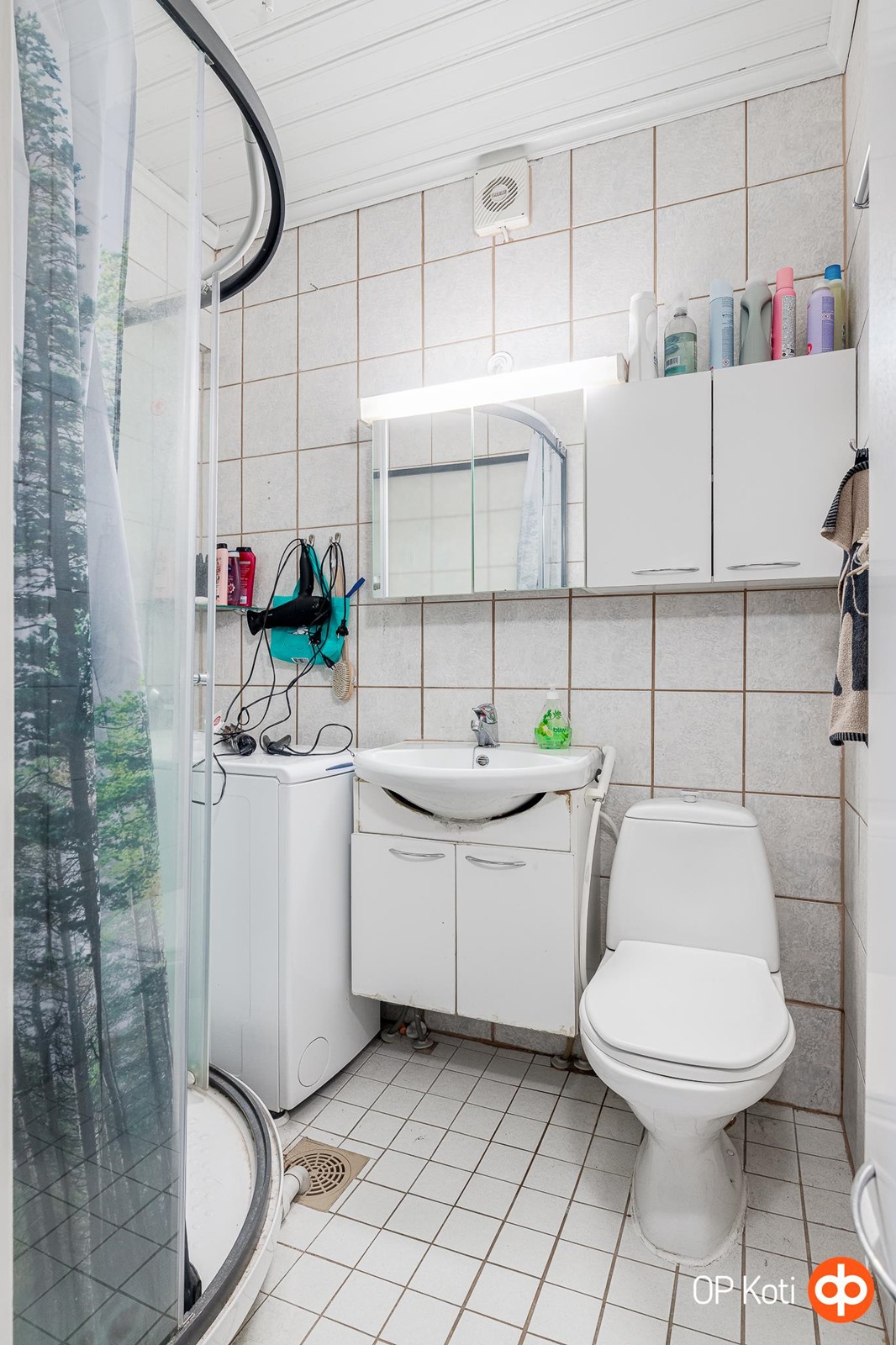 - Kylpyhuone, suihku, suihkukaappi, peilikaappi, allaskaappi, pesukoneliitäntä, kiinteät valaisimet.