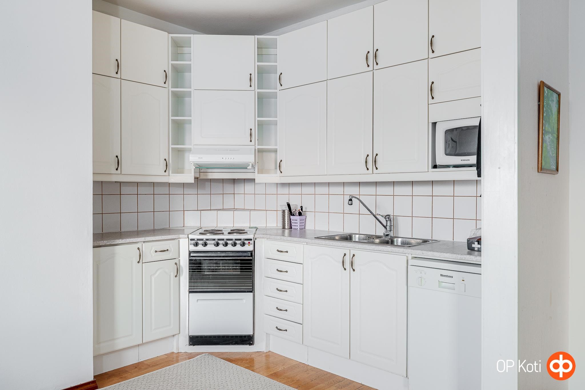 - Jääkaappipakastin, sähköliesi, liesituuletin, astianpesukone, kaapistot valkeat mdf-pintaiset ovet, kiinteät valaisimet.