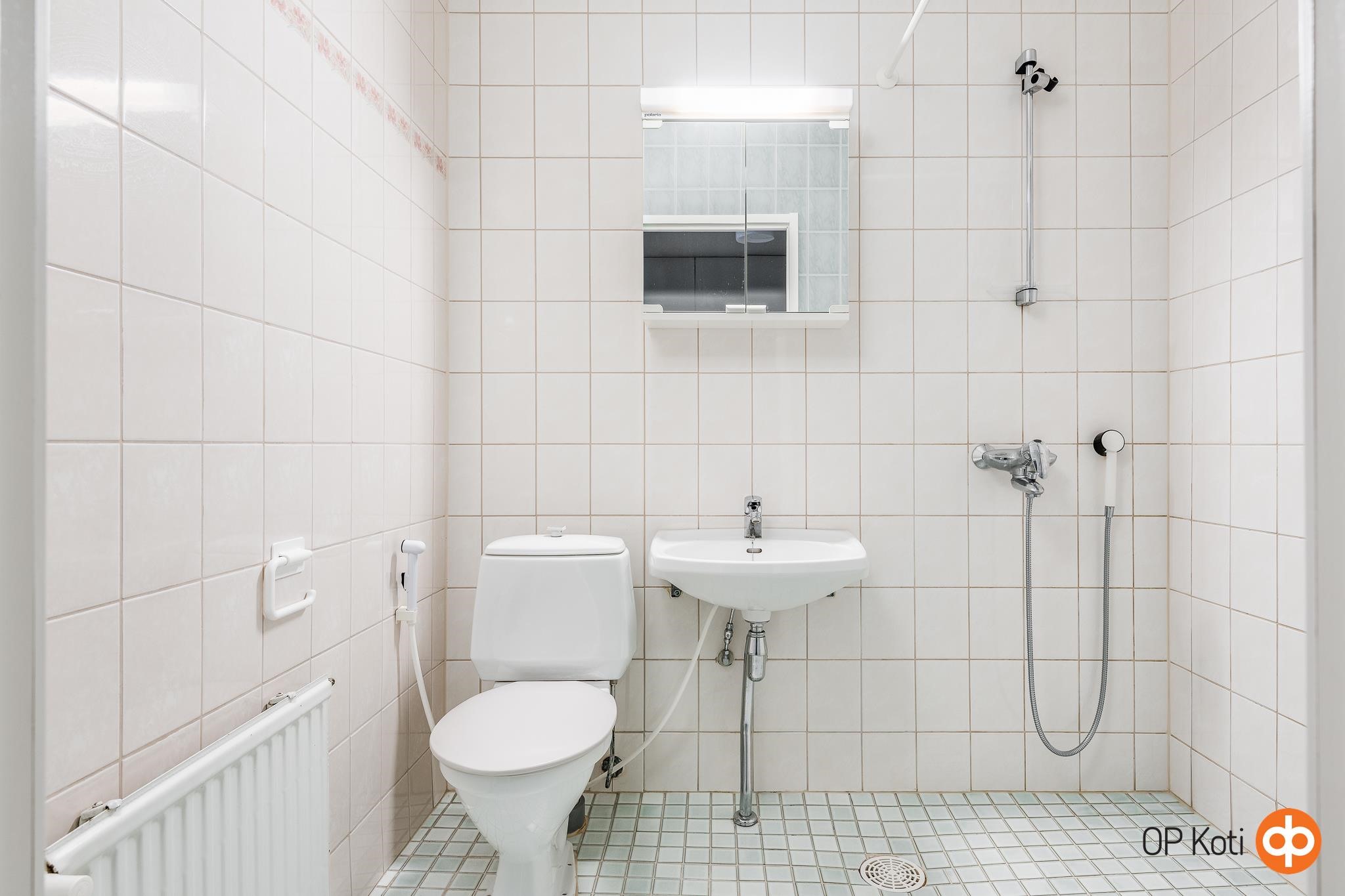 - Kylpyhuone, suihku, peilikaappi, pesukoneliitäntä, kiinteät valaisimet. Alkuperäinen kylpyhuone.