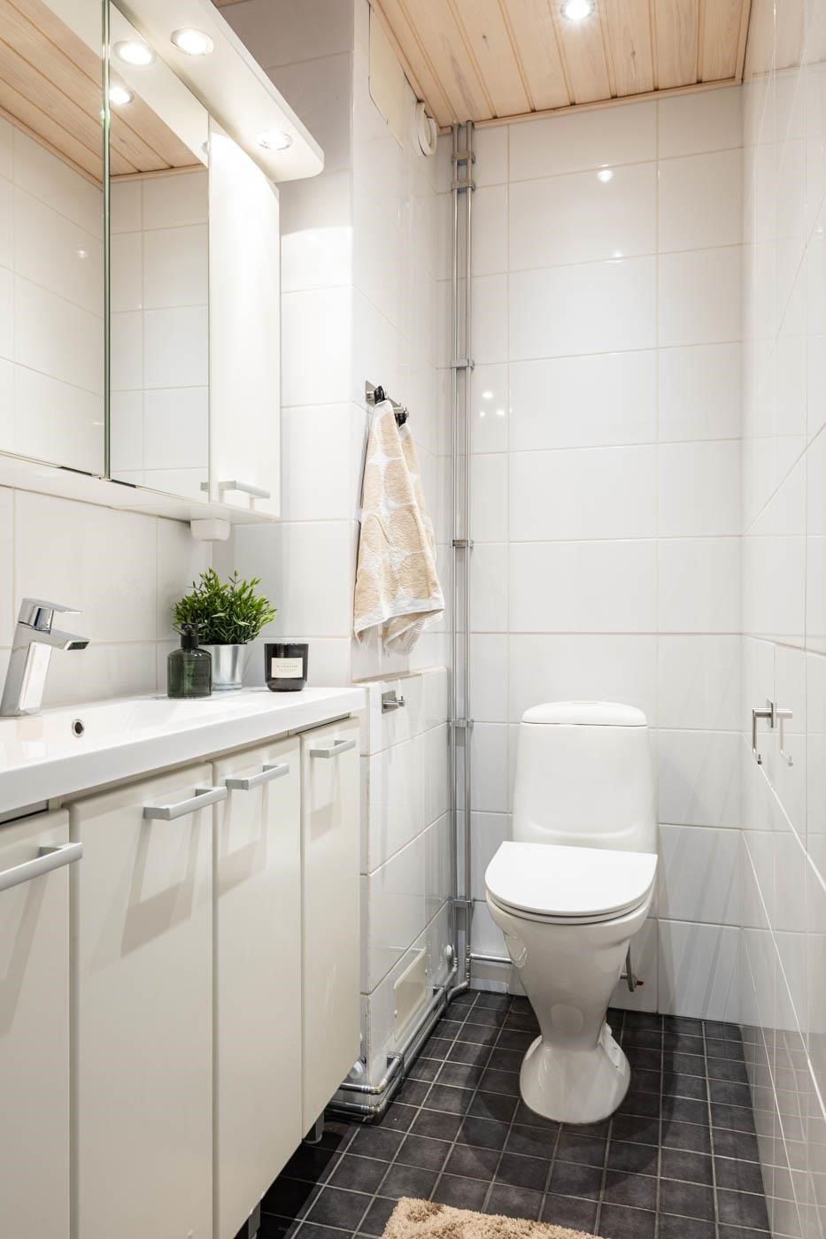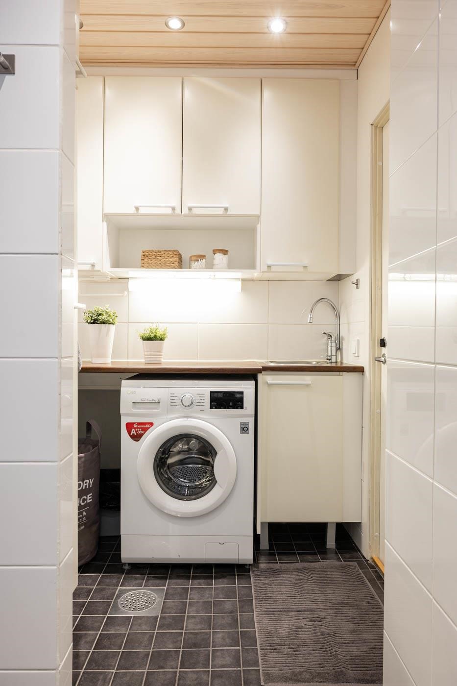 - Kylpyhuoneessa on kaksi suihkua. Saunassa on sähkökiuas. Kodinhoitohuonetilassa on kaapistot sekä pesukoneliitäntä. Erillisessä wc:ssä on allaskaappi sekä peilikaappi.