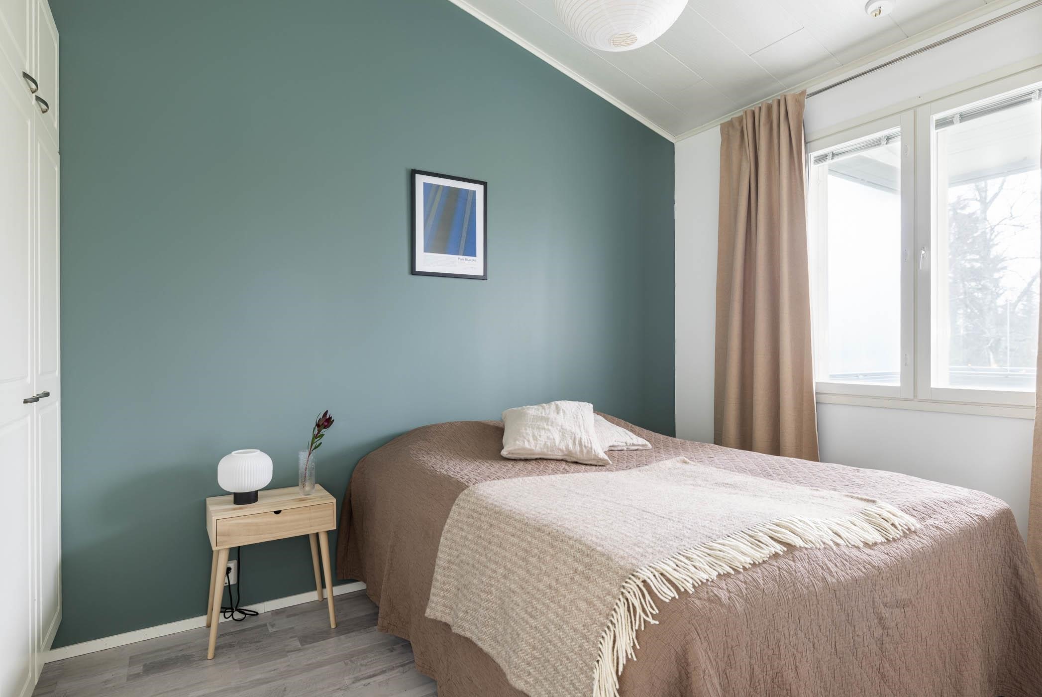 Keittiö: laminaatti, maali. Olohuone: laminaatti, maali. Makuuhuone: laminaatti, maali. Sauna: laatta, paneelit. Kylpyhuone: laatta, laatta. Tuulikaappi: vinyyli, maali.