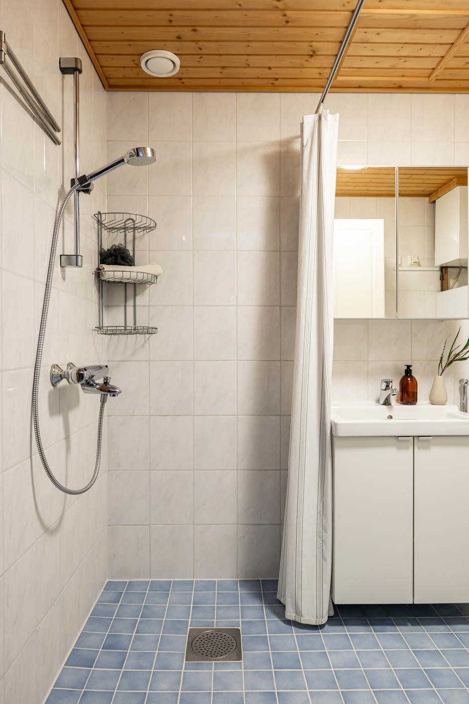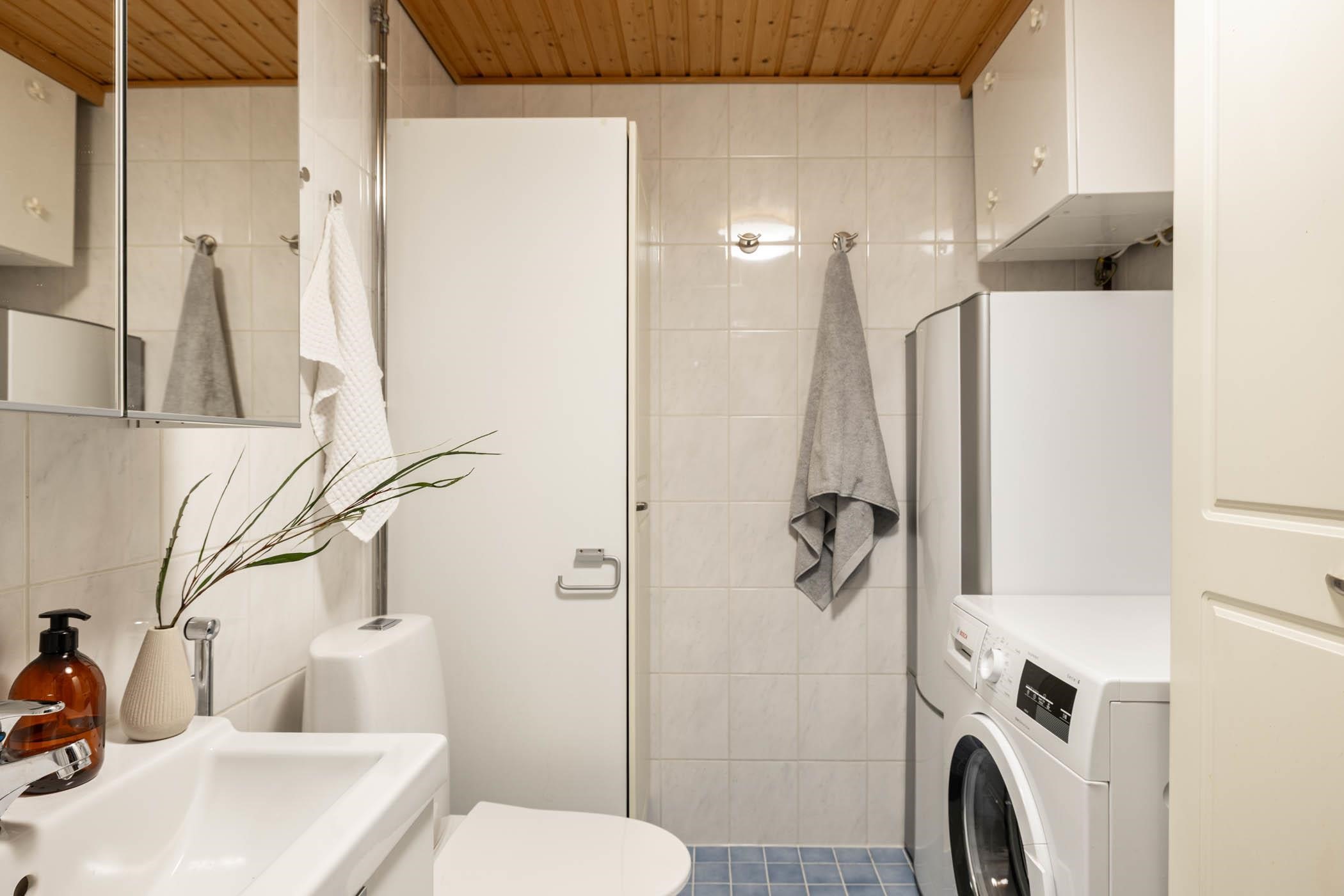 - Saunaassa sähkökiuas. Kylpyhuoneessa suihku, peilikaappi v.2019, allaskaappi v.2019, pesukoneliitäntä, lattialämmitys, kiinteät valaisimet.