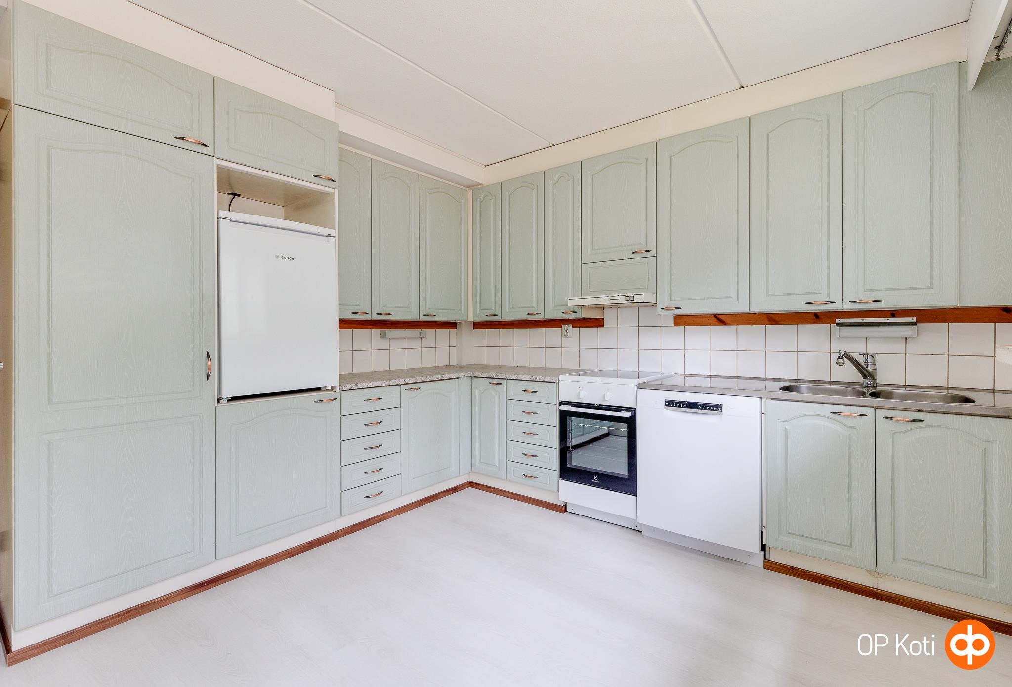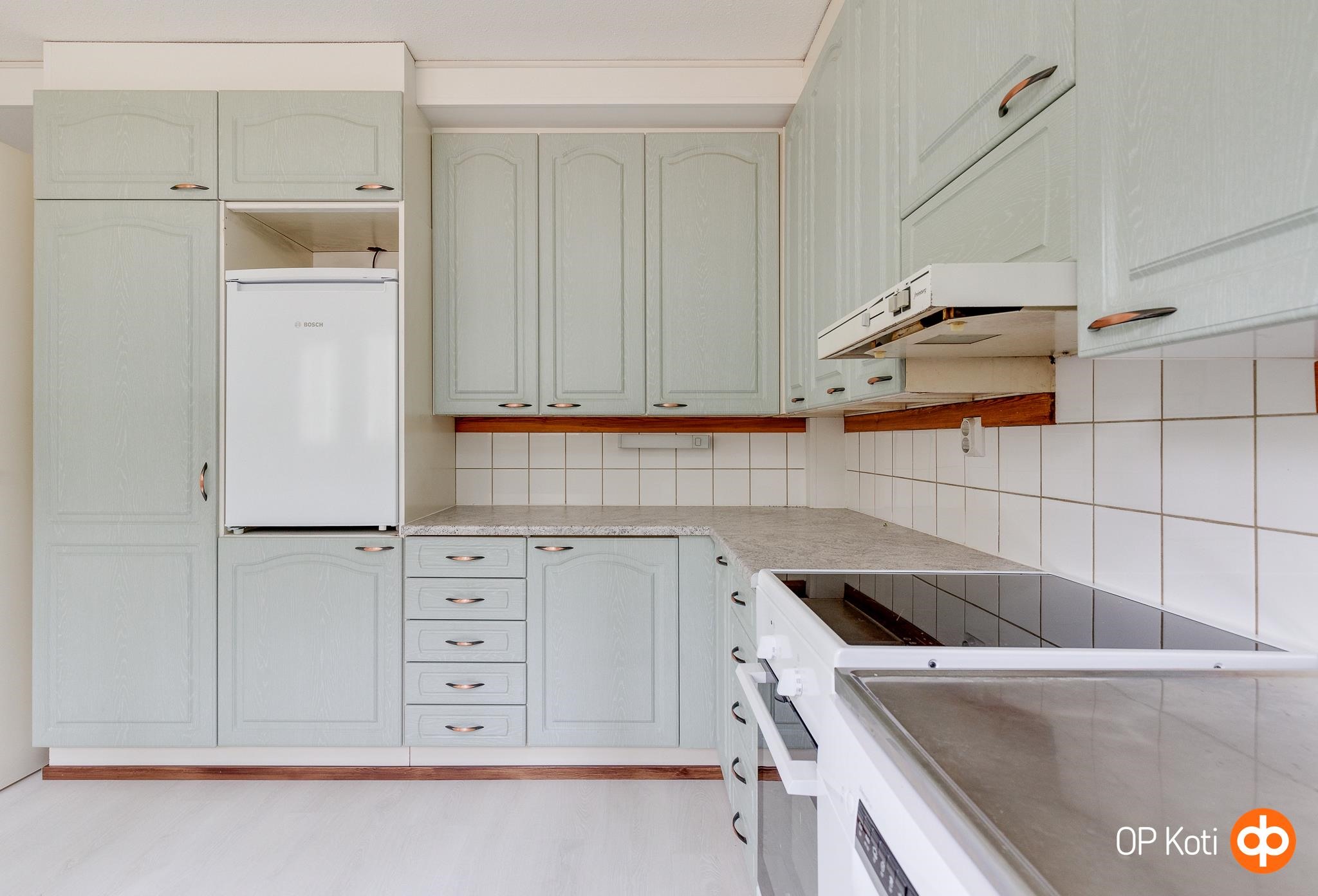- Jääkaappi, lattialiesi, induktioliesi, liesituuletin, astianpesukone, kaapistot, kiinteät valaisimet.