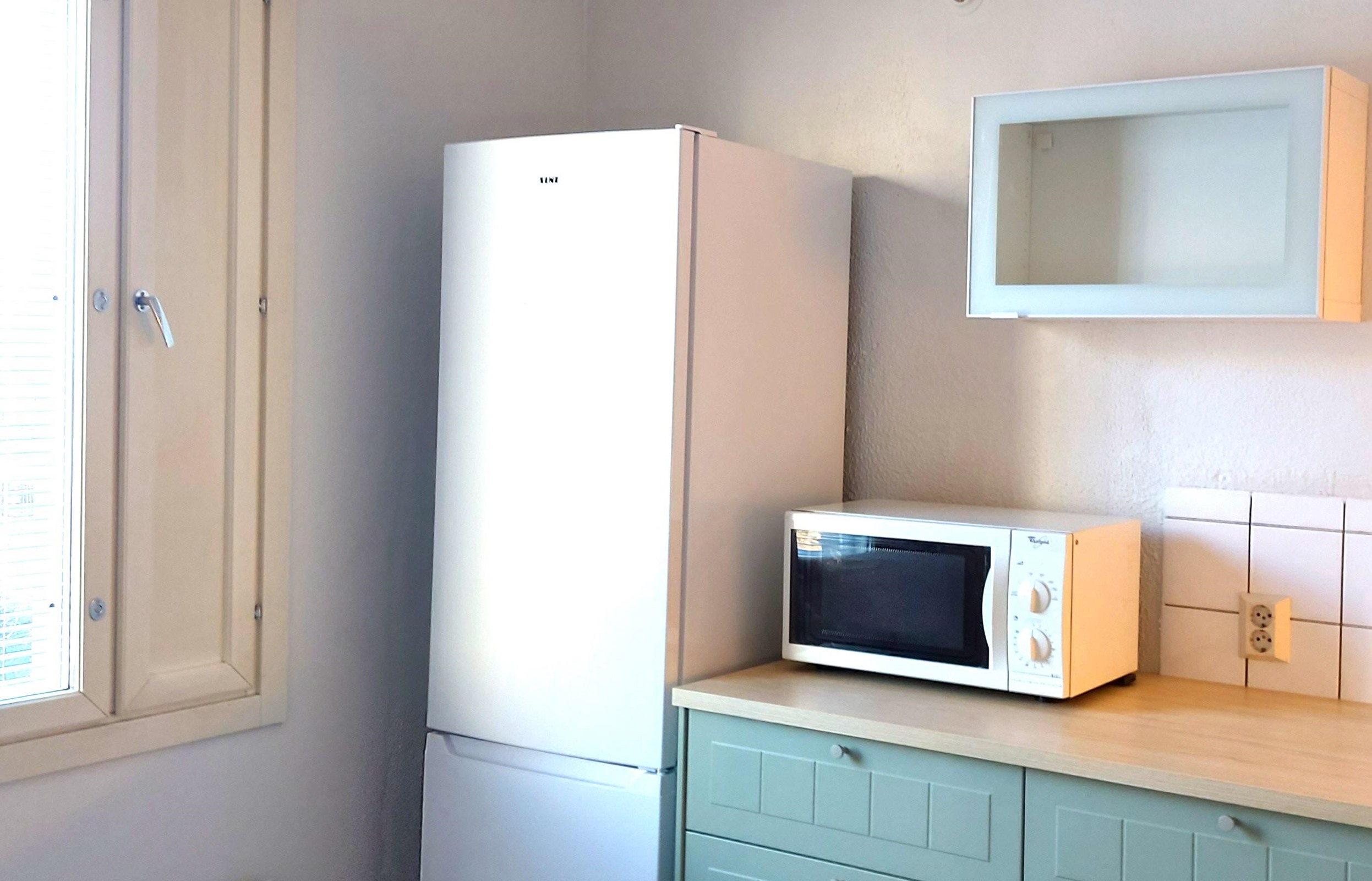 - Jääkaappipakastin, sähköliesi, mikroaaltouuni, astianpesukone, kaapistot.