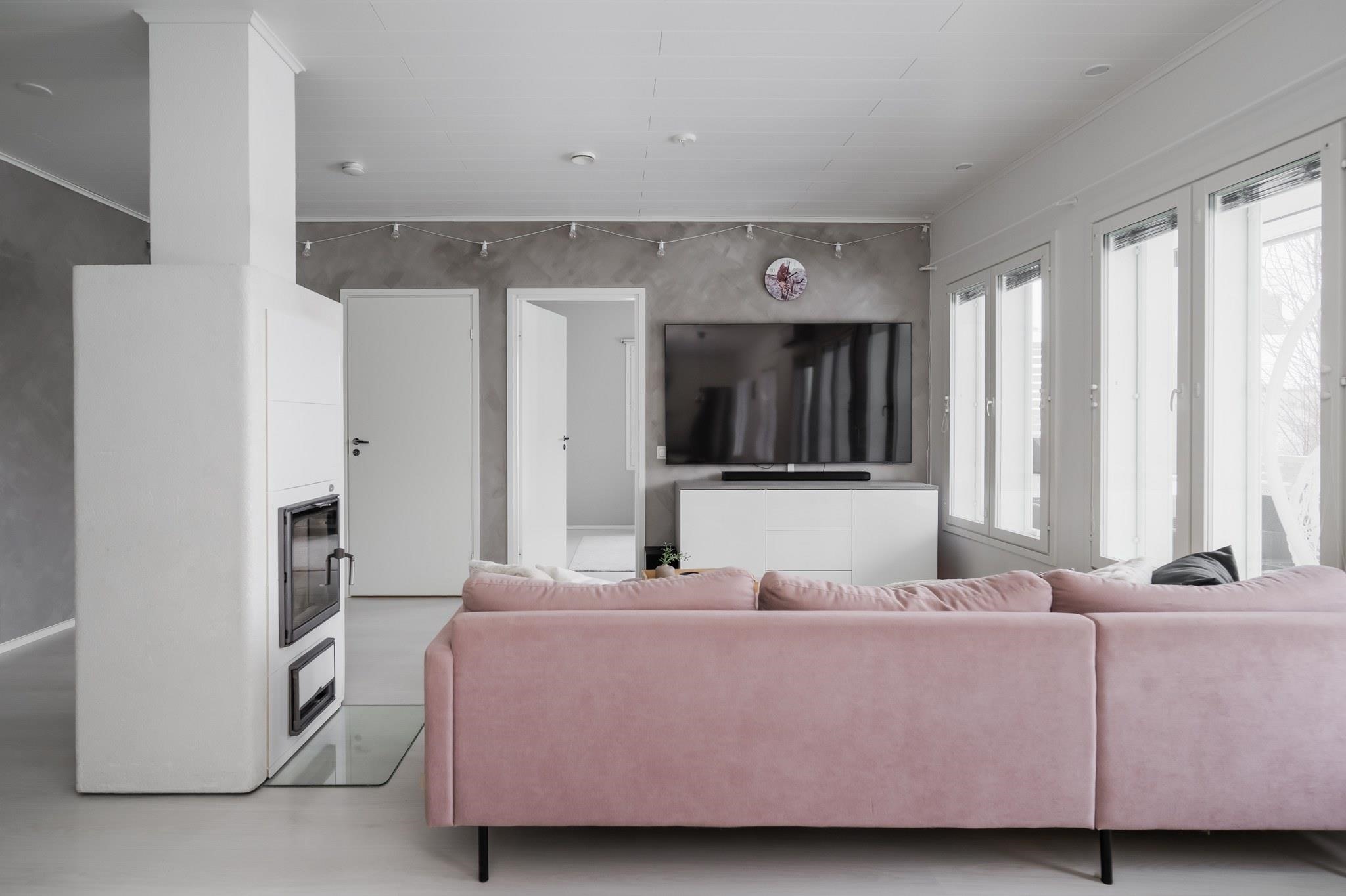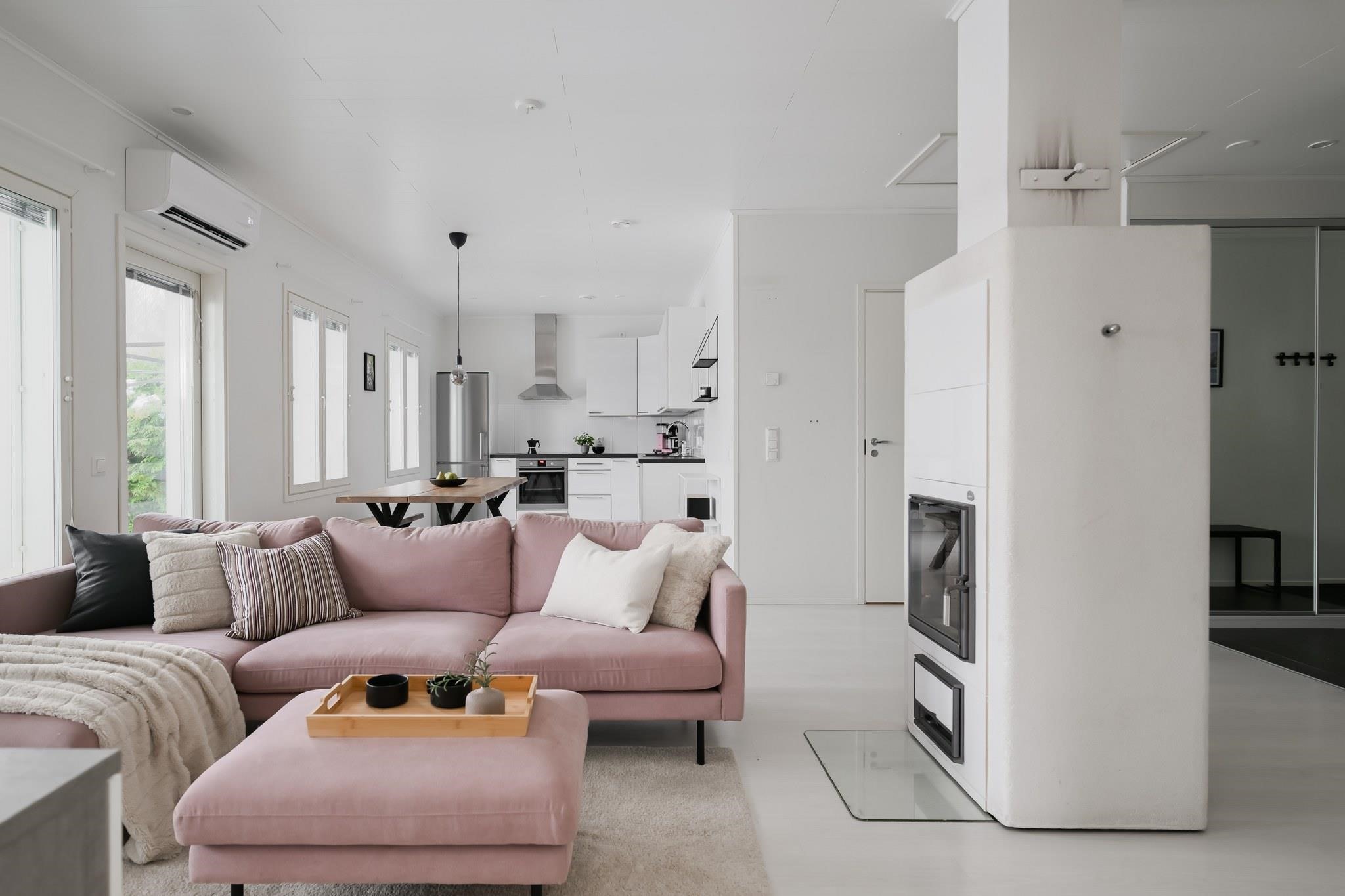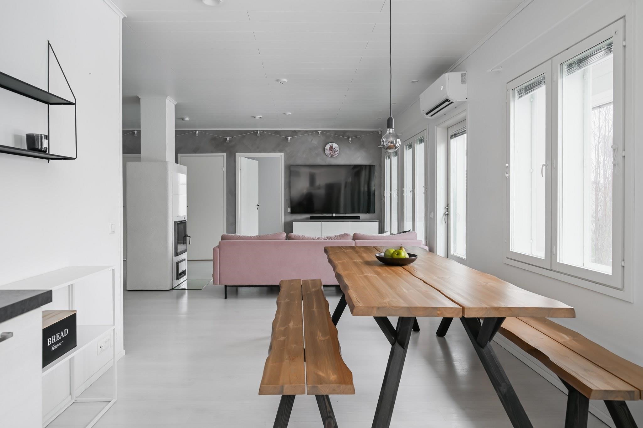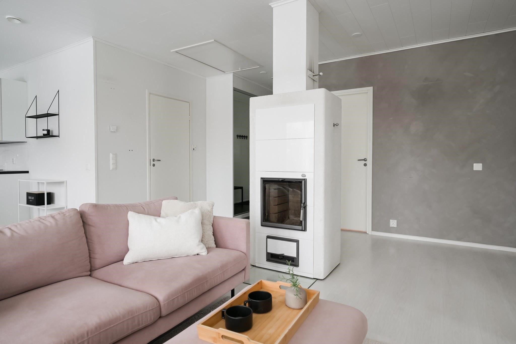 Tässä kodissa on kolme makuuhuonetta, valoisa olohuone, hyvin varusteltu keittiö ja kodinhoitohuone, joka tekee arjesta vaivatonta. Lattiat ovat laminaattia, ja keittiön sekä kylpyhuoneen pinnat ovat helppohoitoista laattaa. Varusteluun kuuluu induktioliesi, erillisuuni, astianpesukone ja jääkaappipakastin. Tunnelmaa luo varaava takka, ja ilmavesilämpöpumppu tuo energiatehokkuutta asumiseen. Koneellinen ilmanvaihto lämmön talteenotolla pitää sisäilman raikkaana.