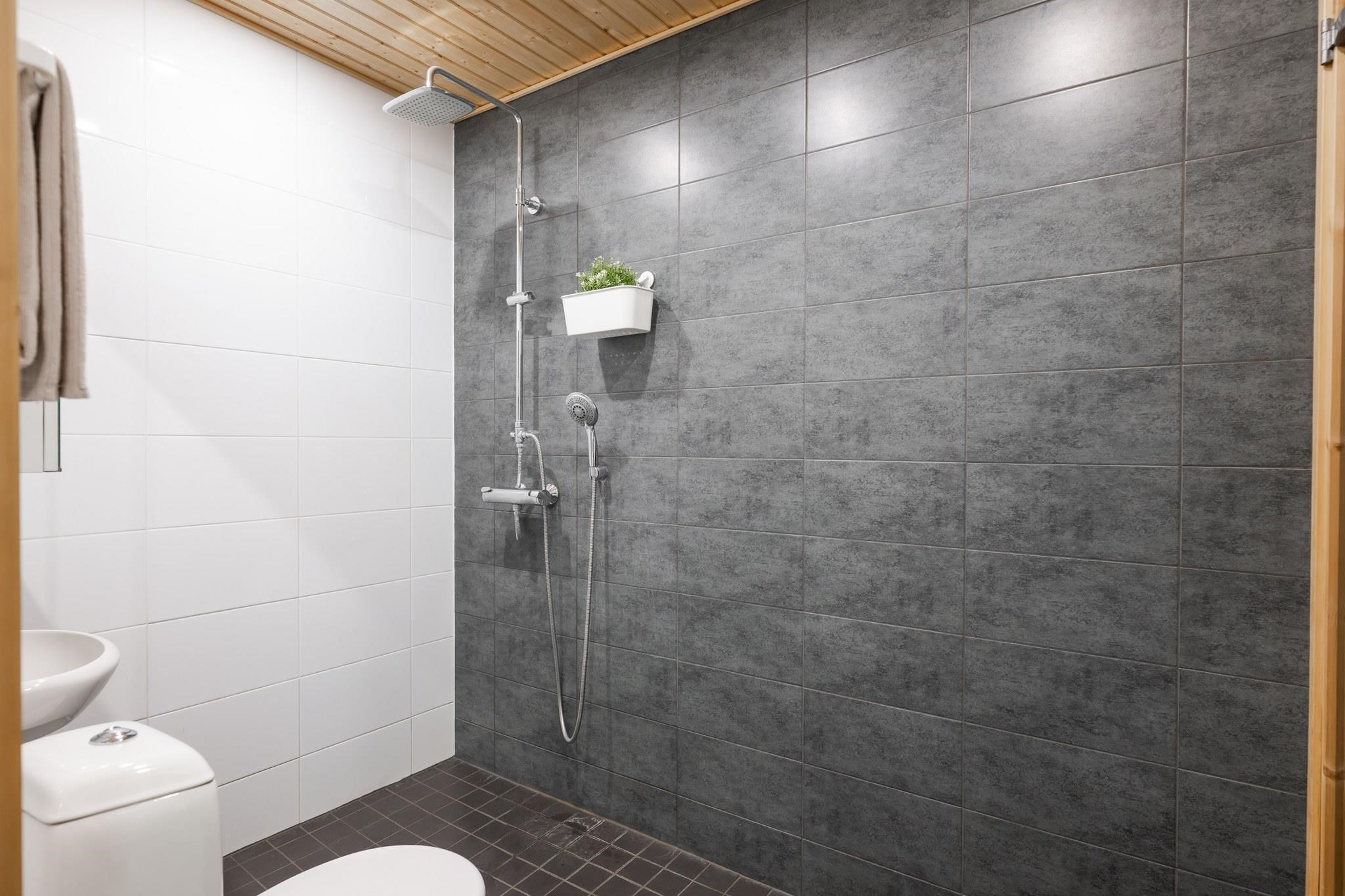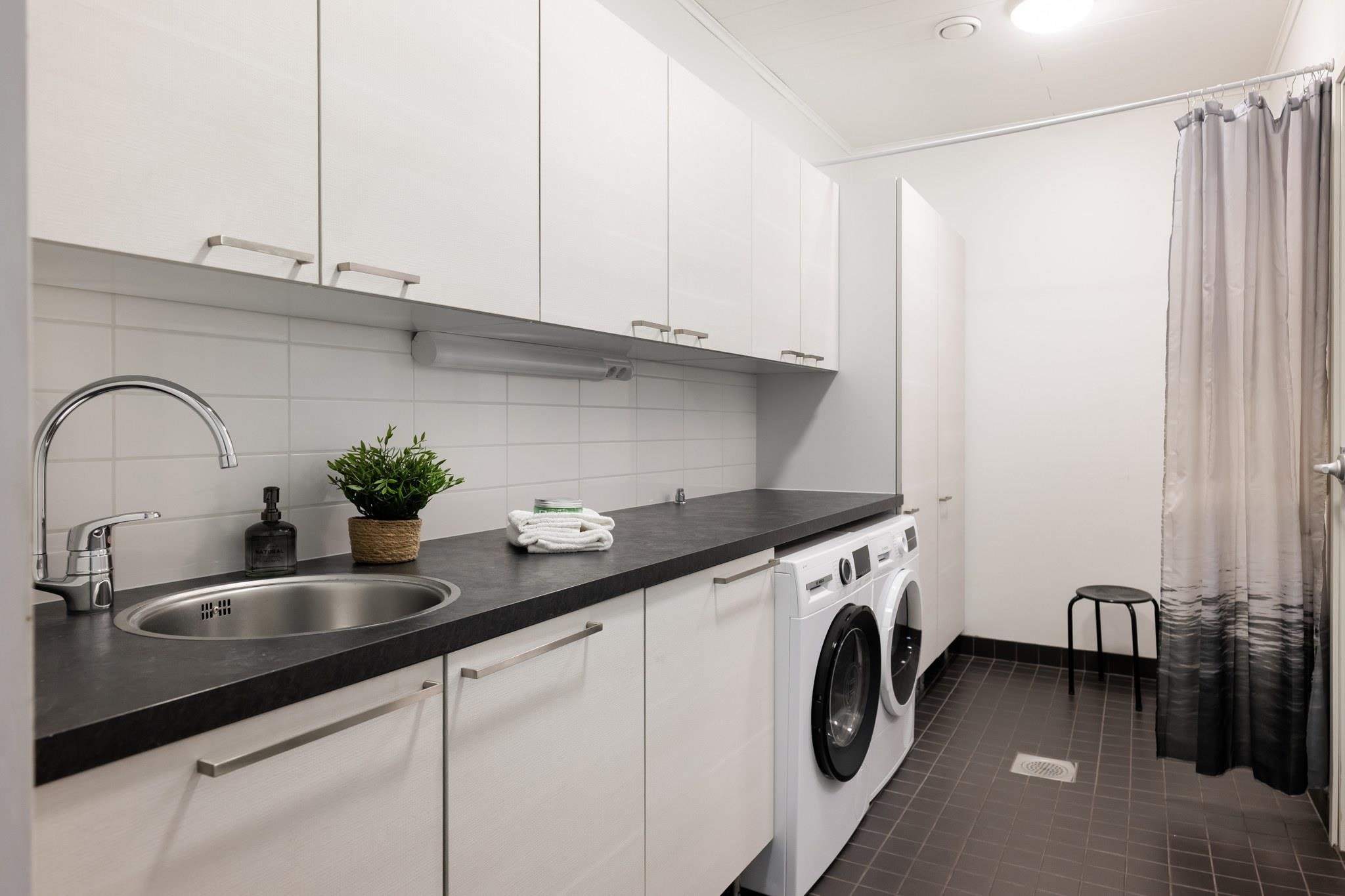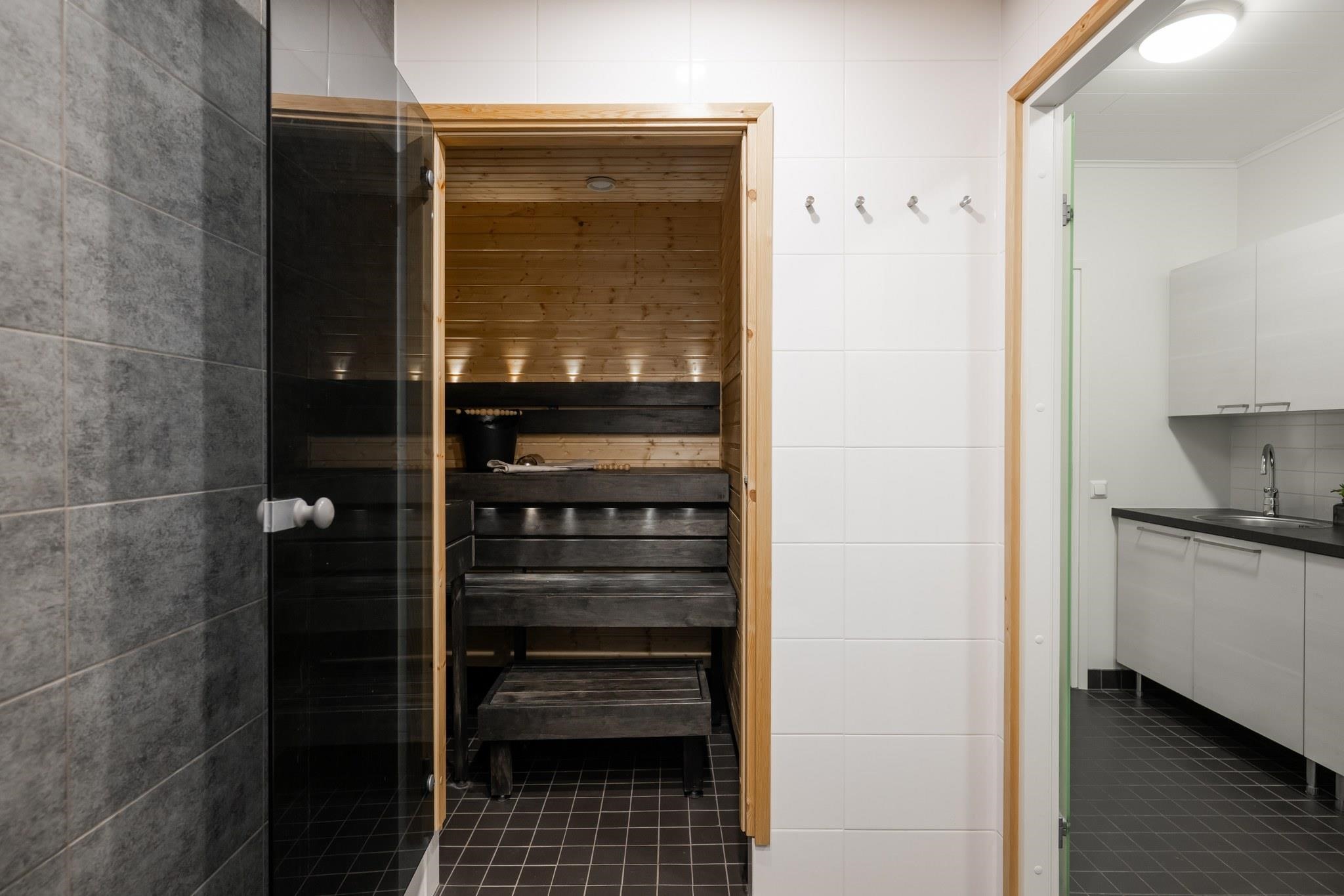- Sauna, sähkökiuas, kylpyhuone, erillinen wc, suihku, peilit, peilikaappi, kaapit, allaskaappi, pesukoneliitäntä (kodinhoitohuoneessa), lattialämmitys, kiinteät valaisimet.