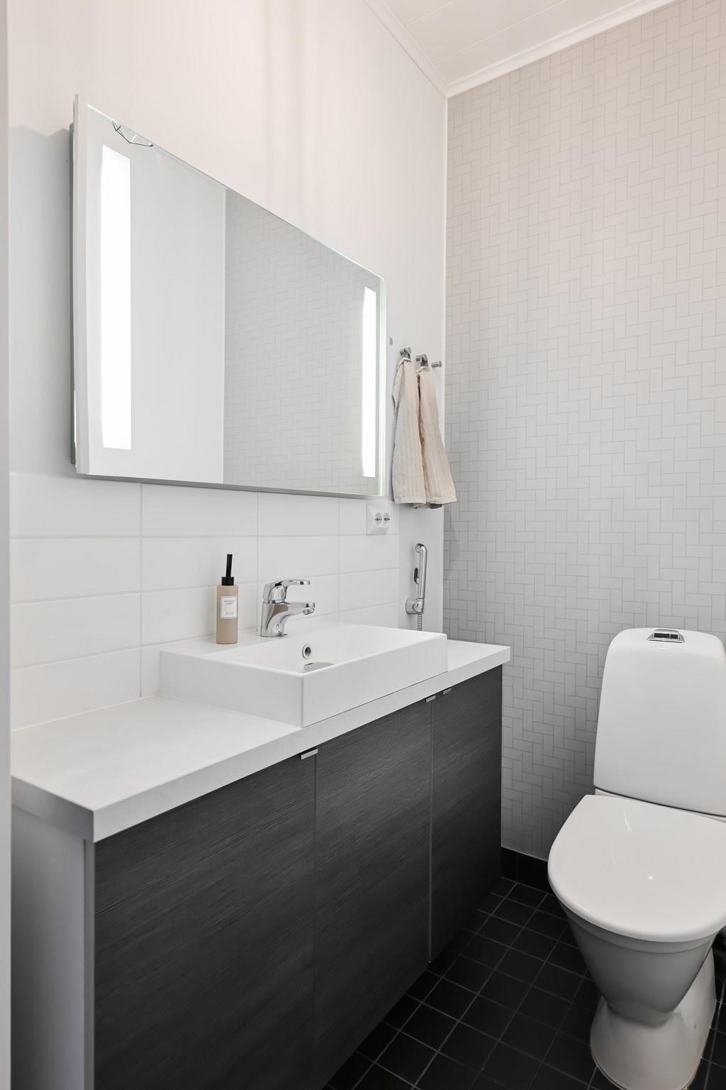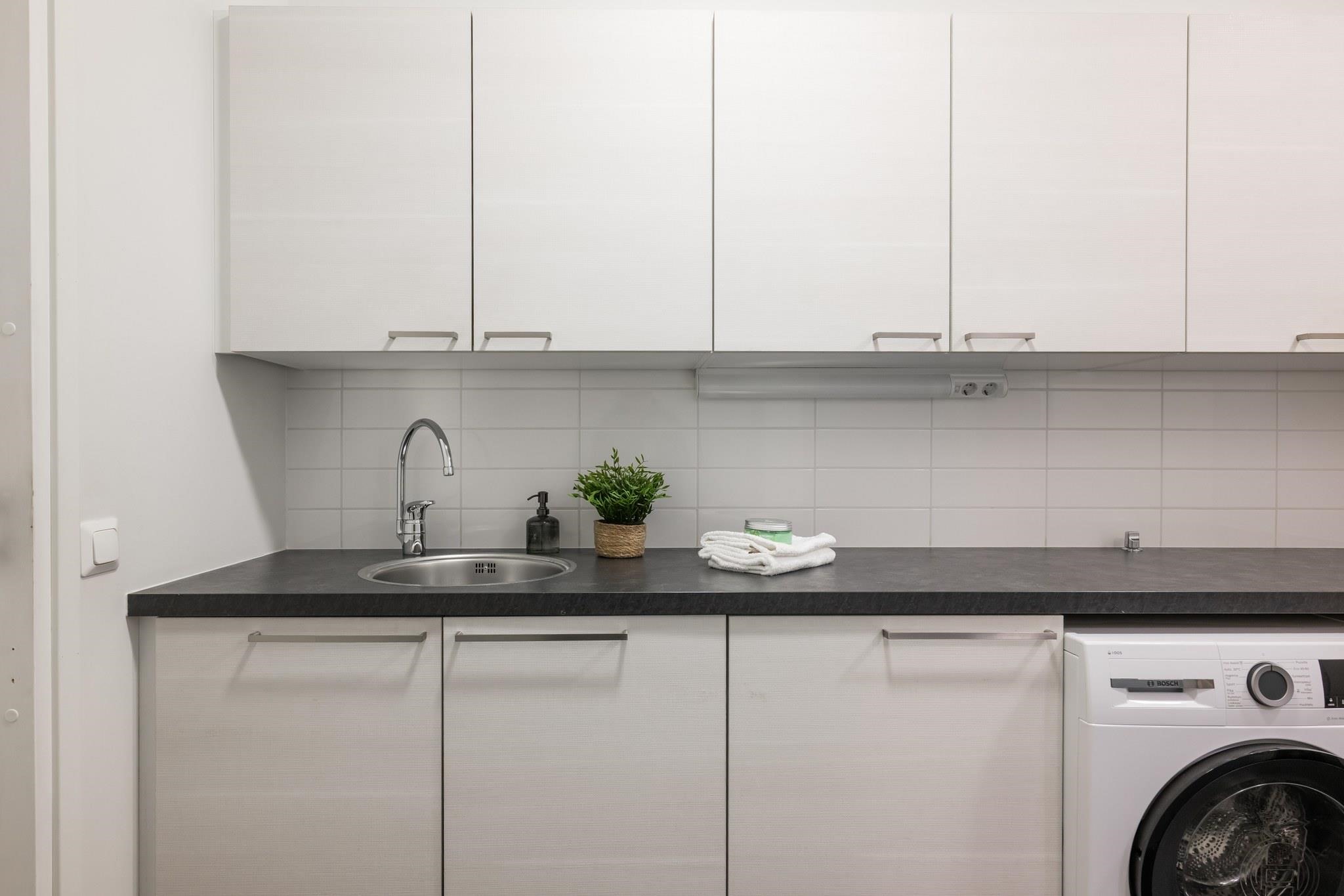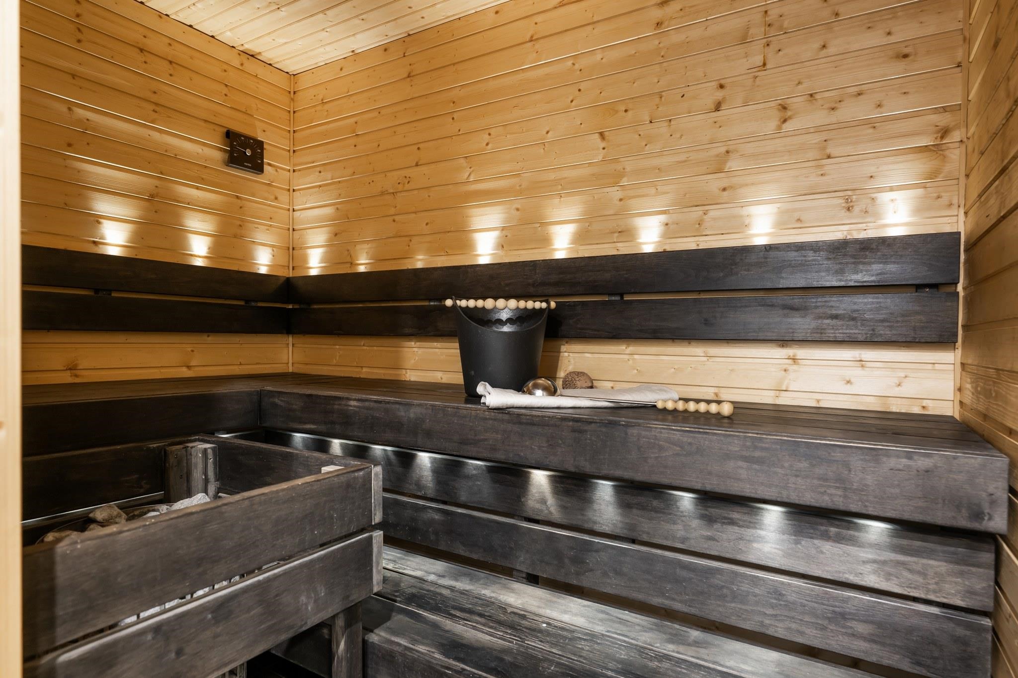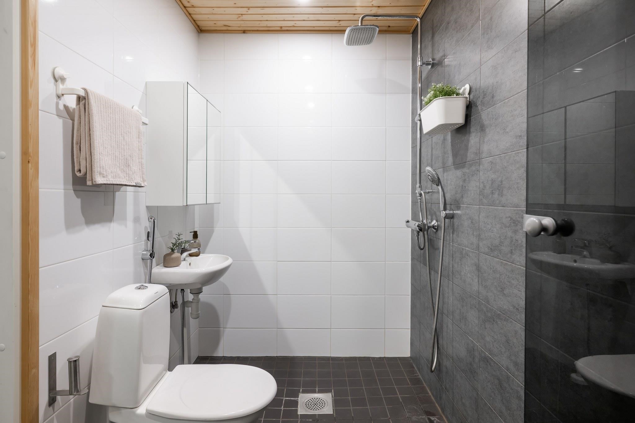 - Sauna, sähkökiuas, kylpyhuone, erillinen wc, suihku, peilit, peilikaappi, kaapit, allaskaappi, pesukoneliitäntä (kodinhoitohuoneessa), lattialämmitys, kiinteät valaisimet.