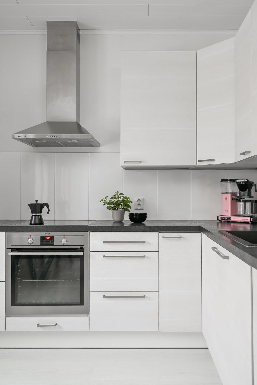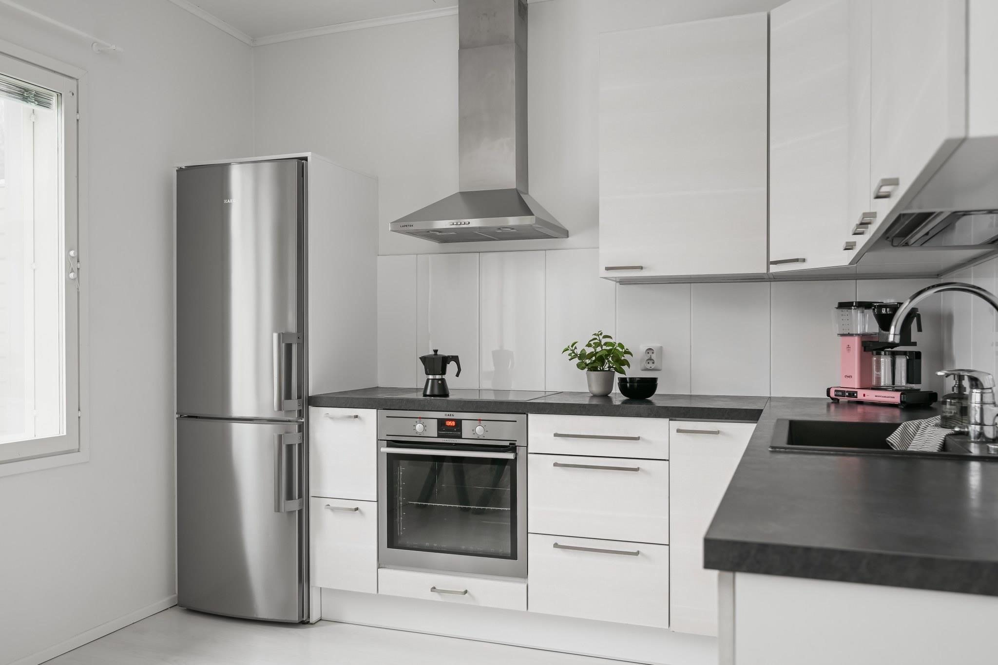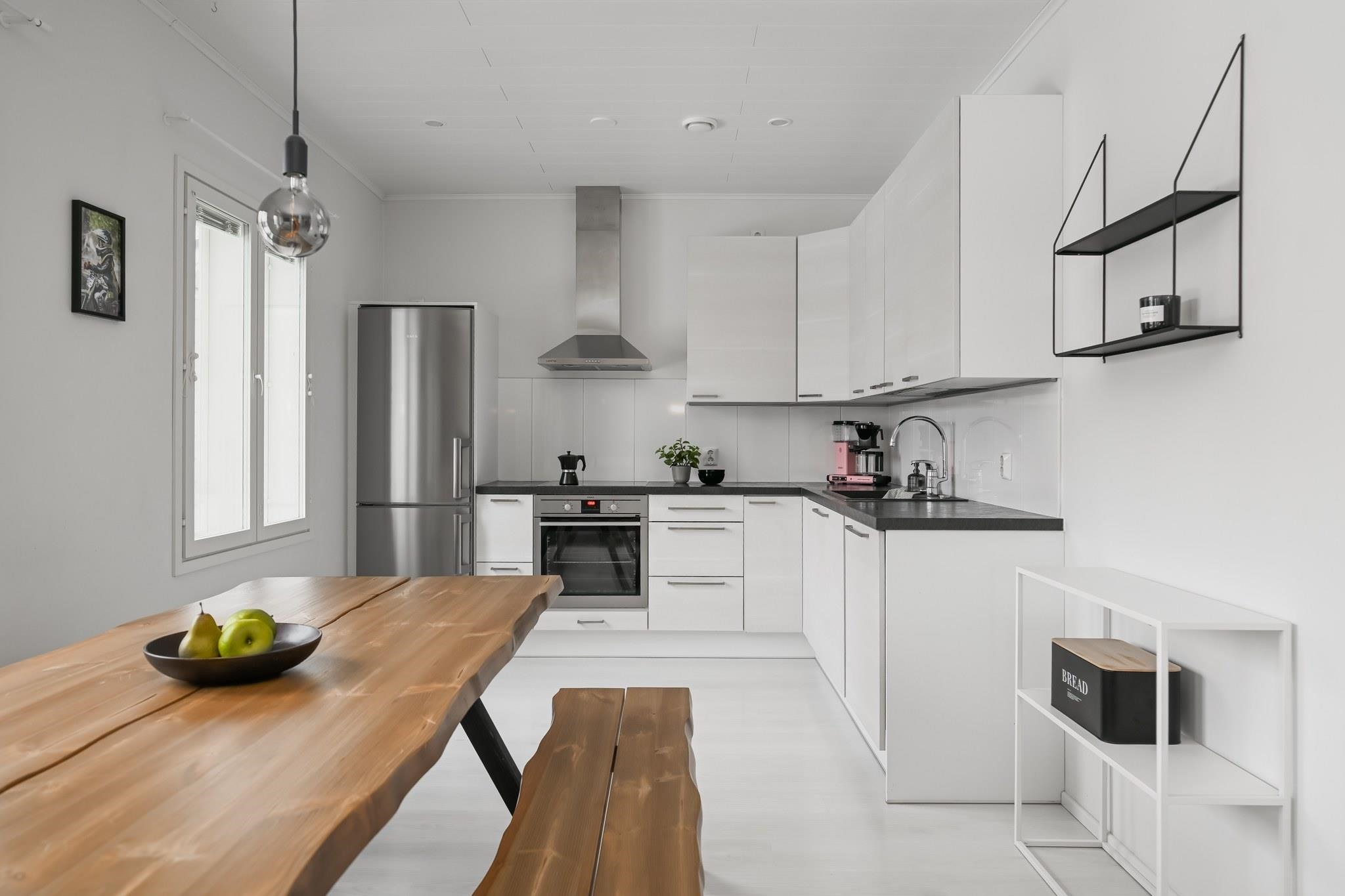 - Jääkaappipakastin, erillisuuni, induktioliesi, liesikupu (hormiin), astianpesukone, kaapistot, kiinteät valaisimet.