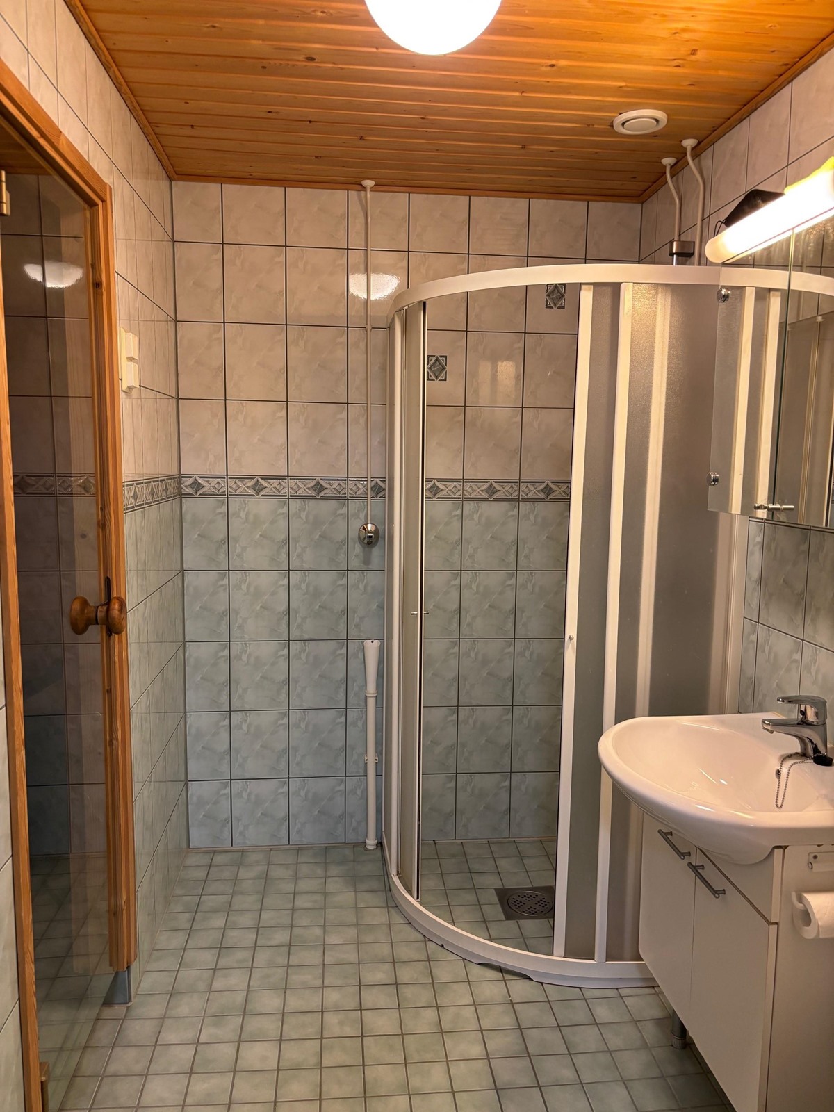 - Sauna, sähkökiuas, kylpyhuone, suihku, suihkuseinä, peilikaappi, allaskaappi, pesukoneliitäntä, lattialämmitys, kiinteät valaisimet.