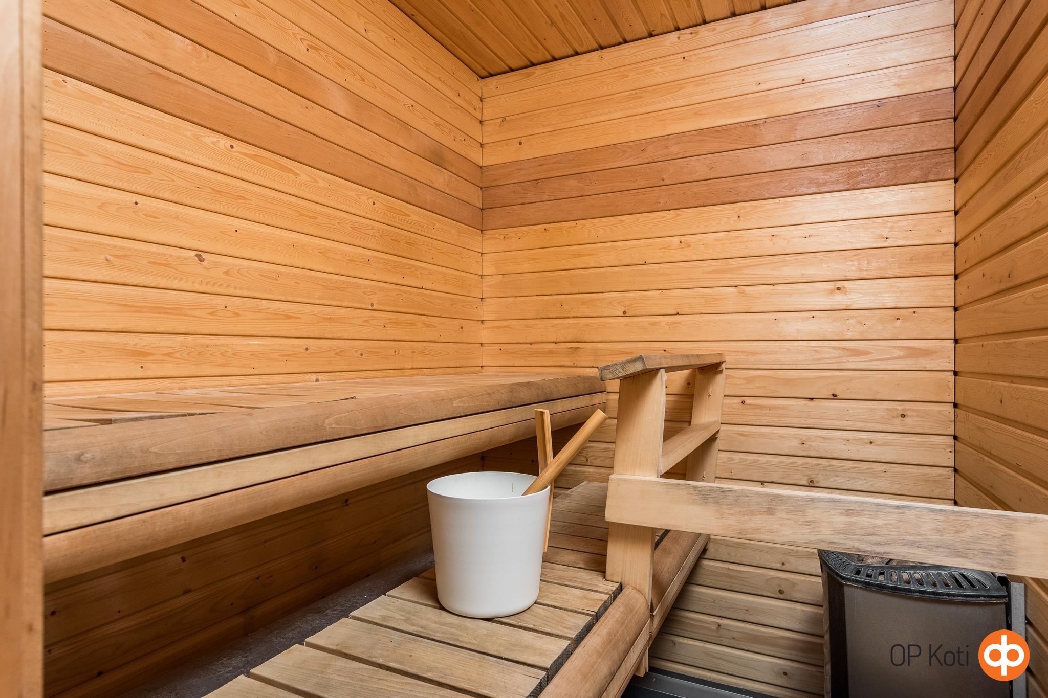 - Sauna, sähkökiuas, kylpyhuone, erillinen wc, suihku, peilit, peilikaappi, kaapit, allaskaappi, pesukoneliitäntä, kiinteät valaisimet. KPH, patterilämmitys