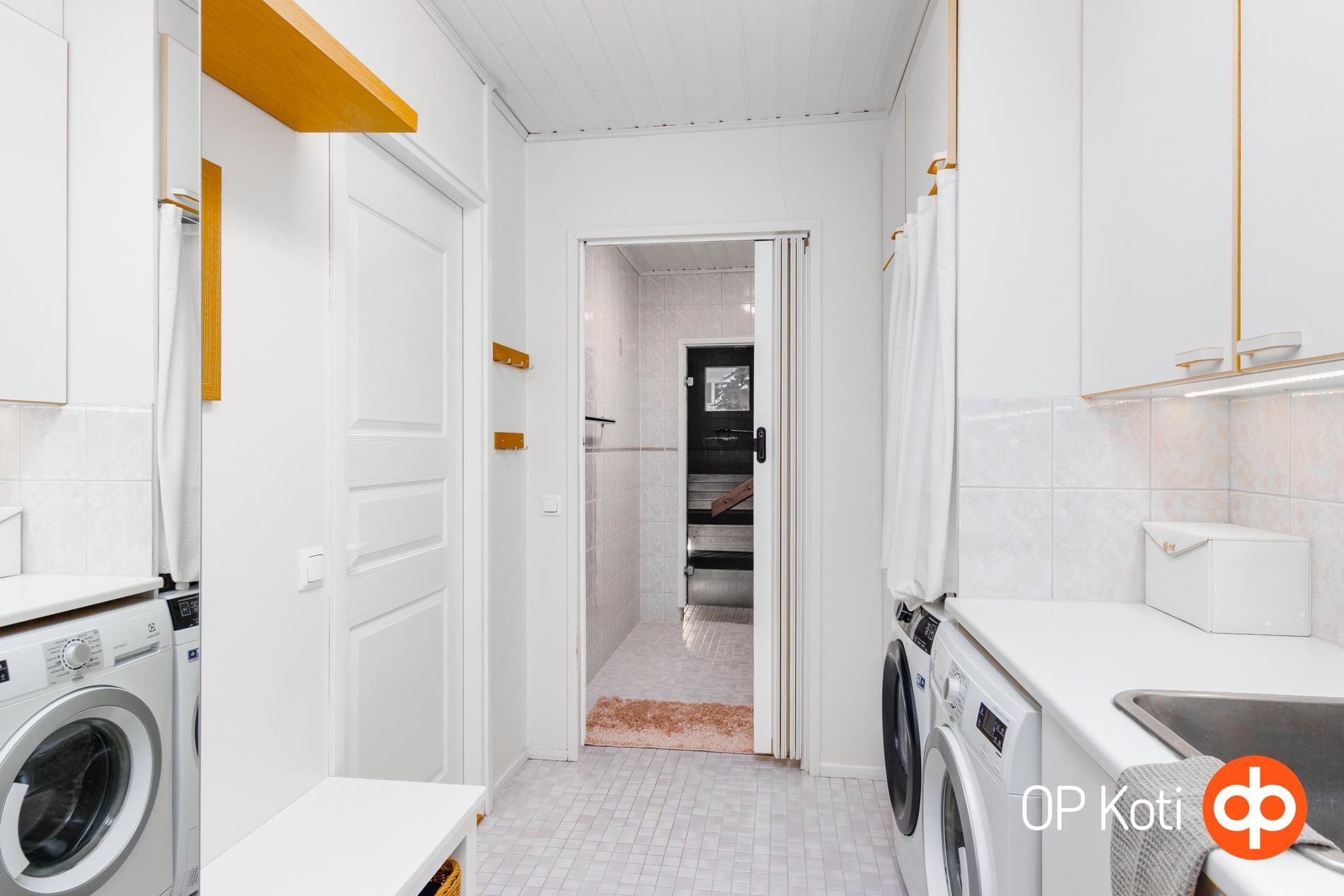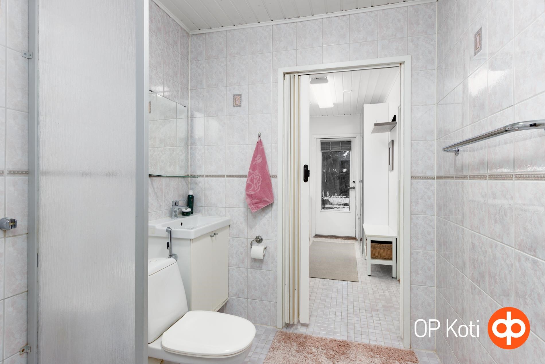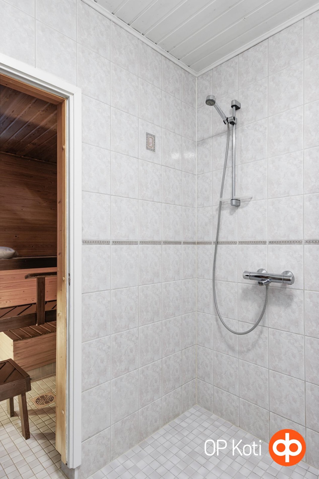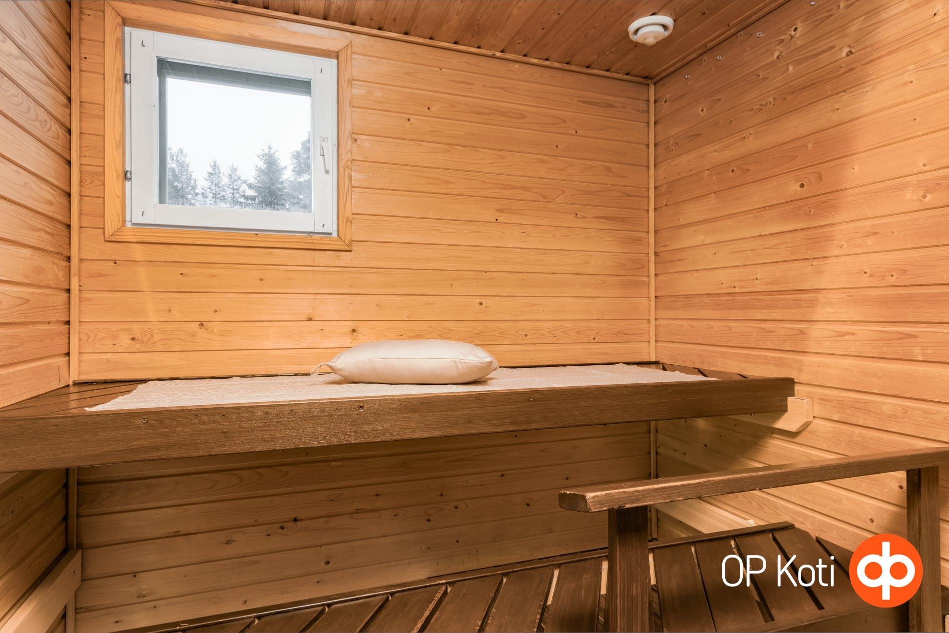 - Sauna, sähkökiuas, kylpyhuone, erillinen wc, suihku, peilit, kaapit, allaskaappi, pesukoneliitäntä kodinhoitohuoneessa, lattialämmitys, kiinteät valaisimet.