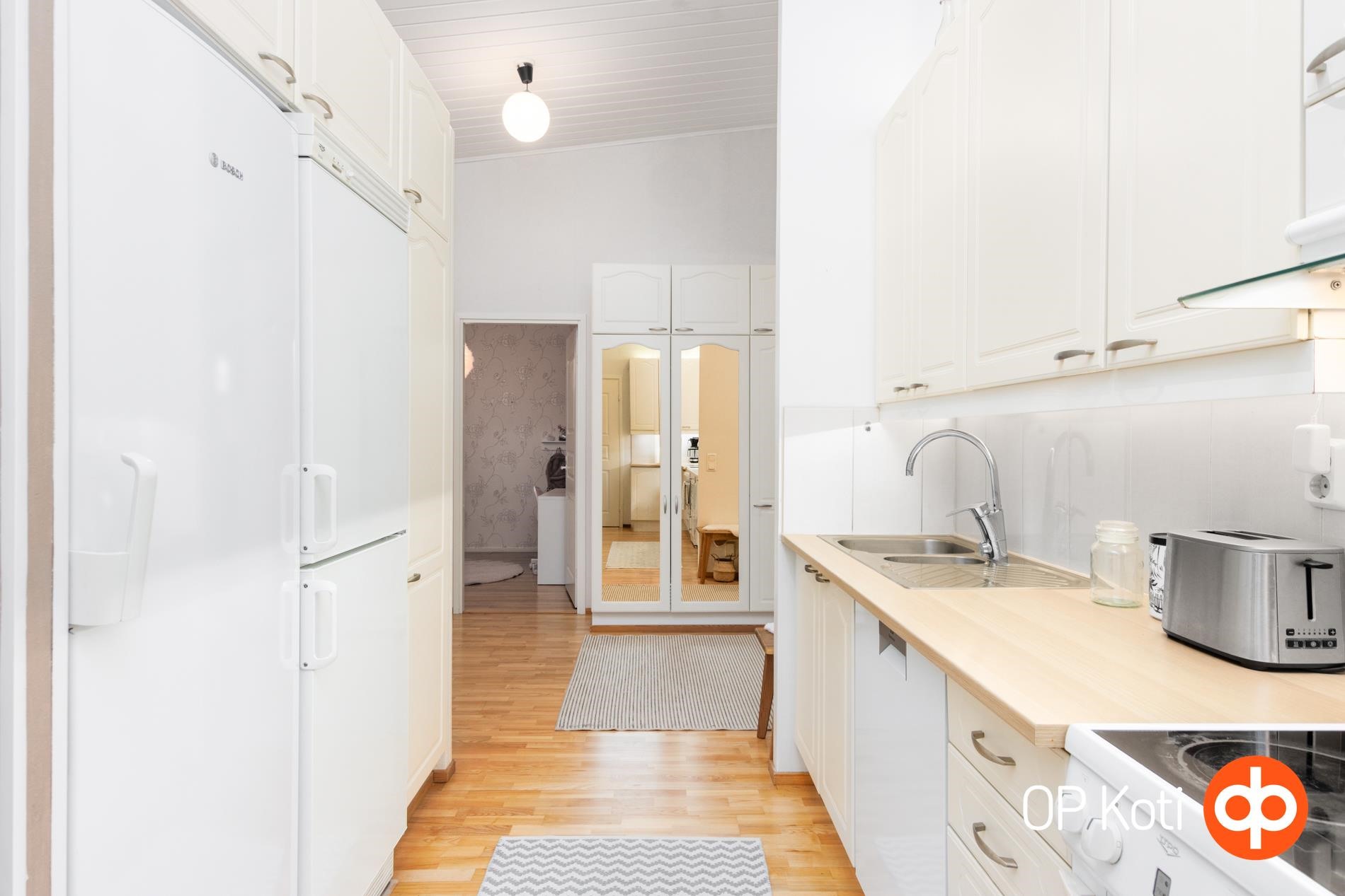 - Jääkaappi, pakastekaappi, keraaminen liesi, liesikupu, astianpesukone, kaapistot, kiinteät valaisimet.
