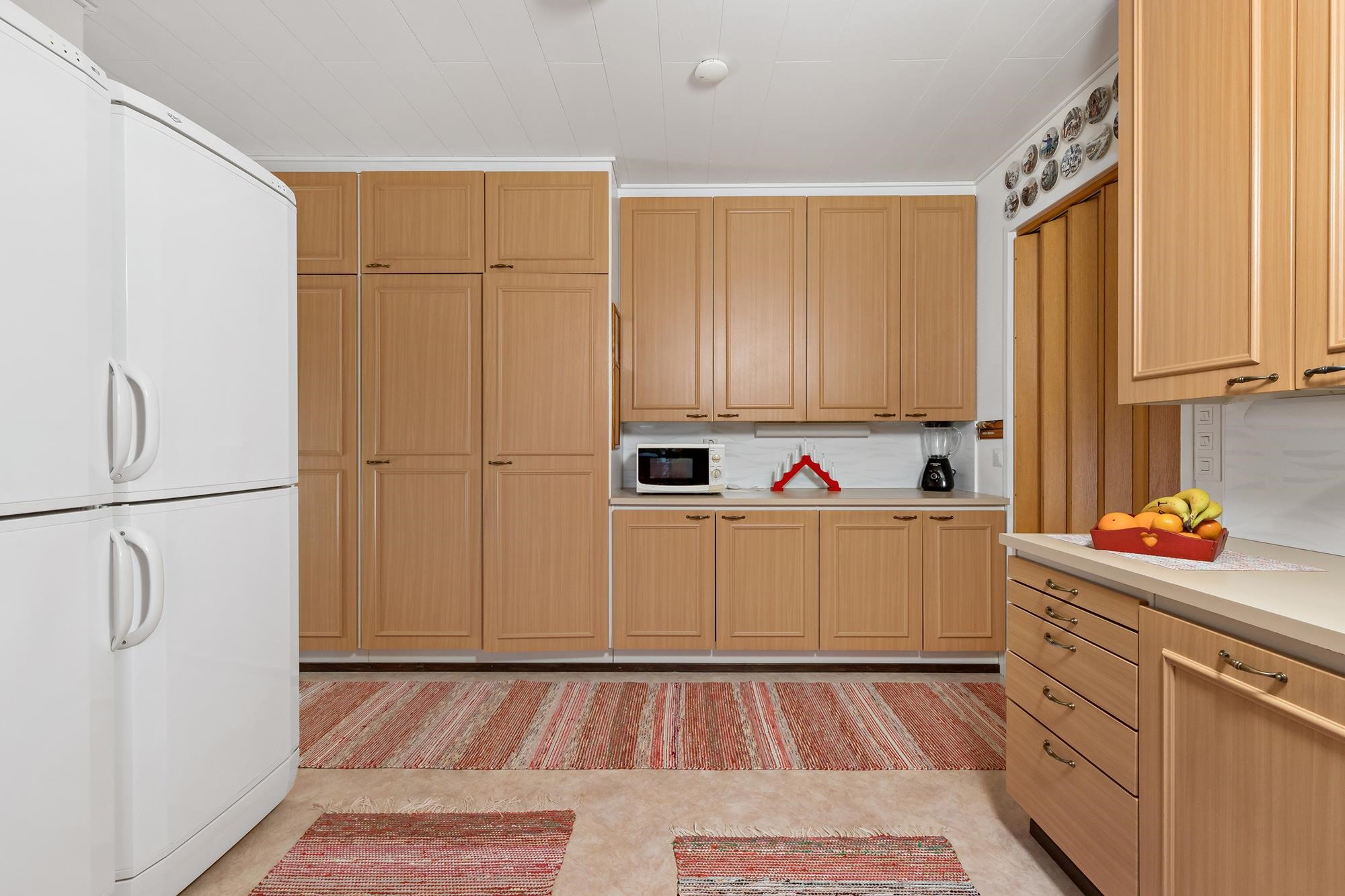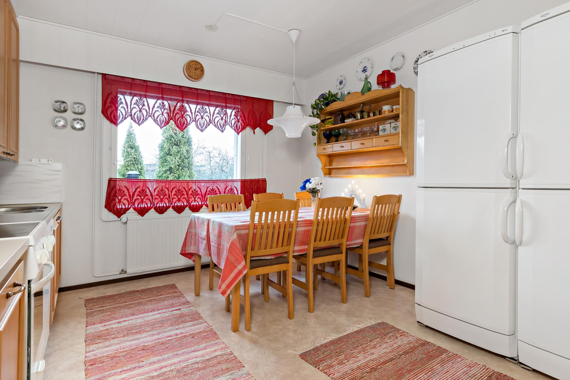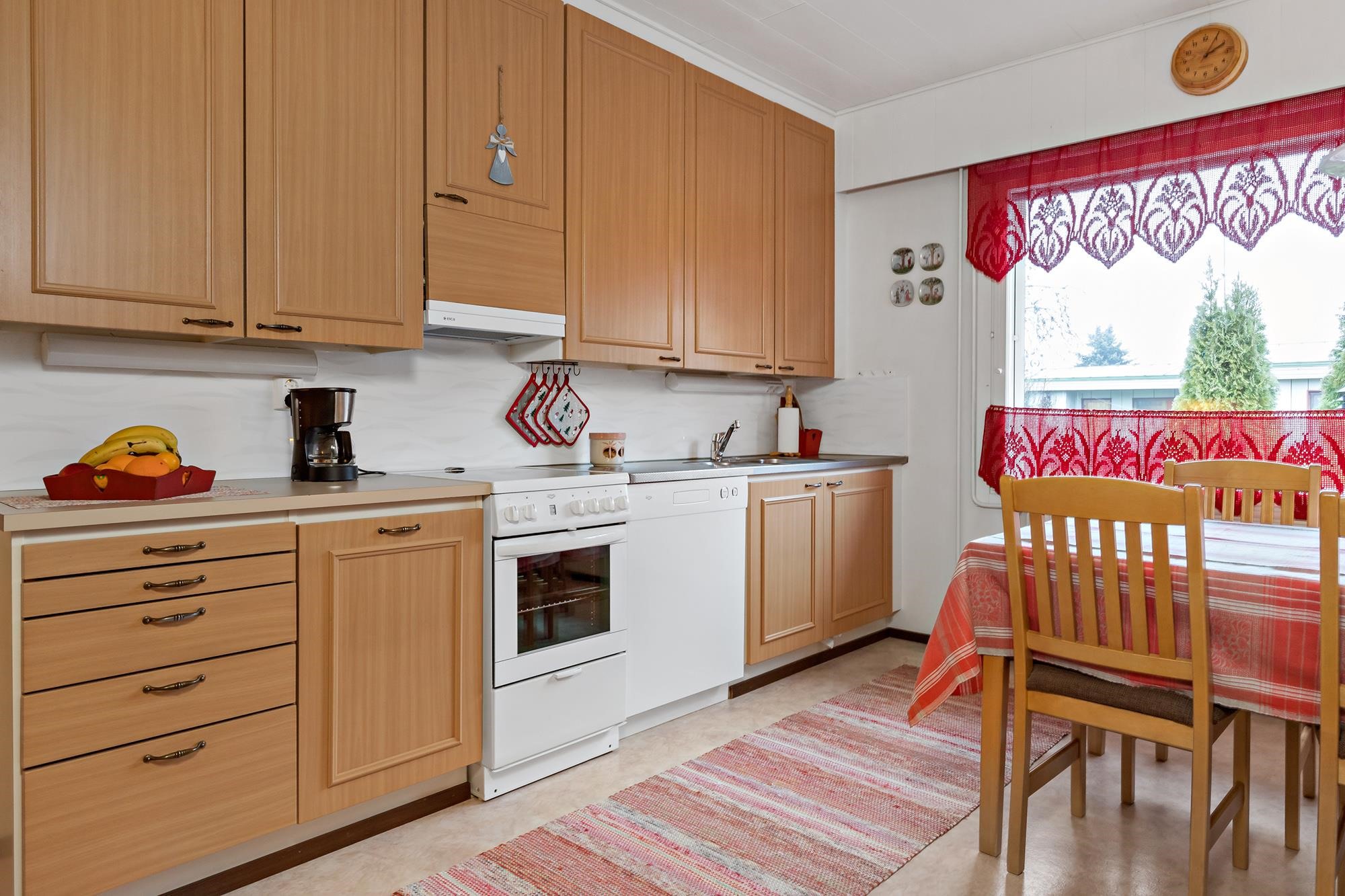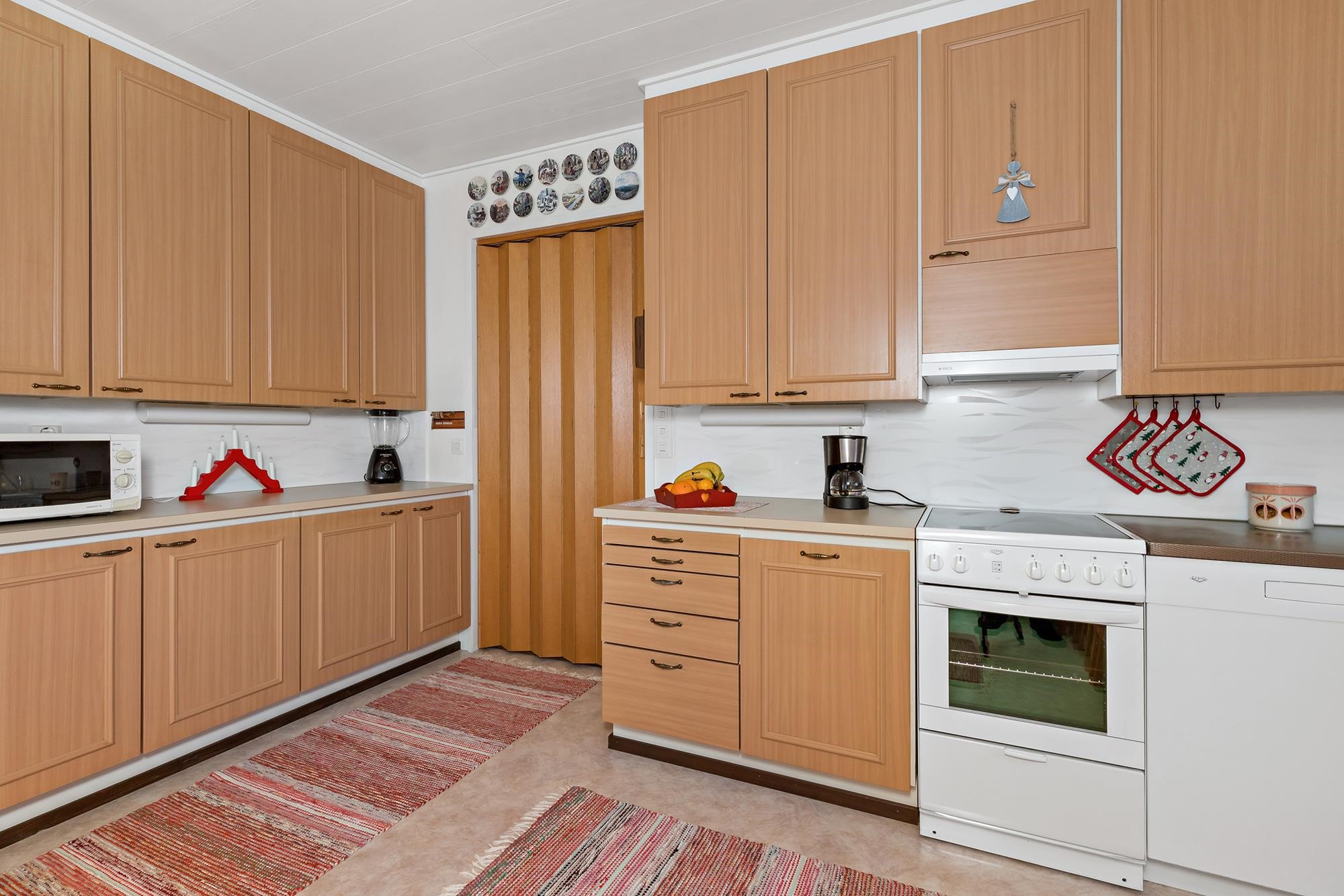 - Jääkaappi, jääkaappipakastin, keraaminen liesi, liesituuletin, leivinuuni takkahuoneessa, astianpesukone, kaapistot, kiinteät valaisimet, pöytätasojen materiaali laminaatti.